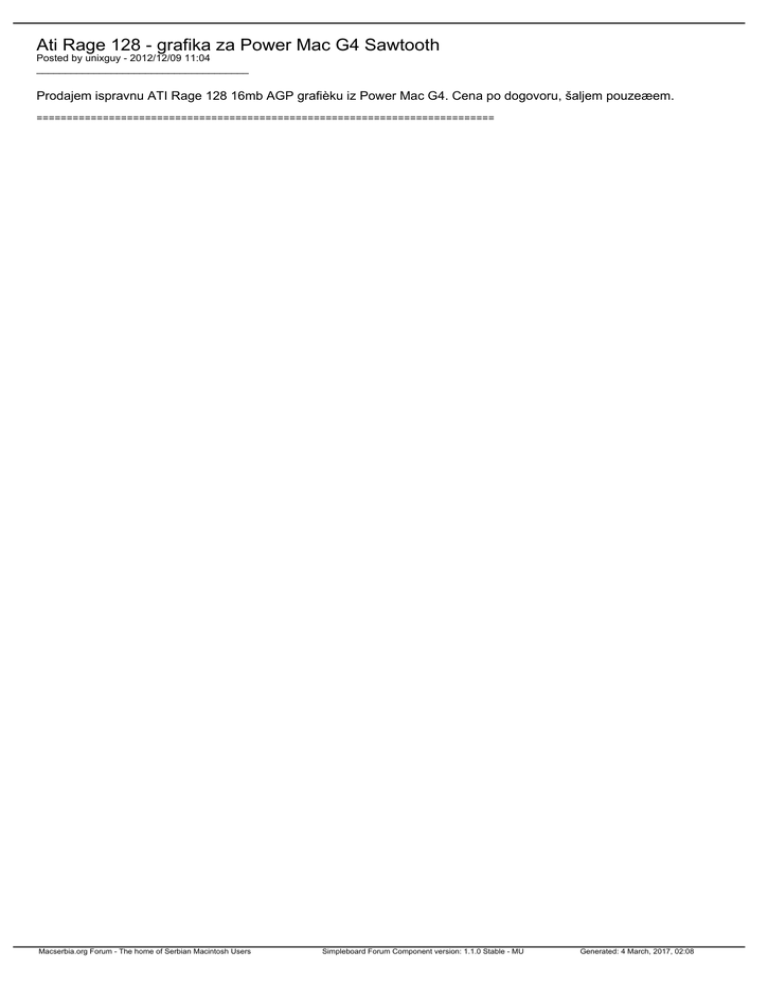 Ati Rage 128 - grafika za Power Mac G4 Sawtooth Posted by unixguy - 2012/12/09 11:04 _____________________________________ Prodajem ispravnu ATI Rage 128 16mb AGP grafièku iz Power Mac G4. Cena po dogovoru, šaljem pouzeæem. ============================================================================ Macserbia.org Forum - The home of Serbian Macintosh Users Simpleboard Forum Component version: 1.1.0 Stable - MU Generated: 4 March, 2017, 02:08