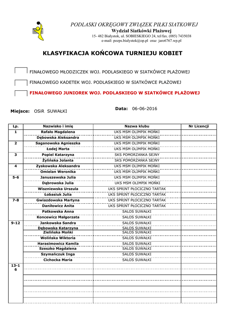 PODLASKI OKRĘGOWY ZWIĄZEK PIŁKI SIATKOWEJ Wydział Siatkówki Plażowej 15 482 Białystok, ul. SOBIESKIEGO 24, tel/fax. (085) 7435038 email: [email protected] oraz jaro6767.wp.pl KLASYFIKACJA KOŃCOWA TURNIEJU KOBIET FINAŁOWEGO MŁODZICZEK WOJ. PODLASKIEGO W SIATKÓWCE PLAŻOWEJ FINAŁOWEGO KADETEK WOJ. PODLASKIEGO W SIATKÓWCE PLAŻOWEJ FINAŁOWEGO JUNIOREK WOJ. PODLASKIEGO W SIATKÓWCE PLAŻOWEJ Miejsce: OSiR SUWAŁKI Data: 06062016 Lp. Nazwisko i imię Nazwa klubu Nr Licencji 1 Rafało Magdalena UKS MSM OLIMPIK MOŃKI Dębowska Aleksandra UKS MSM OLIMPIK MOŃKI Saganowska Agnieszka UKS MSM OLIMPIK MOŃKI Łodej Marta UKS MSM OLIMPIK MOŃKI 3 Popiel Katarzyna SKS POMORZANKA SEJNY Żylińska Jolanta SKS POMORZANKA SEJNY 4 Zyskowska Aleksandra UKS MSM OLIMPIK MOŃKI Omielan Weronika UKS MSM OLIMPIK MOŃKI Januszewska Julia UKS MSM OLIMPIK MOŃKI 2 56 78 912 131 6 Dąbrowska Julia UKS MSM OLIMPIK MOŃKI Wiszniewska Urszula UKS SPRINT PŁOCICZNO TARTAK Łobasiuk Julia UKS SPRINT PŁOCICZNO TARTAK Gwiazdowska Martyna UKS SPRINT PŁOCICZNO TARTAK Daniłowicz Anita UKS SPRINT PŁOCICZNO TARTAK Patkowska Anna SALOS SUWAŁKI Koncewicz Małgorzata SALOS SUWAŁKI Jankowska Sandra Dębowska Katarzyna Zielińska Mońki SALOS SUWAŁKI SALOS SUWAŁKI SALOS SUWAŁKI Wolińska Wiktoria SALOS SUWAŁKI Harasimowicz Kamila Szeszko Magdalena SALOS SUWAŁKI SALOS SUWAŁKI Szymańczuk Inga SALOS SUWAŁKI Cichocka Maria SALOS SUWAŁKI PODLASKI OKRĘGOWY ZWIĄZEK PIŁKI SIATKOWEJ Wydział Siatkówki Plażowej 15 482 Białystok, ul. SOBIESKIEGO 24, tel/fax. (085) 7435038 email: [email protected] oraz jaro6767.wp.pl 172 4 253 2 Sędzia główny przesyła dokładnie wypełniony komunikat na podane adresy email: [email protected] oraz w maksymalnie przeciągu 2 dni. Tomasz Zdański Koordynator siatkówki plażowej POZPS Sędzia główny zawodów – Skalimowski Karol PODLASKI OKRĘGOWY ZWIĄZEK PIŁKI SIATKOWEJ Wydział Siatkówki Plażowej Kategoria – Juniorka 15 482 Białystok, ul. SOBIESKIEGO 24, tel/fax. (085) 7435038 email: [email protected] oraz jaro6767.wp.pl