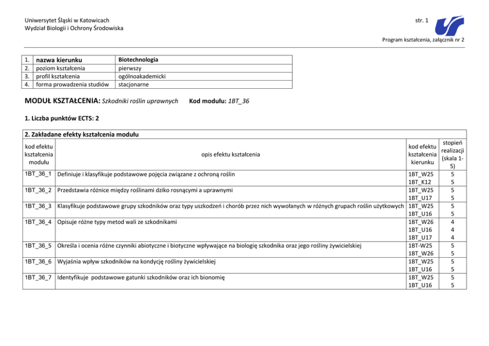 Uniwersytet Śląski w Katowicach Wydział Biologii i Ochrony Środowiska str. 1 Program kształcenia, załącznik nr 2 1. 2. 3. 4. nazwa kierunku poziom kształcenia profil kształcenia forma prowadzenia studiów Biotechnologia pierwszy ogólnoakademicki stacjonarne MODUŁ KSZTAŁCENIA: Szkodniki roślin uprawnych Kod modułu: 1BT_36 1. Liczba punktów ECTS: 2 2. Zakładane efekty kształcenia modułu kod efektu kształcenia modułu 1BT_36_1 1BT_36_2 1BT_36_3 1BT_36_4 1BT_36_5 1BT_36_6 1BT_36_7 stopień kod efektu realizacji opis efektu kształcenia kształcenia (skala 1kierunku 5) Definiuje i klasyfikuje podstawowe pojęcia związane z ochroną roślin 1BT_W25 5 1BT_K12 5 Przedstawia różnice między roślinami dziko rosnącymi a uprawnymi 1BT_W25 5 1BT_U17 5 Klasyfikuje podstawowe grupy szkodników oraz typy uszkodzeń i chorób przez nich wywołanych w różnych grupach roślin użytkowych 1BT_W25 5 1BT_U16 5 Opisuje różne typy metod wali ze szkodnikami 1BT_W26 4 1BT_U16 4 1BT_U17 4 Określa i ocenia różne czynniki abiotyczne i biotyczne wpływające na biologię szkodnika oraz jego rośliny żywicielskiej 1BT-W25 5 1BT_W26 5 Wyjaśnia wpływ szkodników na kondycję rośliny żywicielskiej 1BT_W25 5 1BT_U16 5 Identyfikuje podstawowe gatunki szkodników oraz ich bionomię 1BT_W25 5 1BT_U16 5 Uniwersytet Śląski w Katowicach Wydział Biologii i Ochrony Środowiska str. 2 Program kształcenia, załącznik nr 2 3. Opis modułu Opis Wymagania wstępne modułu Moduł Szkodniki Roślin Użytkowych dostarcza studentowi wiedzy na temat biologii i wpływu na rośliny użytkowe różnych gatunków owadów wspólnie klasyfikowanych jako szkodniki. Student uczy się rozpoznawać w terenie uszkodzenia roślin lub inne objawy wskazujące na obecność szkodnika. W ramach modułu studenci uczą się wykonywać preparaty z wybranych gatunków szkodników oraz zapoznają się z podstawowymi gatunkami szkodników, należących do różnych grup owadów oraz z ich bionomią. W trakcie zajęć dyskutowany będzie wpływ różnych czynników decydujących o stopniu szkodliwości różnych grup bezkręgowców na rośliny. Ponadto student zapoznaje się z różnymi formami ochrony roślin. Moduł przybliża studentowi problematykę związaną z zagrożeniami, jakie płyną z sprowadzaniem nowych roślin użytkowych, którym często towarzyszą swoiste dla nich gatunki szkodników. Znajomość głównych pojęć biologicznych , realizacja efektów kształcenia z modułów dotyczących bioróżnorodności roślin i zwierząt 4. Sposoby weryfikacji efektów kształcenia modułu Kod 1BT _36_w_1 1BT_36_w_2 nazwa (typ) sposobu weryfikacji Kolokwium Ciągła ocena aktywności studenta na zajęciach opis szczegółowy Pisemne i praktyczne sprawdzenie wiedzy przekazanej w trakcie laboratoriów oraz umiejętności rozpoznawania gatunków szkodników i uszkodzeń przez nie wywołanych. Ocenie podlegają wypełnione na każdych ćwiczeniach karty pracy, według zalecanego schematu. W kartach pracy powinny się znaleźć informacje o poznawanych na ćwiczeniach gatunkach szkodników, ich roślinach żywicielskich oraz rodzajach uszkodzeń, jakie powodują. Oceniana będzie również umiejętność wykonywania preparatów z zebranych w terenie szkodliwych gatunków owadów oraz poprawność ich identyfikacji. efekt(-y) kształcenia modułu 1BT_36_1, 1 BT _36_2, 1 BT _36_3, 1BT_36_4, 1 BT _36_5, 1 BT _36_6 1BT_36_1, 1 BT _36_2, 1 BT _36_3, 1BT_36_4, 1 BT _36_5, 1 BT _36_6, 1 BT _36_7 5. Formy prowadzenia zajęć nazwa 1 BT _36_fs_1 laboratorium forma prowadzenia zajęć opis (z uwzględnieniem metod dydaktycznych) Praca samodzielna oraz w grupach polegająca na identyfikacji gatunków szkodników i scharakteryzowaniu uszkodzeń, poznanie bionomii wybranych gatunków, wykonaniu preparatów mikroskopowych z liczba godzin 15 praca własna studenta opis Powtórzenie oraz utrwalenie wiadomości omawianych w trakcie ćwiczeń, przegląd materiałów dydaktycznych oraz pozycji literaturowych w celu przygotowania prezentacji multimedialnej liczba godzin 10 sposób weryfikacji efektów kształcenia 1BT _36_w_1 1BT_36_w_2 punkty ECTS 1 Uniwersytet Śląski w Katowicach Wydział Biologii i Ochrony Środowiska str. 3 Program kształcenia, załącznik nr 2 1 BT _36_fs_2 Warsztaty terenowe zebranego w terenie materiału oraz jego identyfikacja gatunkowa. Łączenie teorii z praktyką- zbiór materiału oraz zapoznawanie się z grupami szkodników w różnych typach upraw rolniczych suma godzin: 5 20 Zbiór materiału w terenie oraz wyszukiwanie uszkodzeń roślin spowodowanych działalnością fitofagów. suma godzin: 4 14 1BT _36_w_1 1BT_36_w_2 suma punktów: 1 2