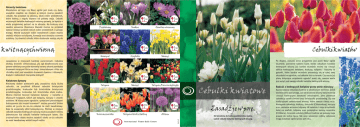 Akcenty kwiatowe k witnących wiosną |ì 15 Przebiśnieg Krokus Zawilec wiosenny |ì 30 Narcyz î Korona cesarska Po długiej, ponurej zimie przyjemnie jest jeżeli Wasz ogród wcześnie, ponownie nabiera barw. Dzięki cebulkom kwiatów kwitnących wiosną już bardzo wcześnie można się cieszyć obficie kwitnącymi kwiatami. Krokusy, tulipany i hiacynty to gatunki, które bardzo wcześnie prezentują się w całej swej okazałości w ogrodzie, na balkonie lub na tarasie. Czy macie już plany dotyczące urządzenia ogrodu? Jeżeli tak, zawsze warto jest wziąć pod uwagę cebulki kwiatów kwitnących wiosną. |ì 40 î Narcyz |ì 80 Cebulki kwiatów î |ì 50 î Tulipan |ì 30 î Szafirki Kwiatowe dywany î |ì 20 î Hiacynt |ì 20 î |ì 25 zasadzenia w miejscach bardziej zacienionych. Cebulica (Scilla), śnieżnik (Chionodoxa), psi ząb (Erythronium) oraz pewne odmiany narcyzów stanowią barwny akcent pomiędzy krzewami tracącymi liście na zimę i zimozielonymi. A kto nie chciałby mieć pod wysokimi drzewami dywanu z różowych, białych i niebieskich hiacyntów leśnych? Kwiatowy dywan powstanie gdy, posadzisz dużą liczbę cebulek, na przykład kilkaset cebulek śnieżyczek przebiśniegów, krokusów lub śnieżników śnieżyczek przebiśniegów, krokusów lub śnieżników obok siebie. Można również tworzyć kwiatowe dywany z kwiatów o dłuższych łodygach, takich jak tulipany, narcyzy i czosnki ozdobne. W klasycznym ogrodzie z połaciami porośniętymi bukszpanem lub innymi krzewami* można posadzić blisko siebie od 50-ciu do 60-ciu cebulek na metr kwadratowy. Daje to wspaniały efekt kolorystyczny. Później w miejsce cebulek kwiatów kwitnących wiosną można posadzić rośliny jednoroczne lub cebulki kwiatów kwitnących latem. Dla urozmaicenie rabaty można zasadzić około 10-ciu cebulek na metr kwadratowy wśród innych roślin. |ì 10 î î Tulipan Darwin hybryda |ì 50 |ì100 î Tulipanliliokształtny î Allium FGCV-P Niezależnie od tego czy Wasz ogród jest mały czy duży, wszędzie znajdzie się miejsce w którym można zasadzić cebulki. Na przykład na obrzeżu, obok roślin wieloletnich, które kwitną z reguły dopiero od połowy maja. Cebulki wczesnych kwiatów kwitnących wiosną sprawią, że będzie o wiele przyjemniej patrzeć na te obrzeża. Na krokusy oraz zawilce wiosenne (Anemone blanda) można na przykład wybrać miejsce pośród niskich roślin wieloletnich z samego brzegu. Wśród wyższych roślin wieloletnich często można znaleźć miejsce na tulipany, kamasję oraz dostojny czosnek ozdobny. Są również cebulki które doskonale nadają się do Radość z kwitnących kwiatów przez wiele miesięcy Zasadź j e w porę. Od września do końca października można sadzić cebulki kwiatów kwitnących wiosną. Każda roślina cebulowa kwitnie w określonym terminie. Jeżeli weźmiecie to pod uwagę, już od wczesnej wiosny będziecie się cieszyć kwitnącymi kwiatami cebulowymi. Jako pierwsze zakwitają rannik zimowy oraz śnieżyczka przebiśnieg. Są one tradycyjnymi zwiastunami wiosny, które zawsze cieszą oczy. Następnie zakwitają krokusy, śnieżniki (Chionodoxa), narcyzy oraz pierwsze wczesne tulipany. W kwietniu i maju przychodzi kolej na szafirki, tulipany oraz przepiękne korony cesarskie (Fritillaria). Czosnek ozdobny (Allium) kwitnie od połowy maja prawie do końca lipca. Tak więc wiosenne rośliny cebulowe mogą ozdabiać ogród przez pół roku. Sadzenie Odległość sadzenia Przed przystąpieniem do sadzenia ziemię należy dobrze spulchnić i ewentualnie zmieszać z kompostem. Wykopać dołek i duże cebulki sadzić w dołku czubkiem do góry. Małe cebulki można rozsypać w rowkach i przykryć ziemią. Duże cebulki kwiatowe należy sadzić w większej odległości od siebie niż małe. Duże cebulki sadzi się w odległości mniej więcej 12 cm od siebie, natomiast małe cebulki w odległości około 5-7 cm od siebie. Efekt jaki chcesz osiągnąć na rabacie zależy od odległości lub liczby cebulek posadzonych na metrze kwadratowym. W celu uzyskania naturalnego efektu cebulki sadzi się w różnych odległościach od siebie. Gdy pragniecie osiągnąć efekt uporządkowanego kwiatowego dywanu, wówczas cebulki należy zasadzić w równych odległościach od siebie. Kiedy sadzić? Cebulki kwiatów kwitnących wiosną można sadzić od września do końca października. Najlepiej jednak przed przymrozkami. Cebulki kwiatowe n a rabatach Głębokość sadzenia Istnieje ogólnie obowiązująca zasada dotycząca głębokości sadzenia: cebulki należy sadzić na głębokości równej dwukrotnej ich wysokości. Dla dużych cebulek, takich jak cebulki narcyzów, tulipanów i hiacyntów jest to głębokość około15-20 cm. Głębokość sadzenia mniejszych cebulek wynosi około 5 - 10 cm. Dobra rada 1. Zimą cebulki kwiatowe w donicach nie będą z reguły narażone na chłód. Nie należy ich jednak sadzić zbyt blisko brzegu donicy, ponieważ Cebulki na następny rok Rodzaj gleby i odpływ wody W glebie piaszczystej woda wsiąka jest stosunkowo łatwo. Gleba gliniasta natomiast ma tendencję do zatrzymywania wilgoci przez długi czas. Cebulki źle znoszą nadmierną wilgoć, zatem jeżeli sadzi się je w glebie gliniastej, należy zadbać o należyty odpływ wody. Glebę gliniastą można trochę spulchnić poprzez zmieszanie jej z piaskiem lub kompostem. Przed zasadzeniem cebulek w wykopanych w tym celu dołkach można również wsypać do nich drobne kamyczki lub żwir. Woda i mróz Natychmiast po zasadzeniu cebulki należy podlać. W ten sposób zostaną one pobudzone do wypuszczenia korzeni. Im wcześniej wytworzą się korzenie, tym prędzej cebulka będzie odporna na mróz. Podlewania można zaprzestać w momencie rozpoczęcia się deszczów jesiennych. Wiele cebulek można po przekwitnięciu pozostawić w ziemi. Nie należy ich ruszać, a liście należy pozostawić, aby mogły one obumrzeć w sposób naturalny
