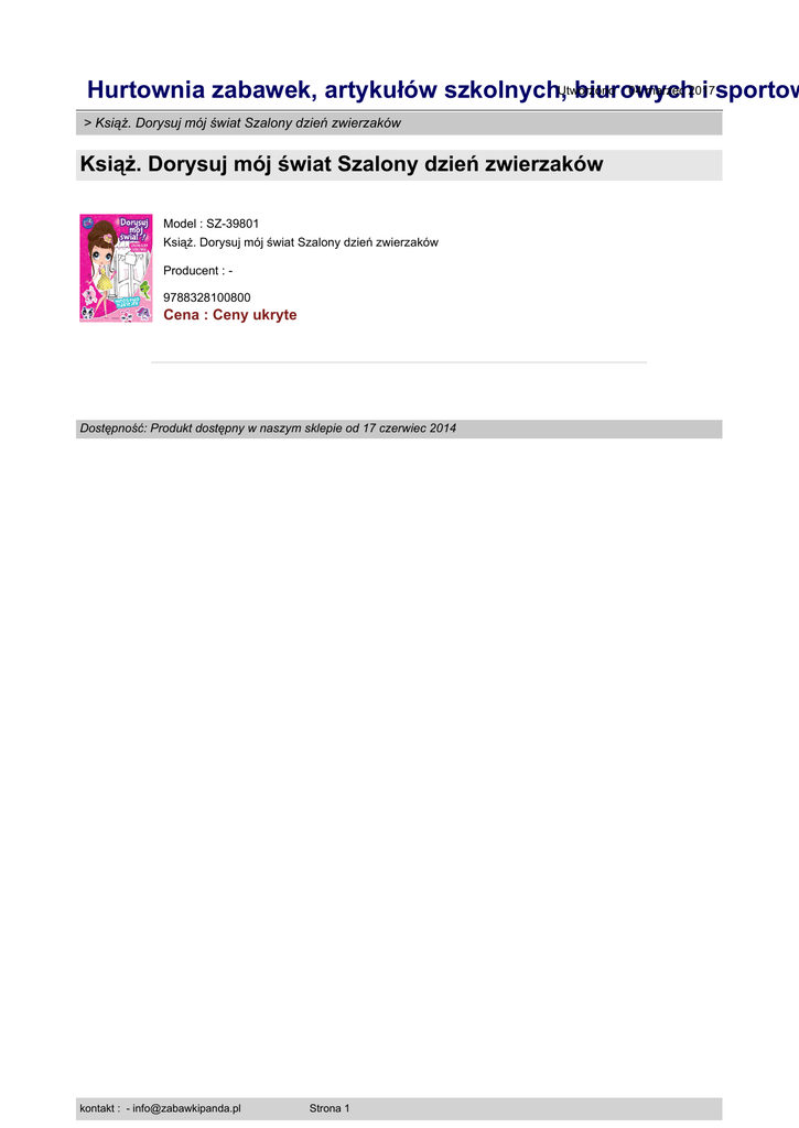 : 04 marzec 2017 Hurtownia zabawek, artykułów szkolnych,Utworzono biurowych i sportow > Książ. Dorysuj mój świat Szalony dzień zwierzaków Książ. Dorysuj mój świat Szalony dzień zwierzaków Model : SZ-39801 Książ. Dorysuj mój świat Szalony dzień zwierzaków Producent : 9788328100800 Cena : Ceny ukryte Dostępność: Produkt dostępny w naszym sklepie od 17 czerwiec 2014 kontakt : - [email protected] Strona 1