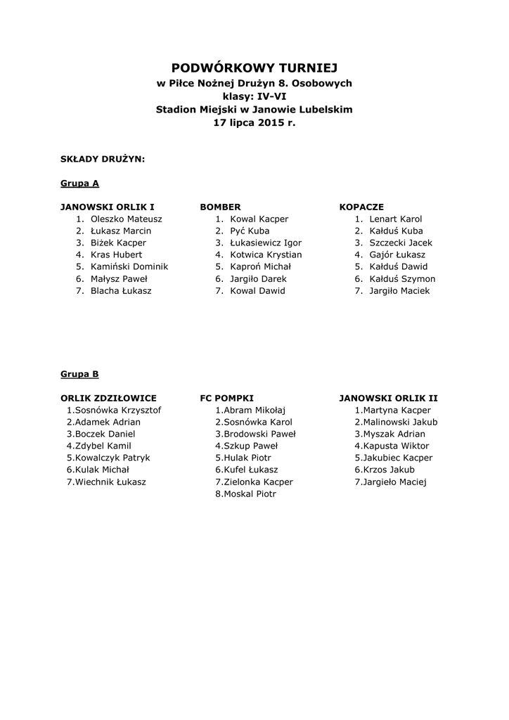 PODWÓRKOWY TURNIEJ w Piłce Nożnej Drużyn 8. Osobowych klasy: IV-VI Stadion Miejski w Janowie Lubelskim 17 lipca 2015 r. SKŁADY DRUŻYN: Grupa A JANOWSKI ORLIK I 1. Oleszko Mateusz 2. Łukasz Marcin 3. Biżek Kacper 4. Kras Hubert 5. Kamiński Dominik 6. Małysz Paweł 7. Blacha Łukasz BOMBER 1. Kowal Kacper 2. Pyć Kuba 3. Łukasiewicz Igor 4. Kotwica Krystian 5. Kaproń Michał 6. Jargiło Darek 7. Kowal Dawid KOPACZE 1. Lenart Karol 2. Kałduś Kuba 3. Szczecki Jacek 4. Gajór Łukasz 5. Kałduś Dawid 6. Kałduś Szymon 7. Jargiło Maciek FC POMPKI 1.Abram Mikołaj 2.Sosnówka Karol 3.Brodowski Paweł 4.Szkup Paweł 5.Hulak Piotr 6.Kufel Łukasz 7.Zielonka Kacper 8.Moskal Piotr JANOWSKI ORLIK II 1.Martyna Kacper 2.Malinowski Jakub 3.Myszak Adrian 4.Kapusta Wiktor 5.Jakubiec Kacper 6.Krzos Jakub 7.Jargieło Maciej Grupa B ORLIK ZDZIŁOWICE 1.Sosnówka Krzysztof 2.Adamek Adrian 3.Boczek Daniel 4.Zdybel Kamil 5.Kowalczyk Patryk 6.Kulak Michał 7.Wiechnik Łukasz TABELA SPOTKAŃ I WYNIKÓW GRUPA A NUME R MECZ U NAZWA ZESPOŁU NAZWA ZESPOŁU 1. JANOWSKI ORLIK I KOPACZE 2:2 2. BOMBER KOPACZE 0:0 3. JANOWSKI ORLIK I BOMBER 0:2 KTO Z KIM WYNIK STRZELCY BRAMEK Łukasz (1) Kamiński (1) Szczecki (2) Kowal K (1) Łukasiewicz (1) TABELA SPOTKAŃ I WYNIKÓW GRUPA B KTO Z KIM NUMER MECZU WYNIK NAZWA ZESPOŁU STRZELCY BRAMEK NAZWA ZESPOŁU 1. ORLIK ZDZIŁOWICE JANOWSKI ORLIK II 7:0 2. FC POMPKI JANOWSKI ORLIK II 10:0 3. ORLIK ZDZIŁOWICE FC POMPKI 2:2 Adamek (2) Zdybel (1) Kowalczyk (1) Hulak (2) Wiechnik (1) Abram (2) Sosnówka (5) Brodowski (2) Hulak (1) Kowalczyk (1) Wiechnik (1) Brodowski (1) Hulak (1) PÓŁFINAŁ NUMER MECZU KTO Z KIM NAZWA ZESPOŁU NAZWA ZESPOŁU 1. BOMBER ORLIK ZDZIŁOWICE 2:2 karne 0:2 Pyć (2) Adamek (1) Wiechnik (1) 2. KOPACZE FC POMPKI 0:2 Sosnówka (1) Hulak (1) WYNIK STRZELCY BRAMEK MECZ O 3 MIEJSCE NUMER MECZU KTO Z KIM NAZWA ZESPOŁU NAZWA ZESPOŁU 1. BOMBER KOPACZE WYNIK 2:2 karne 1:2 STRZELCY BRAMEK Kotwica (1) Jargiło (1) Szczecki (2) FINAŁ KTO Z KIM WYNIK NAZWA ZESPOŁU NAZWA ZESPOŁU ORLIK ZDZIŁOWICE FC POMPKI 0:1 STRZELCY BRAMEK Sosnówka (1) PODWÓRKOWY TURNIEJ w Piłce Nożnej Drużyn 8. Osobowych klasy: IV-VI Stadion Miejski w Janowie Lubelskim 17 lipca 2015 r. KLASYFIKACJA KOŃCOWA MIEJSCE NAZWA ZESPOŁU I FC POMPKI II ORLIK ZDZIŁOWICE III KOPACZE KRÓL STRZELCÓW NAJLEPSZY BRAMKARZ Sosnówka Karol ILOŚĆ ZDOBYTYCH BRAMEK 7 Sosnówka Krzysztof Sędzia Główny Turnieju: Dariusz Brytan