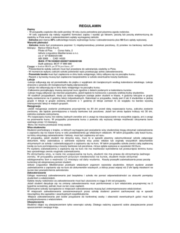REGULAMIN Zapisy - W przypadku zapisów dla osób poniżej 18 roku życia potrzebna jest pisemna zgoda rodziców. - W celu zapisania się należy wypełnić formularz zapisu i wysłać go faksem, pocztą lub pocztą elektroniczną do siedziby w Pizie wraz z potwierdzeniem wpłaty wymaganej zaliczki. - Zaliczka jest równa 30% całkowitego kosztu wybranego kursu i zakwaterowania plus 50 Euro opłaty wpisowej. Warunki płatności - Zaliczka może być przekazana poprzez 1) międzynarodowy przekaz pocztowy, 2) przelew na bankowy rachunek bieżący: Banca Intesa S.p.A. Filiale di Pisa - Corso Italia, 2 Istituto Linguistico Mediterraneo s.n.c. c/c n° 07183924/01/89 ABI 3069 - CAB 14020 IBAN: IT76O0306914020071839240189 Swift address: BCIT IT MM 590 Uwaga: w kodzie IBAN, po IT76 jest litera „O“ - Potwierdzenie wpłaty zaliczki musi być przesłane do sekretariatu siedziby w Pizie. - W momencie wpływu zaliczki szkoła potwierdzi wpis przekazując adres zakwaterowania. - Pozostała kwota musi być zapłacona w dniu testu wstępnego, który odbywa się na początku kursu. - Razem z tą kwotą muszą być zapłacone bezpośrednio w szkole ewentualne koszty bankowe. Lekcje -Lekcje odbywają się od poniedziałku do piątku z wyjątkiem dni świątecznych według kalendarza włoskiego. Lekcje stracone z powodu dni świątecznych będą odpracowane. -Lekcje nie odbywają się w dniu testu wstępnego na początku kursu. -Całkowicie początkujący muszą zaczynać kurs zgodnie z datami podanymi w kalendarzu kursów. -Lekcje mogą odbywać się również popołudniu, jeżeli będzie to konieczne z powodu wielkiej liczby studentów. -W rzadkich przypadkach, kiedy po teście wstępnym zostaje jeden student w klasie, 4 godziny lekcyjne w grupie będą zamienione na 2 godziny lekcji indywidualnych. Natomiast w przypadku, kiedy jest 2 lub 3 studentów w jednej grupie 4 lekcje w grupie zostaną skrócone o 1 godzinę (3 lekcje zamiast 4) ze względu na bardzo wysoką intensywność lekcji w małych grupach. Rezygnacja -Jeżeli rezygnacja zostanie przekazana przynajmniej na 30 dni przed datą rozpoczęcia kursu, zaliczka zostanie zwrócona, ale będzie pomniejszona o koszty bankowe lub pocztowe. Jeżeli ten okres będzie krótszy niż 30 dni, zaliczka zostanie zatrzymana. -Po rozpoczęciu kursu nie robimy żadnych zwrotów ani z uwagi na nieuczęszczanie na wszystkie zajęcia, ani z uwagi na przerwanie kursu. W przypadku przerwania kursu z powodu siły wyższej istnieje możliwość otrzymania bonu ważnego przez 12 miesięcy. -Bonu nie można przekazać innej osobie Wiza studencka Studenci pochodzący z krajów, w których wymagane jest posiadanie wizy studenckiej mogą otrzymać zaświadczenie o zapisaniu się na nasze kursy w celu przedstawienia go właściwym władzom. W takim przypadku cały koszt kursu, na który otrzymają zaświadczenie i fakturę, musi być zapłacony od razu. W przypadku, jeżeli student nie otrzyma wizy, musi to w sposób pisemny zakomunikować szkole załączając dokument, który zaświadcza o odmowie wydania wizy przez władze lub orginały wszystkich dokumentów otrzymanych ze szkoły i zaświadczających o zapisaniu się na kurs. W takim przypadku szkoła zwróci całą zapłaconą kwotę za kurs pomniejszoną o koszty bankowe lub pocztowe, minus opłata wpisowa w wysokości 50 Euro. Po wydaniu zaświadczenia o zapisaniu się na kurs nie ma możliwości wykreślenia lub przesunięcia terminu kursu bez uprzedniego zwrotu oryginału zaświadczenia. Po otrzymaniu wizy, w razie nie uczęszczania na kurs, student nie ma prawa do otrzymania żadnego zwrotu. W przypadku poważnych przyczyn nieobecności na kursie, student może otrzymać odstępowalny bon o ważności 12 miesięcy od daty wydania. Koszty przesyłki zaświadczenia przez pocztę kurierską lub ekspresową ponosi student. Istituto Linguistico Mediterraneo przekaże właściwym organom nazwiska studentów, którym wydane zostało zaświadczenie o zapisaniu się na kurs do dokumentów wizowych, a którzy przez więcej niż 2 dni będą nieobecni na kursie bez powiadomienia sekretariatu. Zakwaterowanie Usługa rezerwacji zakwaterowania jest bezpłatna i szkoła nie ponosi odpowiedzialności za stosunki pomiędzy studentem a właścicielem. Opłata reszty należności za zakwaterowanie musi być uiszczona w ciągu 2 dni od przyjazdu. Jeżeli student decyduje się na zmianę zakwaterowania musi poinformować o tym właściciela przynajmniej na 2 tygodnie wcześniej, jednak musi za ten czas zapłacić. Ewentualne szkody wyrządzone w miejscach zakwaterowania muszą być zrekompensowane właścicielowi. W miejscach zakwaterowania zarezerwowanych przez szkołę studenci powinni zachowywać się w sposób nieuciążliwy dla sąsiadów i ewentualnych współlokatorów. Miejsce zakwaterowania jest ściśle przypisane do konkretnej osoby i obecność ewentualnych gości musi być przedyskutowana z właścicielem. Ubezpieczenie Studenci objęci są ubezpieczeniem tylko wewnątrz szkoły. Dlatego radzimy zapewnić sobie ubezpieczenie przed opuszczeniem swojego kraju. FORMULARZ ZAPISU Wysłać pocztą na adres: Istituto Linguistico Mediterraneo, Via C. Battisti N°3 – C.P. 209, I-56100 Pisa (Italia) lub faksem na numer: 00 39 050 48157 Pani Pan Imię: Nazwisko: Data urodzenia: Narodowość: Adres: Kod pocztowy: Miejscowość: Państwo: Tel.: Faks: e-mail: Nr paszportu Ważność: Data i godzina przyjazdu: Czy podróżuje Pan/i samochodem? TAK NIE Alergie: Zawód: Czy jest Pan/i palaczem? TAK Dowiedziałem się o waszej szkole z: _____________________________________________ Obecna znajomość języka włoskiego Żadna Słaba Średnia Dobra Chcę zapisać się na następujący kurs (rodzaj kursu) ___________________________ Od ____________________ do _____________________ na _______ tydzień / tygodni/e. Wybieram szkołę w: PIZA VIAREGGIO Zakwaterowanie Nie chcę zakwaterowania Chcę zarezerwować zakwaterowanie (wskazać dwie