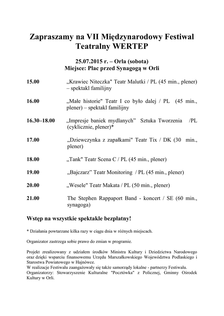 Zapraszamy na VII Międzynarodowy Festiwal Teatralny WERTEP 25.07.2015 r. – Orla (sobota) Miejsce: Plac przed Synagogą w Orli 15.00 „Krawiec Niteczka" Teatr Malutki / PL (45 min., plener) – spektakl familijny 16.00 „Małe historie" Teatr I co było dalej / PL (45 min., plener) – spektakl familijny 16.30–18.00 „Impresje baniek mydlanych” Sztuka Tworzenia (cyklicznie, plener)* 17.00 „Dziewczynka z zapałkami" Teatr Tix / DK (30 min., plener) 18.00 „Tank" Teatr Scena C / PL (45 min., plener) 19.00 „Bajczarz” Teatr Monitoring / PL (45 min., plener) 20.00 „Wesele" Teatr Makata / PL (50 min., plener) 21.00 The Stephen Rappaport Band - koncert / SE (60 min., synagoga) /PL Wstęp na wszystkie spektakle bezpłatny! * Działania powtarzane kilka razy w ciągu dnia w różnych miejscach. Organizator zastrzega sobie prawo do zmian w programie. Projekt zrealizowany z udziałem środków Ministra Kultury i Dziedzictwa Narodowego oraz dzięki wsparciu finansowemu Urzędu Marszałkowskiego Województwa Podlaskiego i Starostwa Powiatowego w Hajnówce. W realizacje Festiwalu zaangażowały się także samorządy lokalne - partnerzy Festiwalu. Organizatorzy: Stowarzyszenie Kulturalne "Pocztówka" z Policznej, Gminny Ośrodek Kultury w Orli.