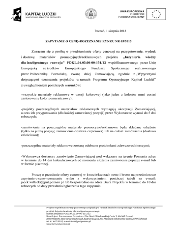 Poznań, 1 sierpnia 2013 ZAPYTANIE O CENĘ–ROZEZNANIE RYNKU NR 05/2013 Zwracam się z prośbą o przedstawienie oferty cenowej na przygotowanie, wydruk i dostawę materiałów promocyjnych/reklamowych projektu „Inżynieria wiedzy dla inteligentnego rozwoju” POKL.04.03.00-00-131/12 współfinansowanego przez Unię Europejską ze środków przez Politechnikę Europejskiego Poznańską, zwaną dalej Funduszu Społecznego Zamawiającą, zgodnie realizowanego z „Wytycznymi dotyczącymi oznaczania projektów w ramach Programu Operacyjnego Kapitał Ludzki” z uwzględnieniem poniższych warunków: -wszystkie materiały reklamowe w wersji kolorowej (jako jeden z kolorów musi zostać zastosowany kolor pomarańczowy); -projekty poszczególnych materiałów reklamowych wymagają akceptacji Zamawiającej, a czas ich przygotowania (dla każdej zamawianej pozycji) przez Wykonawcę wynosi do 5 dni roboczych; -zamówienia na poszczególne materiały promocyjne/reklamowe będą składane odrębnie (tylko na jedną pozycję zamówienia-dostawa częściowa) lub na całość zamówienia (dostawa całościowa); -poszczególne materiały reklamowe zostaną odebrane protokołami zdawczo-odbiorczymi; -Wykonawca dostarczy zamówienie Zamawiającej pod wskazany na terenie Poznania adres w terminie do 14 dni kalendarzowych od momentu złożenia zamówienia poprzez e-mail lub w formie pisemnej. Proszę o przesłanie oferty cenowej w kwocie/kwotach netto i brutto na przedmiotowe zapytanie o cenę–rozeznanie rynku z wykorzystaniem poniższej tabeli na e-mail: [email protected] lub bezpośrednio na adres Biura Projektu w terminie do 10 dni roboczych od daty przesłania/ogłoszenia tego zapytania. Projekt współfinansowany przez Unię Europejską w ramach środków Europejskiego Funduszu Społecznego projekt: Inżynieria wiedzy dla inteligentnego rozwoju numer projektu: POKL.04.03.00-00-131/12 Beneficjent: POLITECHNIKA POZNAŃSKA, Plac Marii Skłodowskiej-Curie 5, 60-965 Poznań BIURO PROJEKTU: Dział Spraw Naukowych, budynek B1, pok. 209, Plac Marii Skłodowskiej-Curie 5, 60-965 Poznań tel. 61 647 58 95, e-mail: [email protected] www.iwir.put.poznan.pl Lp. RODZAJ MATERIAŁU PROMOCYJNEGO/ REKLAMOWEGO 1. ULOTKA A4 do DL-projekt 1 2. ULOTKA A4 do DL-projekt 2 3. ULOTKA A4 do DL-projekt 3 4. ULOTKA A4 do DL-projekt 4 5. ULOTKA A4 do DL-projekt 5 6. ULOTKA A4 do DL-projekt 6 7. ULOTKA A4 do DL-projekt 7 8. 9. 10. PLAKAT A2 - projekt 8 294X210 MM DO 99X210 MM 294X210 MM DO 99X210 MM 294X210 MM DO 99X210 MM 294X210 MM DO 99X210 MM 294X210 MM DO 99X210 MM 294X210 MM DO 99X210 MM 294X210 MM DO 99X210 MM 594X420 MM PLAKAT A3 - projekt 9 297X420 MM 11. PLAKAT A3- projekt 10 TECZKI BEZ GUMKI (FOLIA MAT)-projekt 11 12. NAKLEJKI A6-projekt 12 13. NAKLEJKI 60x30 mm -projekt 13 14. 15. 16. 17. 18. 19. 20. 21. 22. PODKŁAD (G/M2) KOLORYSTYKA NAKŁAD/ ILOŚĆ (SZTUKI) KREDA MAT 135 G/M2 4+4 500 KREDA MAT 135 G/M2 4+4 500 KREDA MAT 135 G/M2 4+4 500 KREDA MAT 135 G/M2 4+4 500 KREDA MAT 135 G/M2 4+4 500 KREDA MAT 135 G/M2 4+4 500 KREDA MAT 135 G/M2 4+4 500 KREDA MAT 135 G/M2 4+0 200 KREDA MAT 135 G/M2 4+0 250 297X420 MM KREDA MAT 135 G/M2 4+0 250 434X302 MM KREDA MAT 350G/M2 4+0 500 105X148 MM FOLIA SAMOPRZYLEPNA BIAŁA 4+0 200 60X30 MM FOLIA SAMOPRZYLEPNA BIAŁA 4+0 200 FORMAT/ WYMIAR CENA NETTO CENA BRUTTO RAZEM: POZYCJE OD 1 DO 13 ROLL UP-projekt 14 85X200 CM BANNER FERRARI 456 G/M2 4+0 1 ROLL UP-projekt 15 85X200 CM BANNER FERRARI 456 G/M2 4+0 1 ROLL UP-projekt 16 85X200 CM BANNER FERRARI 456 G/M2 4+0 1 ROLL UP-projekt 17 85X200 CM BANNER FERRARI 456 G/M2 4+0 1 ROLL UP-projekt 18 85X200 CM BANNER FERRARI 456 G/M2 4+0 1 ROLL UP-projekt 19 85X200 CM BANNER FERRARI 456 G/M2 4+0 1 RAZEM: POZYCJE OD 15 DO 20 RAZEM: POZYCJE OD 1 DO 13 + POZYCJE OD 15 DO 20 Kryterium wyboru oferty z uwzględnieniem powyższych warunków stanowi najniższa, łączna cena brutto za wszystkie materiały promocyjno/reklamowe wymienione w powyższej tabeli. W przypadku ewentualnych pytań/wątpliwości proszę o kontakt z koordynatorem projektu: Jacek Willecki, e-mail: [email protected], tel.: 61-647-58-95. Z poważaniem, Jacek Willecki Załączniki: 1) Wytyczne dotyczące oznaczania projektów w ramach Programu Operacyjnego Kapitał Ludzki. Projekt współfinansowany przez Unię Europejską w ramach środków Europejskiego Funduszu Społecznego projekt: Inżynieria wiedzy dla inteligentnego rozwoju numer projektu: POKL.04.03.00-00-131/12 Beneficjent: POLITECHNIKA POZNAŃSKA, Plac Marii Skłodowskiej-Curie 5, 60-965 Poznań BIURO PROJEKTU: Dział Spraw Naukowych, budynek B1, pok. 209, Plac Marii Skłodowskiej-Curie 5, 60-965 Poznań tel. 61 647 58 95, e-mail: [email protected] www.iwir.put.poznan.pl