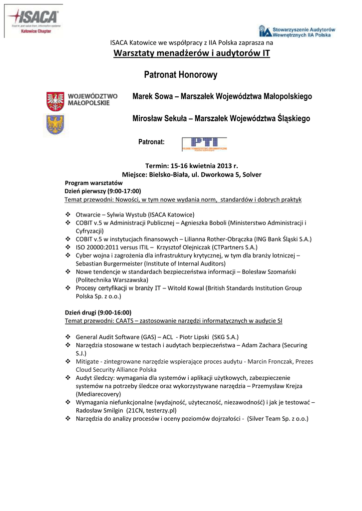 ISACA Katowice we współpracy z IIA Polska zaprasza na Warsztaty menadżerów i audytorów IT Patronat Honorowy Marek Sowa – Marszałek Województwa Małopolskiego Mirosław Sekuła – Marszałek Województwa Śląskiego Patronat: Termin: 15-16 kwietnia 2013 r. Miejsce: Bielsko-Biała, ul. Dworkowa 5, Solver Program warsztatów Dzień pierwszy (9:00-17:00) Temat przewodni: Nowości, w tym nowe wydania norm, standardów i dobrych praktyk Otwarcie – Sylwia Wystub (ISACA Katowice) COBIT v.5 w Administracji Publicznej – Agnieszka Boboli (Ministerstwo Administracji i Cyfryzacji) COBIT v.5 w instytucjach finansowych – Lilianna Rother-Obrączka (ING Bank Śląski S.A.) ISO 20000:2011 versus ITIL – Krzysztof Olejniczak (CTPartners S.A.) Cyber wojna i zagrożenia dla infrastruktury krytycznej, w tym dla branży lotniczej – Sebastian Burgermeister (Institute of Internal Auditors) Nowe tendencje w standardach bezpieczeństwa informacji – Bolesław Szomański (Politechnika Warszawska) Procesy certyfikacji w branży IT – Witold Kowal (British Standards Institution Group Polska Sp. z o.o.) Dzień drugi (9:00-16:00) Temat przewodni: CAATS – zastosowanie narzędzi informatycznych w audycie SI General Audit Software (GAS) – ACL - Piotr Lipski (SKG S.A.) Narzędzia stosowane w testach i audytach bezpieczeństwa – Adam Zachara (Securing S.J.) Mitigate - zintegrowane narzędzie wspierające proces audytu - Marcin Fronczak, Prezes Cloud Security Alliance Polska Audyt śledczy: wymagania dla systemów i aplikacji użytkowych, zabezpieczenie systemów na potrzeby śledcze oraz wykorzystywane narzędzia – Przemysław Krejza (Mediarecovery) Wymagania niefunkcjonalne (wydajność, użyteczność, niezawodność) i jak je testować – Radosław Smilgin (21CN, testerzy.pl) Narzędzia do analizy procesów i oceny poziomów dojrzałości - (Silver Team Sp. z o.o.) Partnerzy British Standards Institution to najstarsza z jednostek certyfikujących systemy zarządzania oraz członek założycielski ISO. Rozwój BSI to zarazem historia jakości, standaryzacji i certyfikacji. Działając na mocy Przywileju Królewskiego, od ponad 110 lat jest czołową firmą działającą w branży opracowywania norm i metod ich stosowania w biznesie. Działalność szkoleniowa BSI obejmuje szereg szkoleń oraz seminariów poświęconych wszystkim certyfikowanym systemom zarządzania, wymaganiom prawnym i rozporządzeniom. testerzy.pl to portal skupiający społeczność testerów oprogramowania. Zawiera kompendium wiedzy oraz najświeższe wieści z branży. Oprócz popularyzowania rozwoju testowania oprogramowania prowadzi także działalność komercyjną, na którą składają się szkolenia, usługi i doradztwo z zakresu testowania oprogramowania. Marka należąca do firmy 21CN Radosław Smilgin, oficjalnego partnera ISTQB. CSA jest globalną organizacją non-profit, której misją jest promowanie najlepszych praktyk i edukacja w zakresie bezpieczeństwa cloud computing. Jest to koalicja praktyków, ekspertów, korporacji, stowarzyszeń z obszaru bezpieczeństwa w chmurze. Organizacja posiada około 30.000 członków i ponad 60 oddziałów na całym świecie. Zarządza programem certyfikacyjnym: Certificate of Cloud Security Knowledge