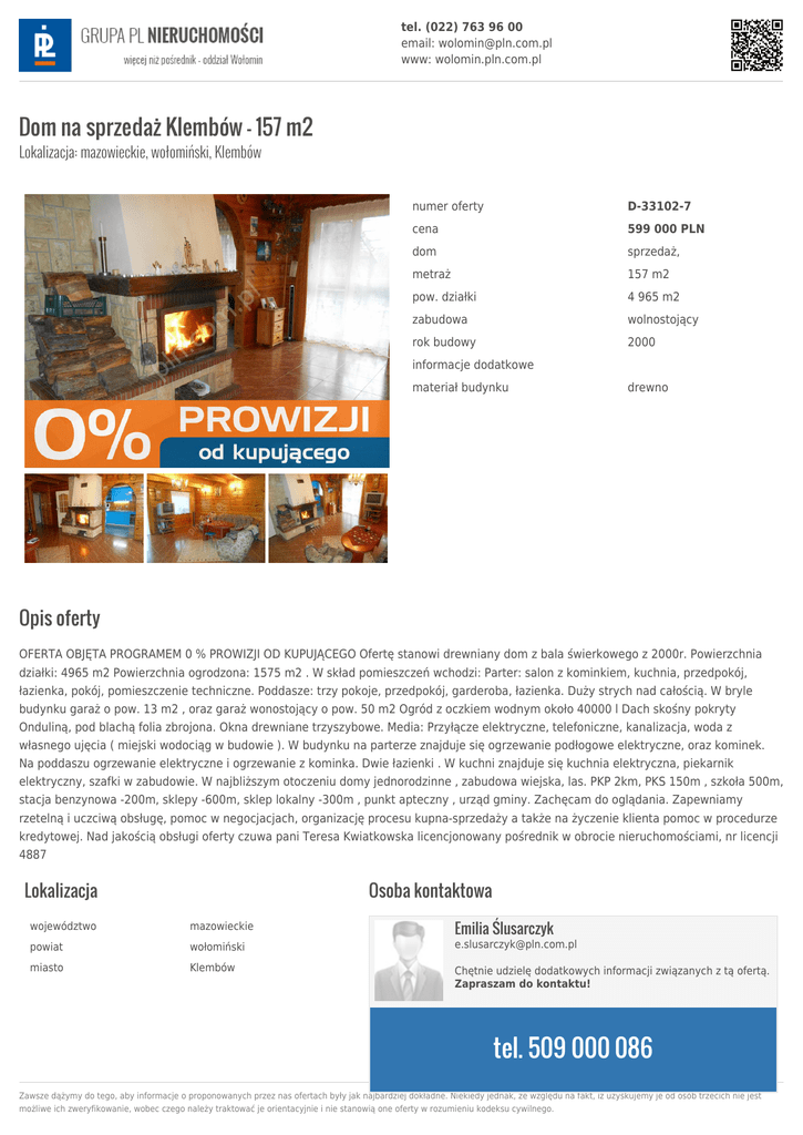 tel. (022) 763 96 00 email: [email protected] www: wolomin.pln.com.pl Dom na sprzedaż Klembów - 157 m2 Lokalizacja: mazowieckie, wołomiński, Klembów numer oferty D-33102-7 cena 599 000 PLN dom sprzedaż, metraż 157 m2 pow. działki 4 965 m2 zabudowa wolnostojący rok budowy 2000 informacje dodatkowe materiał budynku drewno Opis oferty OFERTA OBJĘTA PROGRAMEM 0 % PROWIZJI OD KUPUJĄCEGO Ofertę stanowi drewniany dom z bala świerkowego z 2000r. Powierzchnia działki: 4965 m2 Powierzchnia ogrodzona: 1575 m2 . W skład pomieszczeń wchodzi: Parter: salon z kominkiem, kuchnia, przedpokój, łazienka, pokój, pomieszczenie techniczne. Poddasze: trzy pokoje, przedpokój, garderoba, łazienka. Duży strych nad całością. W bryle budynku garaż o pow. 13 m2 , oraz garaż wonostojący o pow. 50 m2 Ogród z oczkiem wodnym około 40000 l Dach skośny pokryty Onduliną, pod blachą folia zbrojona. Okna drewniane trzyszybowe. Media: Przyłącze elektryczne, telefoniczne, kanalizacja, woda z własnego ujęcia ( miejski wodociąg w budowie ). W budynku na parterze znajduje się ogrzewanie podłogowe elektryczne, oraz kominek. Na poddaszu ogrzewanie elektryczne i ogrzewanie z kominka. Dwie łazienki . W kuchni znajduje się kuchnia elektryczna, piekarnik elektryczny, szafki w zabudowie. W najbliższym otoczeniu domy jednorodzinne , zabudowa wiejska, las. PKP 2km, PKS 150m , szkoła 500m, stacja benzynowa -200m, sklepy -600m, sklep lokalny -300m , punkt apteczny , urząd gminy. Zachęcam do oglądania. Zapewniamy rzetelną i uczciwą obsługę, pomoc w negocjacjach, organizację procesu kupna-sprzedaży a także na życzenie klienta pomoc w procedurze kredytowej. Nad jakością obsługi oferty czuwa pani Teresa Kwiatkowska licencjonowany pośrednik w obrocie nieruchomościami, nr licencji 4887 Lokalizacja Osoba kontaktowa Emilia Ślusarczyk województwo mazowieckie powiat wołomiński [email protected] miasto Klembów Chętnie udzielę dodatkowych informacji związanych z tą ofertą. Zapraszam do kontaktu! tel. 509 000 086 Zawsze dążymy do tego, aby informacje o proponowanych przez nas ofertach były jak najbardziej dokładne. Niekiedy jednak, ze względu na fakt, iż uzyskujemy je od osób trzecich nie jest możliwe ich zweryfikowanie, wobec czego należy traktować je orientacyjnie i nie stanowią one oferty w rozumieniu kodeksu cywilnego.