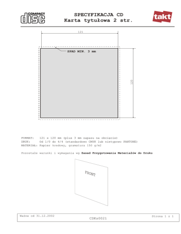 SPECYFIKACJA CD Karta tytułowa 2 str. 121 120 SPAD MIN. 3 mm FORMAT: 121 x 120 mm (plus 3 mm zapasu na obcięcie) DRUK: Od 1/0 do 4/4 (standardowo CMYK lub nietypowo PANTONE) MATERIAŁ: Papier kredowy, gramatura 150 g/m2 Pozostałe warunki i wymagania wg Zasad Przygotowania Materiałów do Druku Ważne od 31.12.2002 CDKs0021 Strona 1 z 1