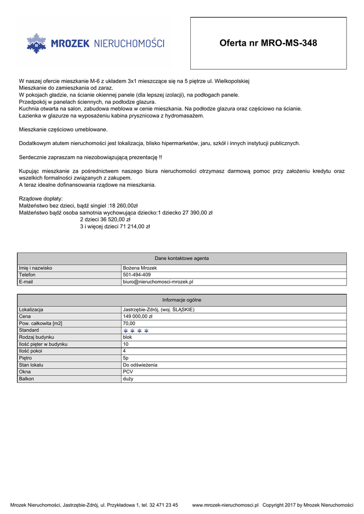 Oferta nr MRO-MS-348 W naszej ofercie mieszkanie M-6 z układem 3x1 mieszczące się na 5 piętrze ul. Wielkopolskiej Mieszkanie do zamieszkania od zaraz. W pokojach gładzie, na ścianie okiennej panele (dla lepszej izolacji), na podłogach panele. Przedpokój w panelach ściennych, na podłodze glazura. Kuchnia otwarta na salon, zabudowa meblowa w cenie mieszkania. Na podłodze glazura oraz częściowo na ścianie. Łazienka w glazurze na wyposażeniu kabina prysznicowa z hydromasażem. Mieszkanie częściowo umeblowane. Dodatkowym atutem nieruchomości jest lokalizacja, blisko hipermarketów, jaru, szkół i innych instytucji publicznych. Serdecznie zapraszam na niezobowiązującą prezentację !! Kupując mieszkanie za pośrednictwem naszego biura nieruchomości otrzymasz darmową pomoc przy założeniu kredytu oraz wszelkich formalności związanych z zakupem. A teraz idealne dofinansowania rządowe na mieszkania. Rządowe dopłaty: Małżeństwo bez dzieci, bądź singiel :18 260,00zł Małżeństwo bądź osoba samotnia wychowująca dziecko:1 dziecko 27 390,00 zł 2 dzieci 36 520,00 zł 3 i więcej dzieci 71 214,00 zł Dane kontaktowe agenta Imię i nazwisko Telefon E-mail Bożena Mrozek 501-494-409 [email protected] Informacje ogólne Lokalizacja Cena Pow. całkowita [m2] Standard Rodzaj budynku Ilość pięter w budynku Ilość pokoi Piętro Stan lokalu Okna Balkon Jastrzębie-Zdrój, (woj. ŚLĄSKIE) 149 000,00 zł 70,00 blok 10 4 5p Do odświeżenia PCV duży Mrozek Nieruchomości, Jastrzębie-Zdrój, ul. Przykładowa 1, tel. 32 471 23 45 www.mrozek-nieruchomosci.pl Copyright 2017 by Mrozek Nieruchomości