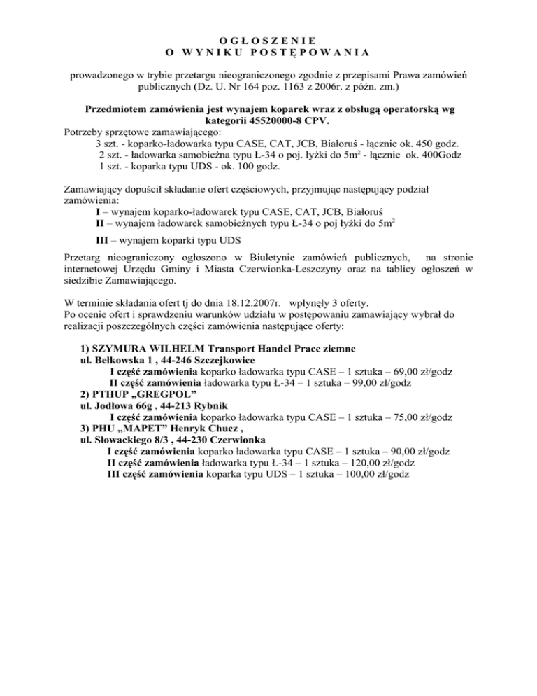 OGŁOSZENIE O WYNIKU POSTĘPOWANIA prowadzonego w trybie przetargu nieograniczonego zgodnie z przepisami Prawa zamówień publicznych (Dz. U. Nr 164 poz. 1163 z 2006r. z późn. zm.) Przedmiotem zamówienia jest wynajem koparek wraz z obsługą operatorską wg kategorii 45520000-8 CPV. Potrzeby sprzętowe zamawiającego: 3 szt. - koparko-ładowarka typu CASE, CAT, JCB, Białoruś - łącznie ok. 450 godz. 2 szt. - ładowarka samobieżna typu Ł-34 o poj. łyżki do 5m2 - łącznie ok. 400Godz 1 szt. - koparka typu UDS - ok. 100 godz. Zamawiający dopuścił składanie ofert częściowych, przyjmując następujący podział zamówienia: I – wynajem koparko-ładowarek typu CASE, CAT, JCB, Białoruś II – wynajem ładowarek samobieżnych typu Ł-34 o poj łyżki do 5m2 III – wynajem koparki typu UDS Przetarg nieograniczony ogłoszono w Biuletynie zamówień publicznych, na stronie internetowej Urzędu Gminy i Miasta Czerwionka-Leszczyny oraz na tablicy ogłoszeń w siedzibie Zamawiającego. W terminie składania ofert tj do dnia 18.12.2007r. wpłynęły 3 oferty. Po ocenie ofert i sprawdzeniu warunków udziału w postępowaniu zamawiający wybrał do realizacji poszczególnych części zamówienia następujące oferty: 1) SZYMURA WILHELM Transport Handel Prace ziemne ul. Bełkowska 1 , 44-246 Szczejkowice I część zamówienia koparko ładowarka typu CASE – 1 sztuka – 69,00 zł/godz II część zamówienia ładowarka typu Ł-34 – 1 sztuka – 99,00 zł/godz 2) PTHUP „GREGPOL” ul. Jodłowa 66g , 44-213 Rybnik I część zamówienia koparko ładowarka typu CASE – 1 sztuka – 75,00 zł/godz 3) PHU „MAPET” Henryk Chucz , ul. Słowackiego 8/3 , 44-230 Czerwionka I część zamówienia koparko ładowarka typu CASE – 1 sztuka – 90,00 zł/godz II część zamówienia ładowarka typu Ł-34 – 1 sztuka – 120,00 zł/godz III część zamówienia koparka typu UDS – 1 sztuka – 100,00 zł/godz