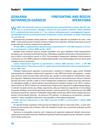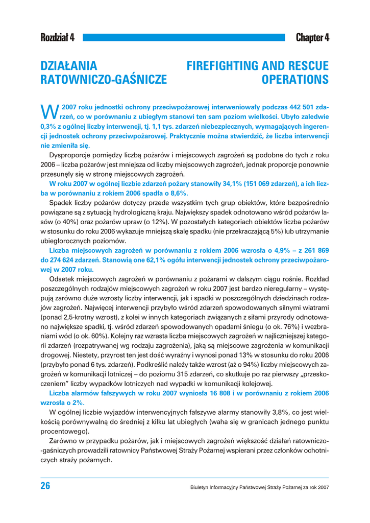 Rozdzia³ 4 DZIA£ANIA RATOWNICZO-GAŒNICZE Chapter 4 FIREFIGHTING AND RESCUE OPERATIONS W 2007 roku jednostki ochrony przeciwpo¿arowej interweniowa³y podczas 442 501 zdarzeñ, co w porównaniu z ubieg³ym stanowi ten sam poziom wielkoœci. Uby³o zaledwie 0,3% z ogólnej liczby interwencji, tj. 1,1 tys. zdarzeñ niebezpiecznych, wymagaj¹cych ingerencji jednostek ochrony przeciwpo¿arowej. Praktycznie mo¿na stwierdziæ, ¿e liczba interwencji nie zmieni³a siê. Dysproporcje pomiêdzy liczb¹ po¿arów i miejscowych zagro¿eñ s¹ podobne do tych z roku 2006 – liczba po¿arów jest mniejsza od liczby miejscowych zagro¿eñ, jednak proporcje ponownie przesunê³y siê w stronê miejscowych zagro¿eñ. W roku 2007 w ogólnej liczbie zdarzeñ po¿ary stanowi³y 34,1% (151 069 zdarzeñ), a ich liczba w porównaniu z rokiem 2006 spad³a o 8,6%. Spadek liczby po¿arów dotyczy przede wszystkim tych grup obiektów, które bezpoœrednio powi¹zane s¹ z sytuacj¹ hydrologiczn¹ kraju. Najwiêkszy spadek odnotowano wœród po¿arów lasów (o 40%) oraz po¿arów upraw (o 12%). W pozosta³ych kategoriach obiektów liczba po¿arów w stosunku do roku 2006 wykazuje mniejsz¹ skalê spadku (nie przekraczaj¹c¹ 5%) lub utrzymanie ubieg³orocznych poziomów. Liczba miejscowych zagro¿eñ w porównaniu z rokiem 2006 wzros³a o 4,9% – z 261 869 do 274 624 zdarzeñ. Stanowi¹ one 62,1% ogó³u interwencji jednostek ochrony przeciwpo¿arowej w 2007 roku. Odsetek miejscowych zagro¿eñ w porównaniu z po¿arami w dalszym ci¹gu roœnie. Rozk³ad poszczególnych rodzajów miejscowych zagro¿eñ w roku 2007 jest bardzo nieregularny – wystêpuj¹ zarówno du¿e wzrosty liczby interwencji, jak i spadki w poszczególnych dziedzinach rodzajów zagro¿eñ. Najwiêcej interwencji przyby³o wœród zdarzeñ spowodowanych silnymi wiatrami (ponad 2,5-krotny wzrost), z kolei w innych kategoriach zwi¹zanych z si³ami przyrody odnotowano najwiêksze spadki, tj. wœród zdarzeñ spowodowanych opadami œniegu (o ok. 76%) i wezbraniami wód (o ok. 60%). Kolejny raz wzrasta liczba miejscowych zagro¿eñ w najliczniejszej kategorii zdarzeñ (rozpatrywanej wg rodzaju zagro¿enia), jak¹ s¹ miejscowe zagro¿enia w komunikacji drogowej. Niestety, przyrost ten jest doœæ wyraŸny i wynosi ponad 13% w stosunku do roku 2006 (przyby³o ponad 6 tys. zdarzeñ). Podkreœliæ nale¿y tak¿e wzrost (a¿ o 94%) liczby miejscowych zagro¿eñ w komunikacji lotniczej – do poziomu 315 zdarzeñ, co skutkuje po raz pierwszy „przeskoczeniem” liczby wypadków lotniczych nad wypadki w komunikacji kolejowej. Liczba alarmów fa³szywych w roku 2007 wynios³a 16 808 i w porównaniu z rokiem 2006 wzros³a o 2%. W ogólnej liczbie wyjazdów interwencyjnych fa³szywe alarmy stanowi³y 3,8%, co jest wielkoœci¹ porównywaln¹ do œredniej z kilku lat ubieg³ych (waha siê w granicach jednego punktu procentowego). Zarówno w przypadku po¿arów, jak i miejscowych zagro¿eñ wiêkszoœæ dzia³añ ratowniczo-gaœniczych prowadzili ratownicy Pañstwowej Stra¿y Po¿arnej wspierani przez cz³onków ochotniczych stra¿y po¿arnych. 26 Biuletyn Informacyjny Pañstwowej Stra¿y Po¿arnej za rok 2007 Rozdzia³ 4 Chapter 4 W 2007 r. w dzia³aniach ratowniczych udzia³ bra³o ogó³em 1486 tys. stra¿aków PSP, co w porównaniu z rokiem 2006 stanowi wzrost zaanga¿owania stra¿aków PSP o 8%. W analizowanym okresie spad³o zaanga¿owanie stra¿aków OSP podczas gaszenia po¿arów (œrednio o ok. 23%), co jest zapewne wynikiem wspomnianego wczeœniej du¿ego spadku liczby po¿arów lasów i upraw „obs³ugiwanych” najczêœciej przez jednostki OSP lub przy ich wydatnym wspó³udziale. Wzros³o natomiast wykorzystanie stra¿aków OSP (jednak tylko tych z jednostek w³¹czonych do KSRG) podczas likwidacji miejscowych zagro¿eñ (wzrost o ok. 8%). Podsumowuj¹c, w dzia³aniach ratowniczych udzia³ bra³o 750 tys. stra¿aków OSP jednostek w³¹czonych do KSRG i 260 tys. stra¿aków OSP spoza systemu. Ogó³em w akcjach ratowniczo-gaœniczych uczestniczy³o 1100 tys. stra¿aków-ochotników. W 2007 roku w akcjach ratowniczych zginê³o 2 ratowników (dla porównania – 3 w roku 2006), a 609 odnios³o obra¿enia (540 w 2006 roku). Uwaga Dane liczbowe na podstawie programu EWID. Charakterystyczne zdarzenia Po¿ary 7.01.2007 r. w Kêdzierzynie KoŸlu (woj. opolskie) dosz³o do awarii instalacji naftalenu i po¿aru hali magazynowej w zak³adzie przemys³owym. Po¿ar obj¹³ ca³¹ halê magazynow¹ o powierzchni 1500 m2, w której znajdowa³o siê oko³o 80 ton p³atków naftalenu. W dzia³aniach ratowniczo-gaœniczych udzia³ bra³o 12 zastêpów PSP, 8 zastêpów OSP oraz 3 jednostki zak³adowej ochrony przeciwpo¿arowej. 10.01.2007 r. w S³ubicach (woj. lubuskie) wybuch³ po¿ar na targowisku miejskim. W wyniku zdarzenia spaleniu uleg³o ca³e targowisko o powierzchni 16 000 m2, oko³o 1000 stoisk handlowych. Dzia³ania utrudnia³ silny wiatr oraz ³atwopalna konstrukcja i zawartoœæ stoisk. W dzia³aniach ratowniczo-gaœniczych udzia³ bra³o 11 zastêpów PSP, 5 jednostek OSP, 4 jednostki OSP spoza KSRG (39 osób) oraz 11 jednostek ze stra¿y po¿arnej z Frankfurtu (dysponowanych przez KP PSP S³ubice na podstawie lokalnych porozumieñ). 7.02.2007 r. w Boles³awcu (woj. ³ódzkie) w zabytkowym budynku hotelowo-restauracyjnym „Stary M³yn” wybuch³ po¿ar. W wyniku zdarzenia 3 osoby ponios³y œmieræ. Dzia³ania ratowniczo-gaœnicze prowadzi³o 11 zastêpów PSP oraz 11 zastêpów OSP. 28.02.2007 r. w Krakowie (woj. wielkopolskie) wybuch³ po¿ar w budynku mieszkalnym, w wyniku którego œmieræ ponios³o 5 osób. W akcji udzia³ bra³o 13 zastêpów PSP. 15.03.2007 r. w Toruniu (woj. kujawsko-pomorskie) mia³ miejsce po¿ar zabytkowych kamienic w centrum miasta. Spaleniu i zniszczeniu uleg³a konstrukcja dachowa, stropy budynku oraz wyposa¿enie pomieszczeñ na poziomie piwnicy, parteru i piêtra. W dzia³aniach ratowniczo-gaœniczych br
