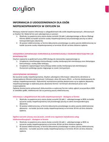 INFORMACJA O UDOGODNIENIACH DLA OSÓB NIEPEŁNOSPRAWNYCH W OXYLION SA Niniejszy materiał zawiera informacje o udogodnieniach dla osób niepełnosprawnych, oferowanych w Oxylion SA. Materiał ten jest udostępniany w postaci: 1. Wydruku na papierze przy użyciu dużej czcionki (16 pkt.) udostępnianego w Biurze Obsługi Klienta (BOK) na każde życzenie osoby niepełnosprawnej lub przesłanego pocztą na adres korespondencyjny abonenta. 2. W postaci elektronicznej, w formie dokumentu przesłanego na adres poczty elektronicznej na każde życzenie osoby niepełnosprawnej w terminie 30 dni od dnia złożenia żądania. URZĄDZENIA ZAPEWNIAJĄCE KOMUNIKACJĘ AUDIOWIZUALNĄ Z OSOBAMI NIESŁYSZĄCYMI LUB NIEMÓWIĄCYMI Oxylion zapewnia w godzinach pracy BOK dostęp do stanowiska wyposażonego w: 1. Urządzenie umożliwiające komunikację z osobą niesłyszącą lub niemówiącą oraz ułatwiające komunikację z osobą słabo widzącą. 2. Urządzenie zapewniające komunikację wideo osoby niesłyszącej lub niemówiącej z tłumaczem polskiego języka migowego w czasie rzeczywistym. UDOSTĘPNIENIE INFORMACJI Na życzenie osoby niepełnosprawnej, Oxylion udostępnia informacje i dokumenty określone w rozporządzeniu Ministra Administracji i Cyfryzacji z dnia 26 marca 2014 r. w formie dostosowanej do rodzaju niepełnosprawności. Dokumenty wymienione poniżej dostarczane są na żądanie abonenta niepełnosprawnego w wybranej przez abonenta formie i terminach określonych przez w/w rozporządzenie. Żądanie dostarczenia wskazanych dokumentów w wybranej formie należy zgłosić pracownikom BOK w siedzibie spółki, telefonicznie lub za pomocą poczty elektronicznej. Informacja o udogodnieniach dla osób niepełnosprawnych - dostępna w formie: 1. Wydruku na papierze przy użyciu dużej czcionki (16 pkt.) - udostępnianego w BOK na każde życzenie osoby niepełnosprawnej lub przesłanego pocztą na adres korespondencyjny abonenta. 2. W postaci elektronicznej, w formie dokumentu przesłanego na adres poczty elektronicznej abonenta - na każde życzenie osoby niepełnosprawnej w terminie 30 dni od dnia złożenia żądania. Ogólne warunki umowy oraz jej wzór, cennik oraz regulamin świadczenia usług telekomunikacyjnych - dostępne w formie: 1. Wydruku na papierze przy użyciu dużej czcionki (16 pkt.) - udostępnianego w BOK na życzenie osoby niepełnosprawnej w terminie 30 dni od dnia złożenia żądania. 2. W postaci elektronicznej, w formie dokumentu przesłanego na adres poczty elektronicznej abonenta - na każde życzenie osoby niepełnosprawnej w terminie 30 dni od dnia złożenia żądania. 3. Na papierze w formie wydruku przy użyciu dużej czcionki (16 pkt.) przesłanego na adres korespondencyjny abonenta - na każde życzenie osoby niepełnosprawnej w terminie 30 dni od dnia złożenia żądania. Informacje o danych zawartych na fakturze wraz z podstawowym wykazem wykonanych usług telekomunikacyjnych: 1. W postaci elektronicznej, w formie dokumentu przesłanego na adres poczty elektronicznej abonenta. 2. Na papierze w formie wydruku przy użyciu dużej czcionki (16 pkt.) przesłanego na adres korespondencyjny abonenta. 3. Dokumenty wymienione w punktach od 1 i 2 udostępniane są na każde żądanie niepełnosprawnego abonenta, przy czym: a. Jeżeli żądanie zgłoszono przed rozpoczęciem lub w trakcie okresu rozliczeniowego, za który będzie wystawiona faktura – Oxylion realizuje żądanie niezwłocznie po wystawieniu faktury. b. Jeżeli żądanie dotyczy okresu rozliczeniowego, za który została już wystawiona faktura – Oxylion realizuje żądanie w terminie 30 dni od dnia jego zgłoszenia. Szczegółowy wykaz wykonanych usług telekomunikacyjnych: 1. W postaci elektronicznej, w formie dokumentu przesłanego na adres poczty elektronicznej abonenta. 2. Na papierze w formie wydruku przy użyciu dużej czcionki (16 pkt.) przesłanego na adres korespondencyjny abonenta. TELEKOMUNIKACYJNE URZĄDZENIA KOŃCOWE Na życzenie osoby niepełnosprawnej, Oxylion oferuje telekomunikacyjne urządzenia końcowe, niezbędne do zapewnienia dostępu do świadczonej usługi telefonicznej, przystosowane do używania przez osoby niepełnosprawne w następującym zakresie: 1. Modele posiadające klawiaturę wybierczą - urządzenia wyposażone w co najmniej jeden przycisk wyróżniony w sposób umożliwiający jego rozpoznanie przez osoby niewidome i słabowidzące (w przypadku wyróżnienia tylko jednego przycisku jest to przycisk oznaczony cyfrą pięć) lub równoważną funkcjonalność umożliwiającą wybranie określonego numeru. 2. Urządzenia umożliwiające szybkie wybieranie numeru. POMOC W SKONFIGUROWANIU URZĄDZENIA KOŃCOWEGO Na życzenie osoby niepełnosprawnej pracownicy BOK oferują pomoc we właściwym skonfigurowaniu urządzenia końcowego lub uruchomieniu świadczonej usługi telefonicznej. Pomoc świadczona jest w BOK lub telefonicznie.