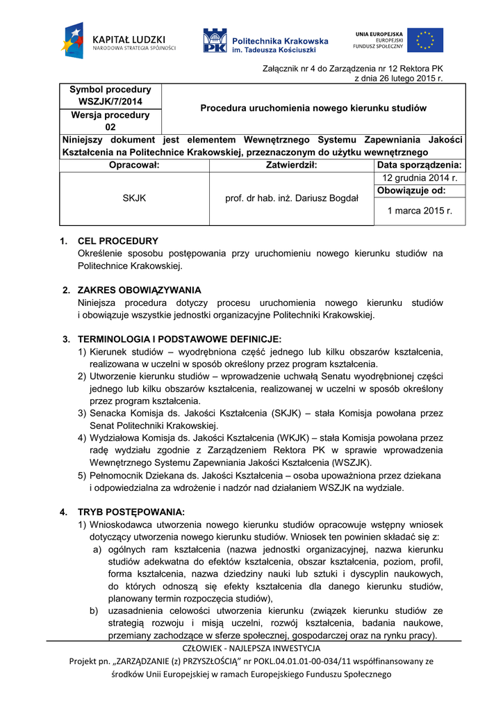 Załącznik nr 4 do Zarządzenia nr 12 Rektora PK z dnia 26 lutego 2015 r. Symbol procedury WSZJK/7/2014 Procedura uruchomienia nowego kierunku studiów Wersja procedury 02 Niniejszy dokument jest elementem Wewnętrznego Systemu Zapewniania Jakości Kształcenia na Politechnice Krakowskiej, przeznaczonym do użytku wewnętrznego Opracował: Zatwierdził: Data sporządzenia: 12 grudnia 2014 r. Obowiązuje od: SKJK prof. dr hab. inż. Dariusz Bogdał 1 marca 2015 r. 1. CEL PROCEDURY Określenie sposobu postępowania przy uruchomieniu nowego kierunku studiów na Politechnice Krakowskiej. 2. ZAKRES OBOWIĄZYWANIA Niniejsza procedura dotyczy procesu uruchomienia nowego kierunku i obowiązuje wszystkie jednostki organizacyjne Politechniki Krakowskiej. studiów 3. TERMINOLOGIA I PODSTAWOWE DEFINICJE: 1) Kierunek studiów – wyodrębniona część jednego lub kilku obszarów kształcenia, realizowana w uczelni w sposób określony przez program kształcenia. 2) Utworzenie kierunku studiów – wprowadzenie uchwałą Senatu wyodrębnionej części jednego lub kilku obszarów kształcenia, realizowanej w uczelni w sposób określony przez program kształcenia. 3) Senacka Komisja ds. Jakości Kształcenia (SKJK) – stała Komisja powołana przez Senat Politechniki Krakowskiej. 4) Wydziałowa Komisja ds. Jakości Kształcenia (WKJK) – stała Komisja powołana przez radę wydziału zgodnie z Zarządzeniem Rektora PK w sprawie wprowadzenia Wewnętrznego Systemu Zapewniania Jakości Kształcenia (WSZJK). 5) Pełnomocnik Dziekana ds. Jakości Kształcenia – osoba upoważniona przez dziekana i odpowiedzialna za wdrożenie i nadzór nad działaniem WSZJK na wydziale. 4. TRYB POSTĘPOWANIA: 1) Wnioskodawca utworzenia nowego kierunku studiów opracowuje wstępny wniosek dotyczący utworzenia nowego kierunku studiów. Wniosek ten powinien składać się z: a) ogólnych ram kształcenia (nazwa jednostki organizacyjnej, nazwa kierunku studiów adekwatna do efektów kształcenia, obszar kształcenia, poziom, profil, forma kształcenia, nazwa dziedziny nauki lub sztuki i dyscyplin naukowych, do których odnoszą się efekty kształcenia dla danego kierunku studiów, planowany termin rozpoczęcia studiów), b) uzasadnienia celowości utworzenia kierunku (związek kierunku studiów ze strategią rozwoju i misją uczelni, rozwój kształcenia, badania naukowe, przemiany zachodzące w sferze społecznej, gospodarczej oraz na rynku pracy). CZŁOWIEK - NAJLEPSZA INWESTYCJA Projekt pn. „ZARZĄDZANIE (z) PRZYSZŁOŚCIĄ” nr POKL.04.01.01-00-034/11 współfinansowany ze środków Unii Europejskiej w ramach Europejskiego Funduszu Społecznego 2) Przygotowany wniosek wnioskodawca utworzenia kierunku studiów przedkłada do akceptacji dziekanowi za pośrednictwem kierownika jednostki odpowiedzialnej za organizację i prowadzenie kształcenia na tworzonym kierunku. 3) Dziekan i kierownik jednostki odpowiedzialnej za organizację i prowadzenie kształcenia na tworzonym kierunku oceniają projekt nowego kierunku studiów. 4) W przypadku akceptacji projektu dziekan przedstawia projekt utworzenia kierunku studiów na posiedzeniu rady wydziału. 5) Rada wydziału na wniosek dziekana podejmuje uchwałę w sprawie tworzenia nowego kierunku studiów na określonym poziomie i profilu kształcenia i powołuje opiekuna kierunku. 6) W celu opracowania programu kształcenia dla nowo tworzonego kierunku dziekan wnioskuje o powołanie rady programowej. Zaproponowany przez dziekana skład rady programowej zatwierdza rada wydziału. 7) Rada programowa przygotowuje program kształcenia dla danego kierunku, poziomu i profilu kształcenia zgodnie z wymogami określonymi w uchwale Senatu PK nr 64/d/11/2011 z 25 listopada 2011 r. w sprawie wytycznych Senatu PK dla rad wydziałów, dotyczących programu kształcenia. Bieżącą kontrolę pracy rady programowej prowadzi dziekan wydziału. 8) Opracowany przez radę programową projekt programu kształcenia na nowym kierunku studiów opiniuje Wydziałowa Komisja ds. Dydaktyki. 9) Dziekan przekazuje radzie wydziału projekt programu kształcenia na nowym kierunku studiów. Rada wydziału podejmuje uchwały w sprawie przyjęcia programu studiów i w sprawie przyjęcia projektu efektów kształcenia. 10) Za opracowanie wniosku o utworzenie kierunku studiów odpowiedzialny jest dziekan wydziału. Wniosek powinien zawierać: a) nazwę jednostki organizacyjnej, b) nazwę kierunku studiów w języku polskim i angielskim, c) określenie poziomu i profilu kształcenia oraz formy studiów, d) uzasadnienie związku kierunku studiów ze strategią rozwoju, w tym misją uczelni, e) przyporządkowanie kierunku studiów do obszaru lub obszarów kształcenia określonych w przepisach wydanych na podstawie art. 9 ust. 1 pkt 2 ustawy Prawo o szkolnictwie wyższym (rozporządzenie Ministra Nauki i Szkolnictwa Wyższego z dnia 2 listopada 2011 r. w sprawie Krajowych Ram Kwalifikacji dla Szkolnictwa Wyższego – Dz.U. Nr 253, poz. 1520), f) nazwę dziedziny nauki lub sztuki i wskazanie dyscyplin naukowych, do których odnoszą się efekty kształcenia dla tworzonego kierunku studiów, g) program kształcenia dla nowo tworzonego kierunku, poziomu i profilu kształcenia, h) udokumentowanie prowadzenia badań naukowych w dziedzinie nauki związanej z kierunkiem studiów oraz sposobu zapewnienia studentom przygotowania do prowadzenia badań (studia I stopnia) oraz udziału w badaniach (studia II stopnia), i) udokumentowanie spełnienia wymagań dotyczących kwalifikacji i minimalnej liczby nauczycieli akademickich zaliczanych do minimum kadrowego tworzonego kierunku studiów określonych w art. 9a ustawy z dnia 27 lipca 2005 r. Prawo o szkolnictwie wyższym (Dz.U. z 2012 r. poz. 572, z późn. zm.) oraz w Rozporządzeniu Ministra Nauki i Szkolnictwa Wyższego w sprawie warunków prowadzenia studiów na określonym kierunku i poziomie kształcenia, CZŁOWIEK - NAJLEPSZA INWESTYCJA Projekt pn. „ZARZĄDZANIE (z) PR
