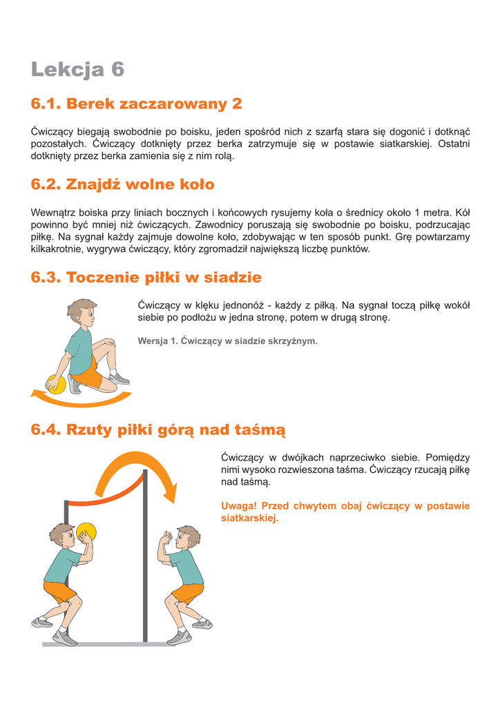 Lekcja 6 6.1. Berek zaczarowany 2 Ćwiczący biegają swobodnie po boisku, jeden spośród nich z szarfą stara się dogonić i dotknąć pozostałych. Ćwiczący dotknięty przez berka zatrzymuje się w postawie siatkarskiej. Ostatni dotknięty przez berka zamienia się z nim rolą. 6.2. Znajdź wolne koło Wewnątrz boiska przy liniach bocznych i końcowych rysujemy koła o średnicy około 1 metra. Kół powinno być mniej niż ćwiczących. Zawodnicy poruszają się swobodnie po boisku, podrzucając piłkę. Na sygnał każdy zajmuje dowolne koło, zdobywając w ten sposób punkt. Grę powtarzamy kilkakrotnie, wygrywa ćwiczący, który zgromadził największą liczbę punktów. 6.3. Toczenie piłki w siadzie Ćwiczący w klęku jednonóż - każdy z piłką. Na sygnał toczą piłkę wokół siebie po podłożu w jedna stronę, potem w drugą stronę. Wersja 1. Ćwiczący w siadzie skrzyżnym. 6.4. Rzuty piłki górą nad taśmą Ćwiczący w dwójkach naprzeciwko siebie. Pomiędzy nimi wysoko rozwieszona taśma. Ćwiczący rzucają piłkę nad taśmą. Uwaga! Przed chwytem obaj ćwiczący w postawie siatkarskiej. 6.5. Wyścig z podaniem piłki Ćwiczący podzieleni na dwie drużyny ustawione na linii końcowej i środkowej boiska. Każda drużyna podzielona na dwa rzędy ustawione po przeciwnych stronach boiska - pierwsi w rzędzie z piłką. Pierwsi ćwiczący biegną do przeciwnego rzędu (1), podają piłkę pierwszemu w rzędzie i biegną na koniec rzędu (2). Następni ćwiczący powtarzają zadanie. Wygrywa drużyna, której wszyscy ćwiczący przebiegną z piłką do przeciwnego rzędu. 1 Wersja 1. Drużyny ustawione na liniach bocznych boiska. 2 1 2 6.6. Wyścig z rzutem do kapitana nad taśmą Ćwiczący podzieleni na dwie drużyny, ustawione w rzędach. Przed każdym rzędem kapitan. Pomiędzy rzędem a kapitanem rozwieszona taśma. Na sygnał pierwszy w rzędzie oburącz rzuca piłkę nad taśmą do kapitana. Kapitan chwyta piłkę i rzuca nad taśmą do następnego ćwiczącego. Wygrywa drużyna, która pierwsza wykona zadanie. Wersja 1. Pomiędzy rzędami rozwieszone dwie taśmy. Ćwiczący rzucają piłkę pomiędzy taśmami. 6.7. Chwytanie piłki po rzucie nad rozciągniętą taśmą Ćwiczący ustawieni w dwóch rzędach, naprzeciwko rozciągniętej taśmy, każdy z piłką. Pomiędzy rzędami stoi nauczyciel. Pierwszy ćwiczący w rzędzie podaje piłkę nauczycielowi (1), biegnie pod taśmą w kierunku przeciwnego boiska (2), w tym czasie nauczyciel rzuca piłkę nad taśmą na drugie boisko (3). Ćwiczący chwyta piłkę i wraca na koniec swojego rzędu (4). Ćwiczący z drugiego rzędu podaje piłkę nauczycielowi i wykonuje to samo zadanie. 4 1 3 Uwaga! Rzucaj piłkę oburącz od dołu. 2 Wersja 1. Ćwiczący mogą chwytać piłkę po odbiciu od podłoża. Wersja 2. Rzucaj piłkę w różne miejsca na przeciwnym boisku. 6.8. Rzucanka siatkarska po odbiciu od podłoża Ćwiczący podzieleni na dwie drużyny ustawione dowolnie na boisku przedzielonym elastyczną taśmą. Grę rozpoczynają kapitanowie, rzucając jednocześnie piłki nad taśmą w kierunku boiska przeciwnika. Punkt zdobywa drużyna, gdy dwie piłki znajdą się na boisku przeciwnika. Uwaga! Przed chwytem i rzutem piłka musi odbić się od podłoża.