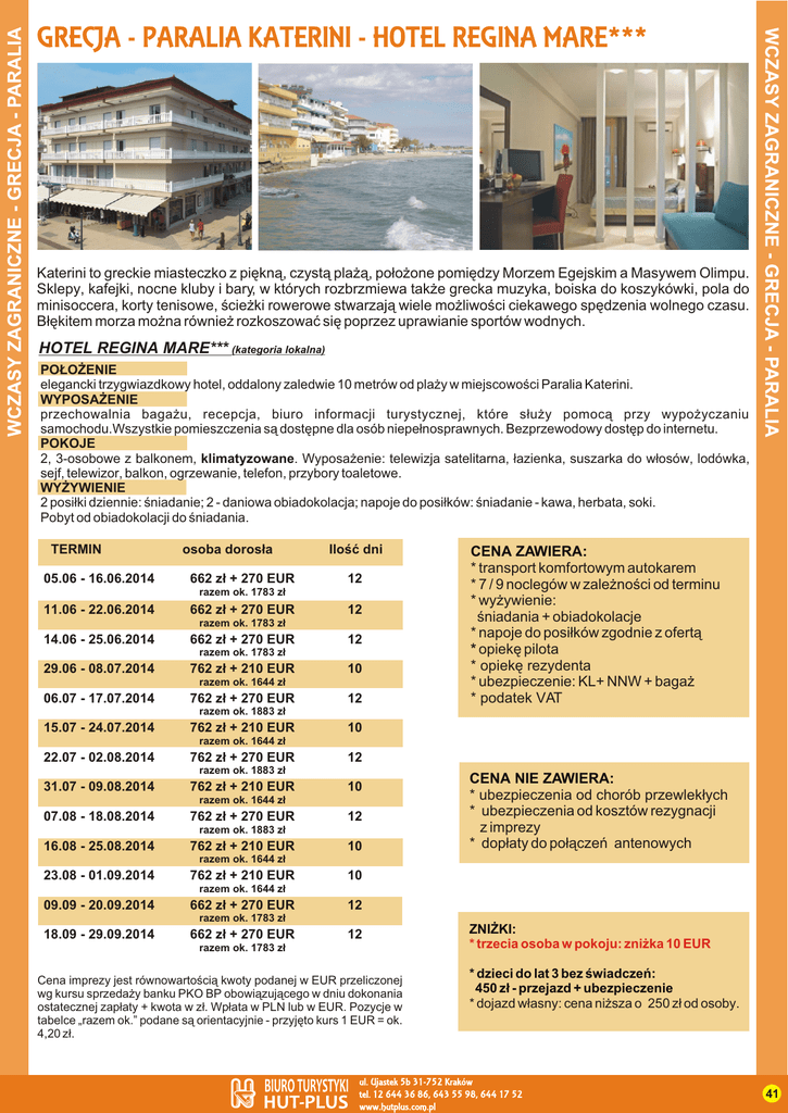 Katerini to greckie miasteczko z piêkn¹, czyst¹ pla¿¹, po³o¿one pomiêdzy Morzem Egejskim a Masywem Olimpu. Sklepy, kafejki, nocne kluby i bary, w których rozbrzmiewa tak¿e grecka muzyka, boiska do koszykówki, pola do minisoccera, korty tenisowe, œcie¿ki rowerowe stwarzaj¹ wiele mo¿liwoœci ciekawego spêdzenia wolnego czasu. B³êkitem morza mo¿na równie¿ rozkoszowaæ siê poprzez uprawianie sportów wodnych. HOTEL REGINA MARE*** (kategoria lokalna) PO£O¯ENIE elegancki trzygwiazdkowy hotel, oddalony zaledwie 10 metrów od pla¿y w miejscowoœci Paralia Katerini. WYPOSA¯ENIE przechowalnia baga¿u, recepcja, biuro informacji turystycznej, które s³u¿y pomoc¹ przy wypo¿yczaniu samochodu.Wszystkie pomieszczenia s¹ dostêpne dla osób niepe³nosprawnych. Bezprzewodowy dostêp do internetu. POKOJE 2, 3-osobowe z balkonem, klimatyzowane. Wyposa¿enie: telewizja satelitarna, ³azienka, suszarka do w³osów, lodówka, sejf, telewizor, balkon, ogrzewanie, telefon, przybory toaletowe. WY¯YWIENIE 2 posi³ki dziennie: œniadanie; 2 - daniowa obiadokolacja; napoje do posi³ków: œniadanie - kawa, herbata, soki. Pobyt od obiadokolacji do œniadania. TERMIN 05.06 - 16.06.2014 osoba doros³a 662 z³ + 270 EUR Iloœæ dni 12 razem ok. 1783 z³ 11.06 - 22.06.2014 662 z³ + 270 EUR 12 razem ok. 1783 z³ 14.06 - 25.06.2014 662 z³ + 270 EUR 12 razem ok. 1783 z³ 29.06 - 08.07.2014 762 z³ + 210 EUR 10 razem ok. 1644 z³ 06.07 - 17.07.2014 762 z³ + 270 EUR 12 CENA ZAWIERA: * transport komfortowym autokarem * 7 / 9 noclegów w zale¿noœci od terminu * wy¿ywienie: œniadania + obiadokolacje * napoje do posi³ków zgodnie z ofert¹ * opiekê pilota * opiekê rezydenta * ubezpieczenie: KL+ NNW + baga¿ * podatek VAT razem ok. 1883 z³ 15.07 - 24.07.2014 762 z³ + 210 EUR 10 razem ok. 1644 z³ 22.07 - 02.08.2014 762 z³ + 270 EUR 12 razem ok. 1883 z³ 31.07 - 09.08.2014 762 z³ + 210 EUR 07.08 - 18.08.2014 762 z³ + 270 EUR 10 razem ok. 1644 z³ 12 razem ok. 1883 z³ 16.08 - 25.08.2014 762 z³ + 210 EUR 10 CENA NIE ZAWIERA: * ubezpieczenia od chorób przewlek³ych * ubezpieczenia od kosztów rezygnacji z imprezy * dop³aty do po³¹czeñ antenowych razem ok. 1644 z³ 23.08 - 01.09.2014 762 z³ + 210 EUR 10 razem ok. 1644 z³ 09.09 - 20.09.2014 662 z³ + 270 EUR 12 razem ok. 1783 z³ 18.09 - 29.09.2014 662 z³ + 270 EUR 12 razem ok. 1783 z³ Cena imprezy jest równowartoœci¹ kwoty podanej w EUR przeliczonej wg kursu sprzeda¿y banku PKO BP obowi¹zuj¹cego w dniu dokonania ostatecznej zap³aty + kwota w z³. Wp³ata w PLN lub w EUR. Pozycje w tabelce „razem ok.” podane s¹ orientacyjnie - przyjêto kurs 1 EUR = ok. 4,20 z³. ZNI¯KI: * trzecia osoba w pokoju: zni¿ka 10 EUR * dzieci do lat 3 bez œwiadczeñ: 450 z³ - przejazd + ubezpieczenie * dojazd w³asny: cena ni¿sza o 250 z³ od osoby. 41