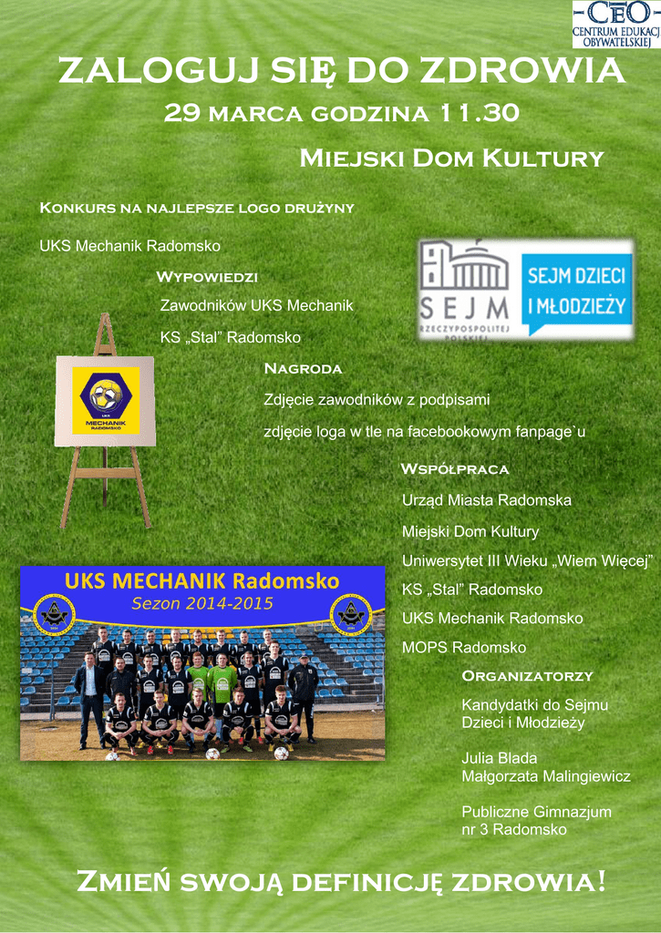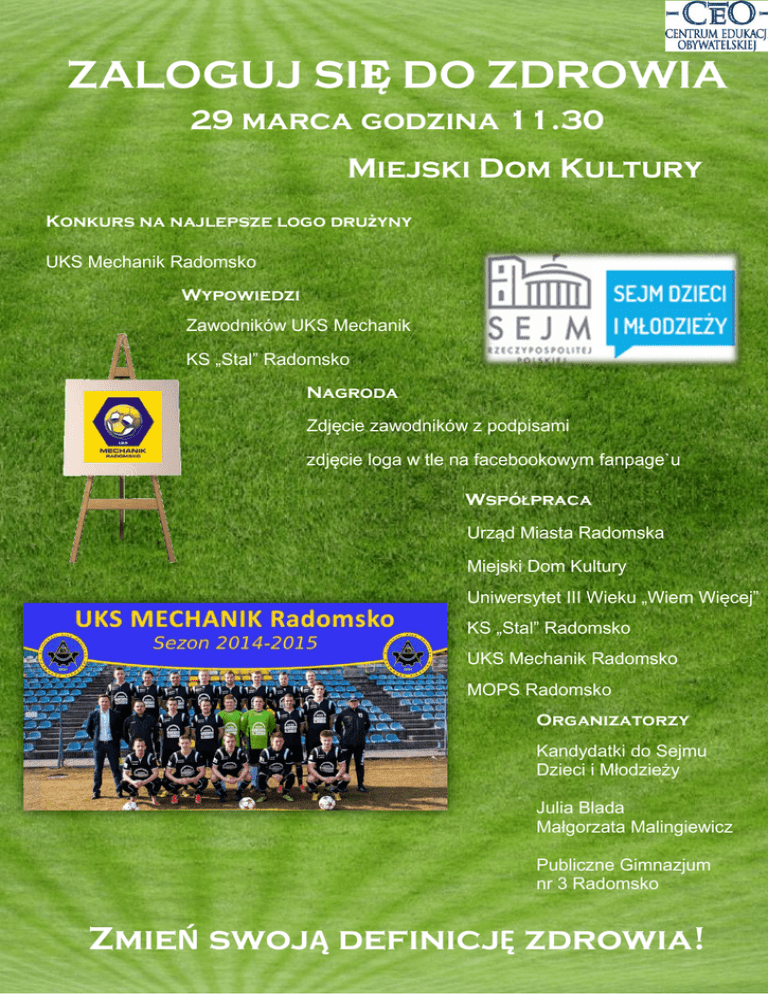 ZALOGUJ SIĘ DO ZDROWIA 29 marca godzina 11.30 Miejski Dom Kultury Konkurs na najlepsze logo drużyny UKS Mechanik Radomsko Wypowiedzi Zawodników UKS Mechanik KS „Stal” Radomsko Nagroda Zdjęcie zawodników z podpisami zdjęcie loga w tle na facebookowym fanpage`u WspóŁpraca Urząd Miasta Radomska Miejski Dom Kultury Uniwersytet III Wieku „Wiem Więcej” KS „Stal” Radomsko UKS Mechanik Radomsko MOPS Radomsko Organizatorzy Kandydatki do Sejmu Dzieci i Młodzieży Julia Blada Małgorzata Malingiewicz Publiczne Gimnazjum nr 3 Radomsko ZmieŃ swojĄ definicjĘ zdrowia!