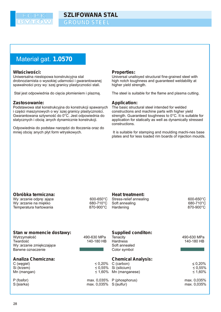 FCPK SZLIFOWANA STAL GROUND STEEL Materiał gat. 1.0570 Właściwości: Properties: Uniwersalna niestopowa konstrukcyjna stal drobnoziarnista o wysokiej udarności i gwarantowanej spawalności przy wyższej granicy plastyczności stali. Universal unalloyed structural fine-grained steel with high notch toughness and guaranteed weldability at higher yield strength. Stal jest odpowiednia do cięcia płomieniem i plazmą. The steel is suitable for the flame and plasma cutting. Zastosowanie: Application: Podstawowa stal konstrukcyjna do konstrukcji spawanych i części maszynowych o wyższej granicy plastyczności. Gwarantowana sztywność do 0°C. Jest odpowiednia do statycznych i obciążanych dynamicznie konstrukcji. The basic structural steel intended for welded constructions and machine parts with higher yield strength. Guaranteed toughness to 0°C. It is suitable for application for statically as well as dynamically stressed constructions. Odpowiednia do podstaw narzędzi do tłoczenia oraz do mniej obciążanych płyt form wtryskowych. Obróbka termiczna: Wyżarzanie odprężające Wyżarzanie na miękko Temperatura hartowania Heat treatment: 600-650°C 680-710°C 870-900°C Stan w momencie dostawy: Wytrzymałość Twardość Wyżarzanie zmiękczające Barwne oznaczenie Analiza Chemiczna: C (węgiel) Si (krzem) Mn (mangan) P (fosfor) S (siarka) 28 It is suitable for stamping and moulding machi-nes base plates and for less loaded rim boards of injection moulds. Stress-relief annealing Soft annealing Hardening 600-650°C 680-710°C 870-900°C Supplied conditon: 490-630 MPa 140-180 HB Tenacity Hardness Soft annealed Color symbol 490-630 MPa 140-180 HB Chemical Analysis: < 0,20% C (carbon) < 0,55% Si (silicium) < 1,60% Mn (manganese) max. 0,035% P (phosphorus) max. 0,035% S (sulfur) < 0,20% < 0,55% < 1,60% max. 0,035% max. 0,035%