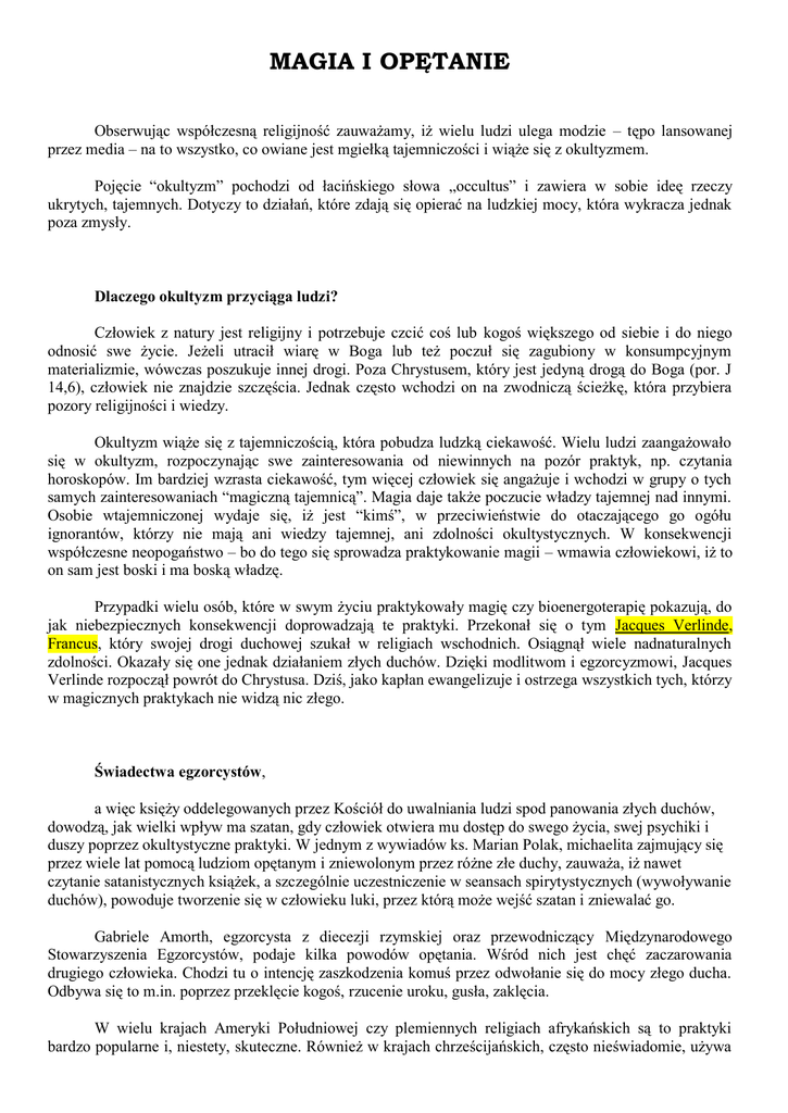 MAGIA I OPĘTANIE Obserwując współczesną religijność zauważamy, iż wielu ludzi ulega modzie – tępo lansowanej przez media – na to wszystko, co owiane jest mgiełką tajemniczości i wiąże się z okultyzmem. Pojęcie “okultyzm” pochodzi od łacińskiego słowa „occultus” i zawiera w sobie ideę rzeczy ukrytych, tajemnych. Dotyczy to działań, które zdają się opierać na ludzkiej mocy, która wykracza jednak poza zmysły. Dlaczego okultyzm przyciąga ludzi? Człowiek z natury jest religijny i potrzebuje czcić coś lub kogoś większego od siebie i do niego odnosić swe życie. Jeżeli utracił wiarę w Boga lub też poczuł się zagubiony w konsumpcyjnym materializmie, wówczas poszukuje innej drogi. Poza Chrystusem, który jest jedyną drogą do Boga (por. J 14,6), człowiek nie znajdzie szczęścia. Jednak często wchodzi on na zwodniczą ścieżkę, która przybiera pozory religijności i wiedzy. Okultyzm wiąże się z tajemniczością, która pobudza ludzką ciekawość. Wielu ludzi zaangażowało się w okultyzm, rozpoczynając swe zainteresowania od niewinnych na pozór praktyk, np. czytania horoskopów. Im bardziej wzrasta ciekawość, tym więcej człowiek się angażuje i wchodzi w grupy o tych samych zainteresowaniach “magiczną tajemnicą”. Magia daje także poczucie władzy tajemnej nad innymi. Osobie wtajemniczonej wydaje się, iż jest “kimś”, w przeciwieństwie do otaczającego go ogółu ignorantów, którzy nie mają ani wiedzy tajemnej, ani zdolności okultystycznych. W konsekwencji współczesne neopogaństwo – bo do tego się sprowadza praktykowanie magii – wmawia człowiekowi, iż to on sam jest boski i ma boską władzę. Przypadki wielu osób, które w swym życiu praktykowały magię czy bioenergoterapię pokazują, do jak niebezpiecznych konsekwencji doprowadzają te praktyki. Przekonał się o tym Jacques Verlinde, Francus, który swojej drogi duchowej szukał w religiach wschodnich. Osiągnął wiele nadnaturalnych zdolności. Okazały się one jednak działaniem złych duchów. Dzięki modlitwom i egzorcyzmowi, Jacques Verlinde rozpoczął powrót do Chrystusa. Dziś, jako kapłan ewangelizuje i ostrzega wszystkich tych, którzy w magicznych praktykach nie widzą nic złego. Świadectwa egzorcystów, a więc księży oddelegowanych przez Kościół do uwalniania ludzi spod panowania złych duchów, dowodzą, jak wielki wpływ ma szatan, gdy człowiek otwiera mu dostęp do swego życia, swej psychiki i duszy poprzez okultystyczne praktyki. W jednym z wywiadów ks. Marian Polak, michaelita zajmujący się przez wiele lat pomocą ludziom opętanym i zniewolonym przez różne złe duchy, zauważa, iż nawet czytanie satanistycznych książek, a szczególnie uczestniczenie w seansach spirytystycznych (wywoływanie duchów), powoduje tworzenie się w człowieku luki, przez którą może wejść szatan i zniewalać go. Gabriele Amorth, egzorcysta z diecezji rzymskiej oraz przewodniczący Międzynarodowego Stowarzyszenia Egzorcystów, podaje kilka powodów opętania. Wśród nich jest chęć zaczarowania drugiego człowieka. Chodzi tu o intencję zaszkodzenia komuś przez odwołanie się do mocy złego ducha. Odbywa się to m.in. poprzez przeklęcie kogoś, rzucenie uroku, gusła, zaklęcia. W wielu krajach Ameryki Południowej czy plemiennych religiach afrykańskich są to praktyki bardzo popularne i, niestety, skuteczne. Również w krajach chrześcijańskich, często nieświadomie, używa się złorzeczenia drugiemu człowiekowi, będącego formą przekleństwa. Niejednokrotnie złorzeczymy: “Niech cię piorun trzaśnie”, “Idź do diabła”. Nawet niektórzy rodzice o swych dzieciach mówią: “Z piekła rodem”. Są to formy przywołania – choć może nieświadomego – złych duchów, by szkodziły drugiemu. Jeżeli “ofiara” nie żyje w stanie łaski uświęcającej, często te przekleństwa pozwalają na skuteczne działanie szatana. Stąd też Jezus nakazuje, by nawet względem wrogów i przeciwników nie posługiwać się złorzeczeniem: “Lecz powiadam wam, którzy słuchacie: Miłujcie waszych nieprzyjaciół; dobrze czyńcie tym, którzy was nienawidzą; błogosławcie tym, którzy was przeklinają, i módlcie się za tych, którzy was oczerniają” (Łk 6,27-28)1[1]. W podobnym tonie napomina św. Paweł: “Błogosławcie tych, którzy was prześladują. Błogosławcie a nie złorzeczcie” (Rz 12,14). Złorzeczenie komuś zawsze obraca się także przeciw temu, kto złorzeczy. Podobnie jak błogosławienie innych przynosi pożytek osobie, która błogosławi. Św. Piotr pisząc o tym, zaznacza: “Nie oddawajcie złem za zło, ani złorzeczeniem za złorzeczenie. Przeciwnie zaś, błogosławcie! Do tego bowiem jesteście powołani, abyście odziedziczyli błogosławieństwo” (1 P 3,9). Do opętania może przyczynić się także udział w różnego rodzaju seansach spirytystycznych, jak chociażby w wywoływaniu duchów. Chodzi tu także o zwracanie się do różnego rodzaju czarowników, osób wróżących z kart, itp. Ks. Gabriele Amorth w swojej książce Wyznania egzorcysty podaje pewien często spotykany schemat działania. Osoba popadająca w przewlekłą chorobę zauważa, iż wszelkie próby medycyny konwencjonalnej są bezskuteczne. Udaje się do różnego rodzaju bioenergoterapeutów czy też wróżbiarzy, którzy mają zdiagnozować, jaki urok jest odpowiedzialny za tę chorobę. Oferują jednocześnie, zazwyczaj za odpłatnością, odczarowanie lub usunięcie złych prądów, energii bądź wibracji. Czynią to za pomocą, jak ją sami określają, “białej magii”. Jednakże podział na czarną (szkodzącą) i białą (usuwającą szkody) magię jest iluzoryczny. Nie ma białej, czarnej, siwej czy kolorowej magii; jest jedna magia, zawsze związana z działaniem złego ducha, który o swoje zacznie się upominać. Potępienie magii Na kartach Starego i Nowego Testamentu znajdujemy 