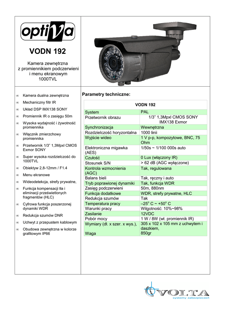 VODN 192 Kamera zewnętrzna z promiennikiem podczerwieni i menu ekranowym 1000TVL • Kamera dualna zewnętrzna • Mechaniczny filtr IR • Układ DSP IMX138 SONY • Promiennik IR o zasięgu 50m • Wysoka wydajność i żywotność promiennika Parametry techniczne: VODN 192 System Przetwornik obrazu Synchronizacja Rozdzielczość horyzontalna Wyjście wideo • Włącznik zmierzchowy promiennika • Przetwornik 1/3” 1,3Mpxl CMOS Exmor SONY • Super wysoka rozdzielczość do 1000TVL • Obiektyw 2,8-12mm / F1.4 • Menu ekranowe • Wideodetekcja, strefy prywatne, • Funkcja kompensacji tła i eliminacji prześwietlonych fragmentów (HLC) • Cyfrowa funkcja poszerzonej dynamiki WDR • Redukcja szumów DNR • Uchwyt z przepustem kablowym Elektroniczna migawka (AES) Czułość Stosunek S/N Kontrola wzmocnienia (AGC) Balans bieli Tryb poprawionej dynamiki Zasięg podczerwieni Funkcja dodatkowe Redukcja szumów Temperatura pracy Warunki pracy Zasilanie Pobór mocy Wymiary (dł. x szer. x wys.), • Obudowa zewnętrzna w kolorze grafitowym IP66 Waga PAL 1/3” 1,3Mpxl CMOS SONY IMX138 Exmor Wewnętrzna 1000 linii 1 V p-p, kompozytowe, BNC, 75 Ohm 1/50s ~ 1/100 000s auto 0 Lux (włączony IR) > 62 dB (AGC wyłączone) Tak, regulowana Tak, ręczny i auto Tak, funkcja WDR 50m, 880nm WDR, strefy prywatne, HLC Tak –25o C ~ +50o C Wilgotność: 10%~98% 12VDC 1 W / 8W (wł. promiennik IR) 305 x 102 x 105 mm z uchwytem i daszkiem, 850gr