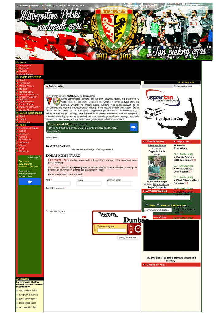 » Strona Główna » FORUM » Galeria » Piłkarz meczu » Śpiewnik » Multimedia czwartek 8 listopada 2012 Informacje Historia Stadion Aleja Gwiazd Skład Terminarz Piłkarz meczu Relacje Relacje LIVE Analizy taktyczne Chłodnym okiem Nakładką Liga Mistrzów Puchar Polski Puchar Ekstraklasy Skróty filmowe Skład Tabela Terminarz Aktualności 05.11.2012(10:03): KKN będzie w Szczecinie Mimo zamknięcia sektora dla kibiców drużyny gości, na stadionie w Szczecinie nie zabraknie wsparcia dla Śląska. Niemal tradycją stały się bowiem wyjazdy na mecze Klubu Kibiców Niepełnosprawnych (o ile gospodarze nie wydają nieprzychylnych decyzji) i nie inaczej będzie tym razem. Grupa fanów WKS-u zasiądzie na specjalnie przygotowanym dla osób niepełnosprawnych sektorze. A biorąc pod uwagę, że w Szczecinie są pewne zawirowania na linii sympatycy – władze klubu i grupa ultras zapowiedziała zaprzestanie prowadzenia dopingu, jest duża szansa, że piłkarze usłyszą wsparcie małej grupki zielono-biało-czerwonych. Pożyczka od 300 zł provident.pl Miesięcznik Śląsk Nabór Archiwum Galeria Multimedia Śpiewnik Forum Czat Redakcja Szybka pożyczka na dowód. Wyślij prosty formularz, oddzwonimy autor : Rev Piłkarz meczu Piłkarzem Meczu w meczu z Zagłębie Lubin został KOMENTARZE Nie skomentowano jeszcze tego newsa. DODAJ KOMENTARZ Prywatne przedszkole www.maliodkrywcy.com.p l Fantasytyczni nauczyciele Wysoki standard lokalu. Czy wiesz, że wszystkie nowo dodane komentarze muszą zostać zaakceptowane Śląsk Info 10.kolejka Ekstraklasy: 02.11.2012(18:00) Górnik Zabrze GKS Bełchatów 2:0 przez redakcję. 02.11.2012(20:45) Wisła Kraków Lech Poznań 0:1 Nie chcesz czekać? Zarejestruj się na forum kibiców Śląska Wrocław a następnie podczas dodawania komentarza podaj swój login i hasło. Koniecznie przepisz tekst z obrazka! Nick*: Hasło: Adres e-mail: Treść komentarza*: Sylwester Patejuk Wybierz Piłkarza Meczu z Pogoń Szczecin WYSZUKIWARKA Web * - pola wymagane 03.11.2012(13:30) Piast Gliwice - Ruch Chorzów 1:3 03.11.2012(15:45) Zagłębie Lubin Podbeskidzie Bielsko-Biała 1:2 03.11.2012(18:00) www.SLASKnet.com Jagiellonia Wyszukiwarka Google Białystok - Widzew Łódź 2:2 Polecane Video 04.11.2012(14:30) Lechia Gdańsk Legia Warszawa 1:2 Wpisz oba wyrazy: 04.11.2012(17:00) Polonia Warszawa Korona Kielce 2:0 dodaj komentarz 05.11.2012(18:30) Pogoń Szczecin Śląsk Wrocław 0:3 VIDEO: Śląsk - Zagłębie (oprawa widziana z murawy) Dołącz do nas! Co wywalczy Śląsk w nowym sezonie T-Mobile Ekstraklasy? mistrzostwo Polski europejskie puchary górną część tabeli dolną część tabeli nic - spadnie z ligi