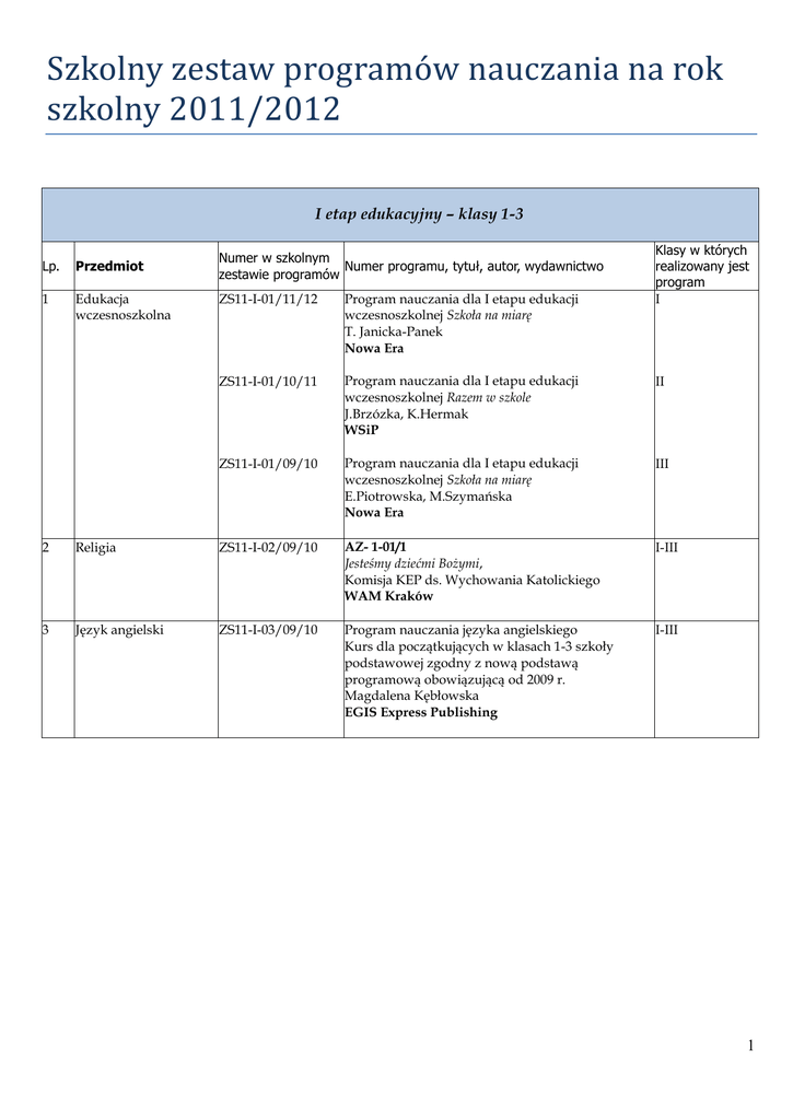 Szkolny zestaw programów nauczania na rok szkolny 2011/2012