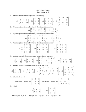 MATEMATYKA lista zadań nr 3 1. Sprowadzić macierze do postaci kanonicznej 2 0 1 a) , 5 − 1 − 3 − 2 4 b) 1 3 , − 1 1 2 3 4 c) 1 0 2 , 0 2 −1 0 − 1 1 2 1 2 d) . − 1 − 2 − 3 3 2 0 2. Wyznaczyć macierze odwrotne (o ile istnieją) do macierzy 3 2 0 2 − 1 3 a) , b) , c) . 0 1 2 2 − 2 6 3. Wyznaczyć macierze odwrotne (o ile istnieją) do macierzy 2 1 1 0 0 4 1 0 2 a) 1 1 0 , b) 0 2 5 , c) 0 5 0 . 1 1 2 1 3 6 4 0 3 4. Wyznaczyć macierze odwrotne (o ile istnieją) do macierzy 0 1 2 0 0 1 2 0 1 2 4 3 0 0 4 3 0 0 1 0 , b) , c) a) 0 0 1 0 0 0 − 1 − 2 0 0 0 0 0 1 0 0 − 4 − 3 0 0 5. Metodą operacji elementarnych wyznaczyć rząd macierzy 3 2 2 1 0 1 2 1 3 0 a) , b) , c) 1 5 , d) 1 0 2 , 0 −1 1 0 3 1 5 0 2 1 6. Metodą wyznacznikową wyznaczyć rząd macierzy 3 2 1 0 4 3 . 2 1 1 0 − 1 − 1 e) . 1 1 0 − 1 1 3 2 2 −1 0 2 1 − 1 − 1 3 0 a) , b) 1 0 − 3 , c) 0 0 , d) − 1 0 − 2 , e) − 1 − 2 2 4 5 0 − 2 1 0 7. Dla jakich m ∈ R 1 3 0 1 − 3 a) r ( A) = 3 , gdzie A = 2 m 0 , b) r ( B ) < 3 , gdzie B = − 1 0 1 1 2 − 2 1 − m 8. Niech 0 − 1 1 0 1 A= , B = − 1 0 . 0 1 0 0 − 1 Obliczyć a) r ( A ⋅ B) , b) r ( B ⋅ A) , c) r ( A + B T ) , d) r ( AT − B) . − 1 2 − 2 − 3 3 2 0 1 2 3 . 4