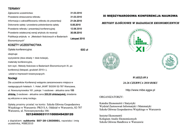 TERMINY Zgłoszenie uczestnictwa: 31.03.2010 Przesłanie streszczenia referatu 31.03.2010 Informacja o zakwalifikowaniu referatu do prezentacji 21.04.2010 Dokonanie opłaty i przesłania potwierdzenia opłaty 5.05 .05.2010 Przesłanie referatu i prezentacji konferencyjnej 12.06.2010 Przesłanie ostatecznej wersji artykułu do recenzji 30.06.2010 Publikacja artykułu w „Metodach Ilościowych w Badaniach Ekonomicznych” XI MIĘDZYNARODOWA KONFERENCJA NAUKOWA METODY ILOŚCIOWE W BADANIACH EKONOMICZNYCH Listopad 2010 KOSZTY UCZESTNICTWA Opłata konferencyjna: 600 zł obejmuje: wyżywienie (dwa obiady + dwie kolacje), materiały konferencyjne, tom wyd.: Metody Ilościowe w Badaniach Ekonomicznych XI, po konferencji (listopad, grudzień 2010 r.), udział w imprezach towarzyszących. Noclegi Dla uczestników Konferencji wstępnie zarezerwowano miejsca w WARSZAWA 24-26 CZERWCA 2010 ROKU następujących hotelach: 1. Hotel „IKAR” SGGW 02-787 Warszawa, http://www.mibe.sggw.pl ul. Nowoursynowska 161, pokoje: 1-osobowe - aktualna cena 155 zł/dobę, zł/dobę, 2-osobowe - aktualna cena 200,00 zł/doba/pokój, śniadania są wliczone w cenę noclegu. Szkoła Główna Gospodarstwa Wiejskiego w Warszawie: PKO S.A. Oddział w Warszawie, 02-787 Warszawa, ul. Nowoursynowska 166: 52124060031111000049428120 Opłatę prosimy przelać na konto: z dopiskiem: subkonto 507-20-13030001, nazwisko i imię uczestnika, MIBE2010 ORGANIZATORZY: Katedra Ekonometrii i Statystyki Wydział Zastosowań Informatyki i Matematyki Szkoła Główna Gospodarstwa Wiejskiego w Warszawie Instytut Ekonometrii Kolegium Analiz Ekonomicznych Szkoła Główna Handlowa w Warszawie CELE KONFERENCJI XI Międzynarodowa Konferencja Naukowa Metody Ilościowe w Badaniach Ekonomicznych jest coroczną konferencją naukową organizowaną przez Katedrę Ekonometrii i Statystyki (wcześniej przez Katedrę Ekonometrii i Informatyki) SGGW. W roku 2010 konferencję po raz pierwszy organizują dwie uczelnie: SGGW - Katedra Ekonometrii i Statystyki, SGH - Instytut Ekonometrii, Konferencja odbędzie się na terenie SGH - 24.06.2010 r. oraz SGGW - 25, 26.06. 2010 r. Celem głównym konferencji jest integracja polskich i zagranicznych środowisk naukowych zajmujących się zastosowaniami matematyki i informatyki w szeroko rozumianej ekonomii. TEMATYKA KONFERENCJI Tematyka konferencji obejmuje zagadnienia dotyczące : • Ekonometrii i statystyki • Wielowymiarowej analizy porównawczej • InŜynierii finansowej • Badań operacyjnych • Zastosowań matematyki w ekonomii, zarządzaniu, logistyce • Matematyki finansowej i ubezpieczeniowej • Zastosowań informatyki w badaniach ekonomicznych KOMITET NAUKOWY KONFERENCJI Prof. dr hab. Bolesław Borkowski (SGGW) – Przewodniczący Prof. dr hab. Witold Adamus (Uniwersytet Jagieloński) Prof. dr hab. Czesław Domański (Uniwersytet Łódzki) Prof. dr hab. Paolo Gajo (Uniwersytet we Florencji) Prof. dr hab. Irena Jędrzejczyk (SGGW) Prof. dr hab. Leszek Kuchar (Uniwersytet Przyrodniczy we Wrocławiu) Prof. dr hab. Vassilis Kostoglou (Alexander Technological Educational Institute of Thessaloniki) Prof. dr hab. Karol Kukuła (Uniwersytet Rolniczy w Krakowie) Prof. dr hab. Maria Podgórska (Szkoła Główna Handlowa) Prof. Yochanan Shachmurove, The City College of The City University of New York and The University of Pennsylvania (USA) Prof. dr hab. Honorata Sosnowska (Szkoła Główna Handlowa) Prof. dr hab. Jacek Sztaudynger (Uniwersytet Łódzki) Prof. dr hab. Zdzisław Szyjewski (Uniwersytet Szczeciński) Prof. dr hab. Tadeusz Trzaskalik (Akademia Ekonomiczna w Katowicach) Prof. dr hab. Waldemar Tarczyński (Uniwersytet Szczeciński) Prof. dr hab. Dorota Witkowska (SGGW) KOMITET ORGANIZACYJNY Prof. SGGW dr hab. Zbigniew Binderman - przewodniczący Prof. SGH dr hab. Wanda Marcinkowska-Lewandowska, Prof. SGH dr hab. Marek Gruszczyński, dr Agata Binderman, mgr Urszula Cielniak, dr Hanna Dudek, dr Jolanta Kotlarska, dr Monika Krawiec, dr Marek Kwas, dr Joanna Landmesser, mgr Anna Misiuk, dr ElŜbieta Saganowska. SEKRETARIAT KONFERENCJI InŜ. ElŜbieta Borysiuk, inŜ. ElŜbieta Wiechowska Katedra Ekonometrii i Statystyki SGGW, ul. Nowoursynowska 169, bud. 34, pok. 3/41 02-787 WARSZAWA Tel 22 5937222, tel./fax. 22 5937221, e-mail: [email protected] PREZENTACJA REFERATÓW Referaty zgłoszone na konferencję zostaną poddane ocenie recenzentów. Ocena odbędzie się na podstawie nadesłanych streszczeń, nie przekraczających jednej strony formatu A-4.. Referaty zakwalifikowane do prezentacji zostaną wygłoszone lub zaprezentowane na sesjach posterowych. PUBLIKACJA Przesłane referaty, przygotowane zgodnie z wymogami edytorskimi, po uzyskaniu pozytywnej recenzji zostaną opublikowane w „Metodach Ilościowych w Badaniach Ekonomicznych XI”. Czasopismo „Metody Ilościowe w Badaniach Ekonomicznych” są wydawane przez Wydziału Zastosowań Informatyki i Matematyki SGGW, znajdują się na liście czasopism naukowych Ministerstwa Nauki i Szkolnictwa WyŜszego zgodnie z którą, za publikację umieszczoną w tym czasopiśmie otrzymuje się 6 punktów. Wymagania Wydawnicze: RAMOWY PROGRAM KONFERENCJI MAKSYMALNA OBJĘTOŚĆ OPRACOWANIA 12 stron MS Word – ustawienia strony: papier A4 !!! 24.VI.2010- (CZWARTEK) SGH Al. Niepodległości 162, bud. Główny Marginesy: górny 3 cm; dolny 6,7 cm; prawy 4,2 cm; lewy 4,2 cm nagłówek 2 cm; stopka 5,5 cm 16:00-16:15 Rejestracja uczestników 16:15-16:30 Otwarcie konferencji 16:30-18:00 Sesja plenarna 18:30 klub profesorski „Jajko” 25.VI.2010- (PIĄTEK) SGGW ul. Nowoursynowska 169, bud. 34, III piętro Czcionka podstawowa – Times New Roman 12 pkt., przypisy dolne wcięte pod stroną – 9 pkt., tytuły i podtytuły czcionką odpowiednio większą i wytłuszczone. Tekst – wyjustowany (wyrównanie do prawej i lewej), pojedyncze spacje (odstępy)!!! Interlinia (Odstęp między wierszami) – 1,5 wiersza. 9:45-10:00 10:00-12:15 12:15-12:45 12:45-14:00 14:00-16:00 