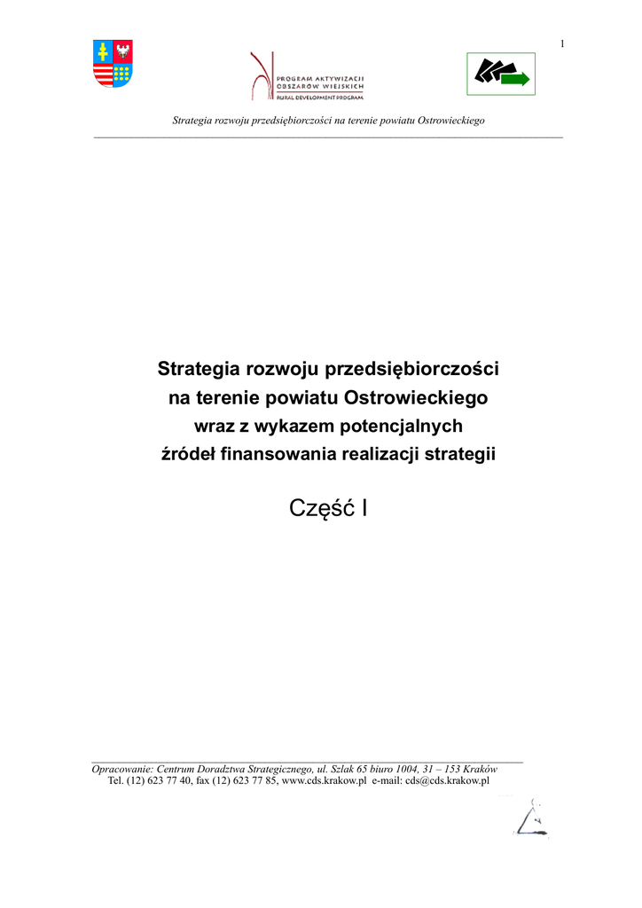 !1 ! ! Strategia rozwoju przedsiębiorczości na terenie powiatu Ostrowieckiego _______________________________________________________________________________________ Strategia rozwoju przedsiębiorczości na terenie powiatu Ostrowieckiego wraz z wykazem potencjalnych źródeł finansowania realizacji strategii Część I ________________________________________________________________________________ Opracowanie: Centrum Doradztwa Strategicznego, ul. Szlak 65 biuro 1004, 31 – 153 Kraków Tel. (12) 623 77 40, fax (12) 623 77 85, www.cds.krakow.pl e-mail: [email protected] # !2 ! ! Strategia rozwoju przedsiębiorczości na terenie powiatu Ostrowieckiego _______________________________________________________________________________________ Kraków – Ostrowiec Świętokrzyski, listopad 2003 r. Wprowadzenie Prace nad „Strategią rozwoju przedsiębiorczości na terenie powiatu Ostrowieckiego” rozpoczęto w lipcu 2003 r. zgodnie z umową z dnia 20 maja 2003 roku zawartą pomiędzy Zarządem Województwa Świętokrzyskiego a firmą Centrum Doradztwa Strategicznego s.c. Dagmara Bieńkowska, Cezary Ulasiński z Krakowa. Prace nad opracowaniem dokumentu zakończono w listopadzie 2003 roku. „Strategia rozwoju przedsiębiorczości na terenie powiatu Ostrowieckiego” została opracowana w ramach programu Planowanie Rozwoju Lokalnego dla powiatu Ostrowieckiego (program PAOW). „Strategia...” jest dokumentem planistycznym odnoszącym się do wybranej przez powiat branży rozwoju gospodarczego (przedsiębiorczości) i składa się z dwóch części. Część I stanowi zapis strategii obejmujący: zdefiniowaną misję rozwoju branży, wyniki przeprowadzonej analizy SWOT oraz sformułowane cele strategiczne, cele operacyjne oraz szczegółowe zadania i projekty do realizacji. Natomiast druga część dokumentu „Strategii...” - część finansowa – zawiera analizę budżetu powiatu pod kątem możliwości finansowania zadań zapisanych w tym dokumencie planistycznym oraz analizę zewnętrznych źródeł, zidentyfikowanych w odniesieniu do wybranej branży – rozwoju przedsiębiorczości na terenie powiatu ostrowieckiego. Dzięki wzbogaceniu „Strategii...” o analizy finansowe, zapisy w niej zawarte są bardziej realne do wykonania, a tym samym ich realizacja może ________________________________________________________________________________ Opracowanie: Centrum Doradztwa Strategicznego, ul. Szlak 65 biuro 1004, 31 – 153 Kraków Tel. (12) 623 77 40, fax (12) 623 77 85, www.cds.krakow.pl e-mail: [email protected] # !3 ! ! Strategia rozwoju przedsiębiorczości na terenie powiatu Ostrowieckiego _______________________________________________________________________________________ efektywnie przyczynić się do wzrostu potencjału gospodarczego powiatu Ostrowieckiego. ________________________________________________________________________________ Opracowanie: Centrum Doradztwa Strategicznego, ul. Szlak 65 biuro 1004, 31 – 153 Kraków Tel. (12) 623 77 40, fax (12) 623 77 85, www.cds.krakow.pl e-mail: [email protected] # !4 ! ! Strategia rozwoju przedsiębiorczości na terenie powiatu Ostrowieckiego _______________________________________________________________________________________ W pracach nad wypracowaniem „Strategii ...” brał udział zespół konsultantów Centrum Doradztwa Strategicznego z Krakowa, w skład którego wchodzili m.in.: Cezary Ulasiński ................................................. Dagmara Bieńkowska ................................................. Justyna Adamska ................................................. Magdalena Janiak - Jaskółowska ................................................. Jakub Szymański ................................................. Sebastian Koziński ................................................. Nieocenionej pomocy udzielili: Robert Post – Naczelnik Wydziału Rozwoju i Integracji Europejskiej w Starostwie Powiatowym w Ostrowcu Świętokrzyskim – koordynator projektu ze strony Starostwa Powiatowego, a także wszyscy członkowie Rady Programowej ds. Strategii Rozwoju Przedsiębiorczości - zespół warsztatowy. ________________________________________________________________________________ Opracowanie: Centrum Doradztwa Strategicznego, ul. Szlak 65 biuro 1004, 31 – 153 Kraków Tel. (12) 623 77 40, fax (12) 623 77 85, www.cds.krakow.pl e-mail: [email protected] # !5 ! ! Strategia rozwoju przedsiębiorczości na terenie powiatu Ostrowieckiego _______________________________________________________________________________________ STRATEGIA ROZWOJU PRZEDSIĘBIORCZOŚCI NA TERENIE POWIATU OSTROWIECKIEGO CZĘŚĆ I – ZAPIS STRATEGII ________________________________________________________________________________ Opracowanie: Centrum Doradztwa Strategicznego, ul. Szlak 65 biuro 1004, 31 – 153 Kraków Tel. (12) 623 77 40, fax (12) 623 77 85, www.cds.krakow.pl e-mail: [email protected] # !6 ! ! Strategia rozwoju przedsiębiorczości na terenie powiatu Ostrowieckiego _______________________________________________________________________________________ SPIS TREŚCI: ________________________________________________________________________________ Opracowanie: Centrum Doradztwa Strategicznego, ul. Szlak 65 biuro 1004, 31 – 153 Kraków Tel. (12) 623 77 40, fax (12) 623 77 85, www.cds.krakow.pl e-mail: [email protected] # !7 ! ! Strategia rozwoju przedsiębiorczości na terenie powiatu Ostrowieckiego _______________________________________________________________________________________ Wprowadzenie .........................................................................................................2 METODYKA PROCESU PLANOWANIA STRATEGICZNEGO DLA POWIATU OSTROWIECKIEGO ............................................................................10 - tworzenie lokalnych warunków i zachęt dla rozwoju mikro, małych i średnich przedsiębiorstw na terenie powiatu ostrowieckiego. .............................15 
