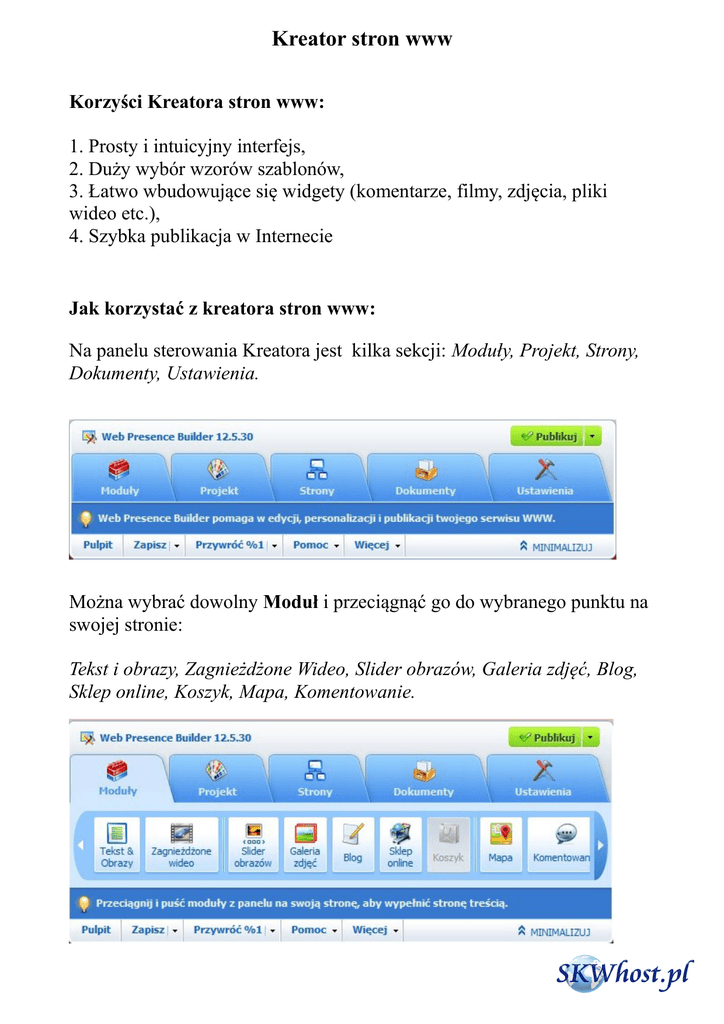 Kreator stron www Korzyści Kreatora stron www: 1. Prosty i intuicyjny interfejs, 2. Duży wybór wzorów szablonów, 3. Łatwo wbudowujące się widgety (komentarze, filmy, zdjęcia, pliki wideo etc.), 4. Szybka publikacja w Internecie Jak korzystać z kreatora stron www: Na panelu sterowania Kreatora jest kilka sekcji: Moduły, Projekt, Strony, Dokumenty, Ustawienia. Można wybrać dowolny Moduł i przeciągnąć go do wybranego punktu na swojej stronie: Tekst i obrazy, Zagnieżdżone Wideo, Slider obrazów, Galeria zdjęć, Blog, Sklep online, Koszyk, Mapa, Komentowanie. Formularz kontaktowy, Media społecznościowe, Twitter Feed, Amazon aStore, Reklama, Szukaj. Nawigacja, Breadcrumby, Baner, Logo strony, Skrypt. W sekcji Projekt - Szablony można wybrać szablon dla strony www z dostosowanym schematem kolorów, czcionek i innych ustawień. Można edytować układ i tekst w razie potrzeby. W sekcji Projekt – Layout można dostosować wielkość i pozycję swojej strony: Nagłówek – tutaj zwykle zamieszczamy tytuł strony www, logo oraz strony menu. Stopka - tutaj zazwyczaj umieszczamy informacje kontaktowe (nazwa firmy, telefon, e-mail), licznik odwiedzin. Boczne menu – w kreatorze można wybrać 0,1,2 paneli bocznych, ustawić szerokość, etc. W panelu bocznym można ustawić reklamę, menu, etc. Obszar głównej treści- tutaj zamieszczamy swoje teksty, zdjęcia, blog, sklep internetowy, etc. W pozostałych sekcjach Projekt można również konfigurować kolory, czcionki, itp. W sekcji Strony można tworzyć, usuwać i edytować zakładki na swojej stronie www. W sekcji Dokumenty można pobrać dokumenty z komputera: doc., pdf itp. Aby przesłane dokumenty były dostępne dla odwiedzających stronę www, trzeba utworzyć link do nich. Dlatego zaznaczamy żądane słowo w tekście, a następnie wciskamy przycisk Link. W Ustawieniach można ustawić nazwę strony internetowej i opis, wprowadzić słowa kluczowe i ustawić favicon.