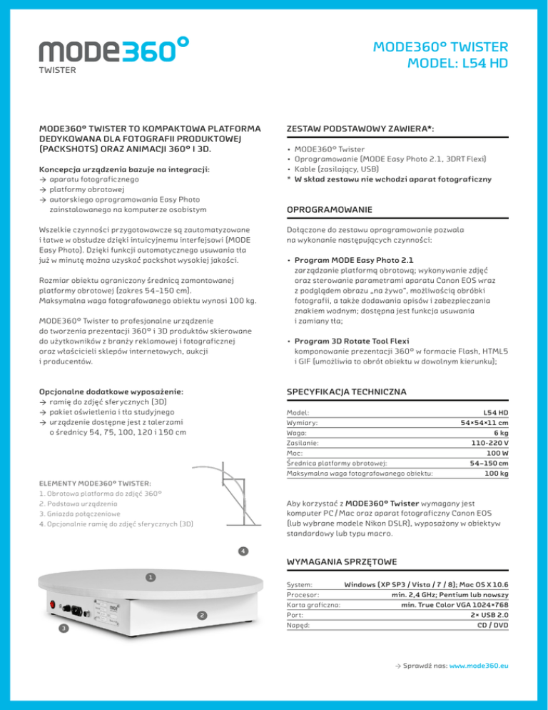 MODE360° TWISTER MODEL: L54 HD MODE360° TWISTER TO KOMPAKTOWA PLATFORMA DEDYKOWANA DLA FOTOGRAFII PRODUKTOWEJ (PACKSHOTS) ORAZ ANIMACJI 360° I 3D. Koncepcja urządzenia bazuje na integracji: → aparatu fotograficznego → platformy obrotowej → autorskiego oprogramowania Easy Photo zainstalowanego na komputerze osobistym ZESTAW PODSTAWOWY ZAWIERA*: • MODE360° Twister • Oprogramowanie (MODE Easy Photo 2.1, 3DRT Flexi) • Kable (zasilający, USB) * W skład zestawu nie wchodzi aparat fotograficzny OPROGRAMOWANIE Wszelkie czynności przygotowawcze są zautomatyzowane i łatwe w obsłudze dzięki intuicyjnemu interfejsowi (MODE Easy Photo). Dzięki funkcji automatycznego usuwania tła już w minutę można uzyskać packshot wysokiej jakości. Rozmiar obiektu ograniczony średnicą zamontowanej platformy obrotowej (zakres 54–150 cm). Maksymalna waga fotografowanego obiektu wynosi 100 kg. MODE360° Twister to profesjonalne urządzenie do tworzenia prezentacji 360° i 3D produktów skierowane do użytkowników z branży reklamowej i fotograficznej oraz właścicieli sklepów internetowych, aukcji i producentów. Dołączone do zestawu oprogramowanie pozwala na wykonanie następujących czynności: • Program MODE Easy Photo 2.1 zarządzanie platformą obrotową; wykonywanie zdjęć oraz sterowanie parametrami aparatu Canon EOS wraz z podglądem obrazu „na żywo”, możliwością obróbki fotografii, a także dodawania opisów i zabezpieczania znakiem wodnym; dostępna jest funkcja usuwania i zamiany tła; • Program 3D Rotate Tool Flexi komponowanie prezentacji 360° w formacie Flash, HTML5 i GIF (umożliwia to obrót obiektu w dowolnym kierunku); SPECYFIKACJA TECHNICZNA Opcjonalne dodatkowe wyposażenie: → ramię do zdjęć sferycznych (3D) → pakiet oświetlenia i tła studyjnego → urządzenie dostępne jest z talerzami o średnicy 54, 75, 100, 120 i 150 cm Model: L54 HD Wymiary: 54×54×11 cm Waga: 6 kg Zasilanie: 110-220 V Moc: 100 W Średnica platformy obrotowej: 54–150 cm Maksymalna waga fotografowanego obiektu: 100 kg ELEMENTY MODE360° TWISTER: 1.Obrotowa platforma do zdjęć 360° 2. Podstawa urządzenia 3.Gniazda połączeniowe 4.Opcjonalnie ramię do zdjęć sferycznych (3D) Aby korzystać z MODE360° Twister wymagany jest komputer PC / Mac oraz aparat fotograficzny Canon EOS (lub wybrane modele Nikon DSLR), wyposażony w obiektyw standardowy lub typu macro. 4 WYMAGANIA SPRZĘTOWE 1 2 3 System: Windows ( XP SP3 / Vista / 7 / 8 ); Mac OS X 10.6 Procesor: min. 2,4 GHz; Pentium lub nowszy Karta graficzna: min. True Color VGA 1024×768 Port: 2× USB 2.0 Napęd: CD / DVD → Sprawdź nas: www.mode360.eu