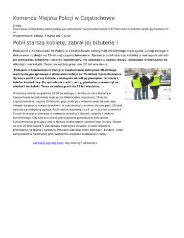 Komenda Miejska Policji w Częstochowie Źródło: http://www.czestochowa.slaska.policja.gov.pl/ka7/informacje/wiadomosci/21537,Pobil-starsza-kobiete-zabral-jej-bizuterie.ht ml Wygenerowano: Sobota, 4 marca 2017, 02:00 Pobił starszą kobietę, zabrał jej biżuterię ! Policjanci z Komisariatu III Policji w Częstochowie zatrzymali 20-letniego mężczyznę podejrzanego o dokonanie rozboju na 79-letniej częstochowiance. Sprawca pobił starszą kobietę a następnie ukradł jej pieniądze, biżuterię i telefon komórkowy. Po sprzedaniu części rzeczy, pieniądze przeznaczył na alkohol i narkotyki. Teraz za rozbój grozi mu 12 lat więzienia. Policjanci z Komisariatu III Policji w Częstochowie zatrzymali 20-letniego mężczyznę podejrzanego o dokonanie rozboju na 79-letniej częstochowiance. Sprawca pobił starszą kobietę a następnie ukradł jej pieniądze, biżuterię i telefon komórkowy. Po sprzedaniu części rzeczy, pieniądze przeznaczył na alkohol i narkotyki. Teraz za rozbój grozi mu 12 lat więzienia. W miniony wtorek po godzinie 10.00 do jednego z domów na ulicy Worcela w Częstochowie wszedł młody mężczyzna. Właścicielka mieszkania, 79-letnia częstochowianka zaufała 20-latkowi, gdyż znała go z widzenia wiele lat temu gdy chłopak był jeszcze małym dzieckiem. W trakcie pobytu w domu starszej pani, 20-latek wykazał się niebywałą agresją. Pobił częstochowiankę, rzucił ją na ścianę i przewrócił. Zmusił do wydania pieniędzy a następnie okradł ją z biżuterii, zegarka i telefonu komórkowego. Gdy sprawca uciekł, pokrzywdzona powiadomiła policjantów. Funkcjonariusze pracujący nad tą sprawą szybko ustalili sprawcę tego rozboju. Okazał się nim 20-letni Dawid S. Zatrzymany mężczyzna przyznał, iż część pieniędzy przeznaczył na alkohol i narkotyki. Policjanci odzyskali część pieniędzy i biżuterii. Teraz zatrzymanemu mężczyźnie grozi wieloletnie więzienie za dokonany rozbój. Zainstaluj wtyczkę Flash, aby zobaczyć odtwarzacz. pobierz film - 3.17 MB Ocena: 0/5 (0) Tweetnij