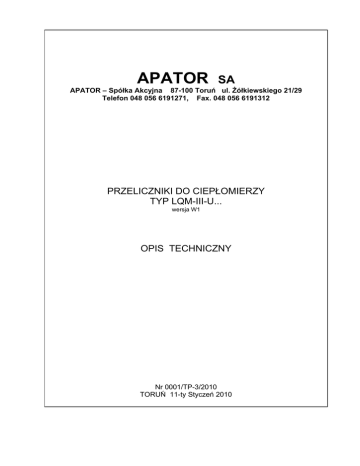 APATOR SA APATOR – Spółka Akcyjna 87-100 Toruń ul. Żółkiewskiego 21/29 Telefon 048 056 6191271, Fax. 048 056 6191312 PRZELICZNIKI DO CIEPŁOMIERZY TYP LQM-III-U... wersja W1 OPIS TECHNICZNY Nr 0001/TP-3/2010 TORUŃ 11-ty Styczeń 2010 -1- SPIS TREŚCI STRONA 1.Przedmiot instrukcji. ................................................................. 2 2.Przeznaczenie. ........................................................................... 2 3.Zgodność z normami. ................................................................ 2 4.Podstawowe dane techniczne przelicznika typu LQM-III-U... . ....... 2 5.Zasada działania. ........................................................................... 3 6.Rodzaje danych i obsługa ich wyświetlania. ................................. 4 6.1. Dane aktualne. ................................................................. 4 6.1.1. Suma energii cieplnej. ...................................................... 4 6.1.2. Suma objętości nośnika. ........................................... 4 6.1.3. Suma energii drugiej taryfy. ........................................... 4 6.1.4. Temperatury zasilania i powrotu, różnica temperatur, nieczułość różnicy. ...................................................... 5 6.1.5. Moc i przepływ. ............................................................... 5 6.1.6. Kod błędów. ................................................................ 5 6.1.7. Test metrologiczny. ...................................................... 5 ........................................... 6 6.2. Dane konfiguracyjne i serwisowe. 6.2.1. Wejścia impulsowe i stałe impulsu. ................................ 6 6.2.2. Czas pracy, zegar czasu rzeczywistego. ...................... 7 6.2.3. Parametry rejestracji danych. ................................ 7 6.2.4. Prędkość transmisji, parzystość i numer użytkownika. .. 7 6.2.5. Napięcie baterii i numer wersji programu. ...................... 7 6.2.6. Młodsze cyfry sumy ciepła. ........................................... 8 6.2.7. Czas pracy niepoprawnej. ........................................... 8 6.2.8. Progi do obliczeń drugiej taryfy ciepła. ........................... 8 6.2.9. Miejsce montażu przetwornika przepływu. ..................... 8 6.2.10.Numer sieciowy. ................................................................ 8 6.3. Dane za okres obliczeniowy. ...................................................... 9 ................................................................ 9 6.4. Dane archiwizowane. 6.4.1. Dane godzinne. ................................................................ 9 6.4.2. Dane dobowe. ................................................................. 9 6.4.3. Dane miesięczne i roczne. ........................................... 10 6.4.4. Rejestracja kodów błędów. ........................................... 10 6.5. Wielkości ustawialne. ................................................................ 10 7. Obsługa wyświetlania. ................................................................. 12 7.1. Przewodnik po menu wyświetlania. ........................................... 13 7.2. Tryb podstawowy – dane aktualne. ........................................... 14 7.3. FLo - tryb serwisowy – dane ogólne. ........................................... 14 ........................................... 16 7.4. FL0 – przejście do FL1 –FL7. 7.5. FL1 – parametry za okres (ustawialny – standardowo 1 godzina). 16 7.6. FL2 - tryb serwisowy – archiwum kodów błędów. ...................... 17 7.7. FL3 – dane godzinne. ................................................................ 18 7.8. FL4 – dane dobowe. ................................................................ 19 7.9. FL5,FL6 – dane miesięczne i roczne. ................................ 20 7.10. FL7 – wyjście z archiwum danych. .......................................... 21 7.11.FLu - tryb serwisowy – ustawianie. ................................... 21 8. Zdalny odczyt danych. ................................................................ 23 9. Transport, montaż i podłączanie przewodów. ................................ 24 9.1.Plombowanie. .......................................................................... 26 10. Zakłócenia elektryczne. ................................................................ 26 11. Kontrola okresowa, konserwacja i wymiana baterii. ........... 27 12. Gwarancja. ..................................................................................... 27 13. Sposób oznaczania. ................................................................ 28 1 -2- 1. Przedmiot instrukcji. Niniejsza instrukcja obsługi ma na celu zapoznanie użytkowników z właściwościami, parametrami i obsługą przelicznika LQM-III... do ciepłomierzywersja W. 2. Przeznaczenie. Przeliczniki typu LQM-III-U ... przeznaczone są do pomiaru zużycia energii cieplnej pobieranej z sieci cieplnych poprzez węzły cieplne o mocy cieplnej od 100 W do 100 MW, w których czynnikiem grzewczym jest woda. Przeliczniki te są częścią ciepłomierzy składanych, w skład których wchodzą ponadto: - ultradźwiękowy przetwornik przepływu z nadajnikiem impulsów, - para czujników temperatury typu Pt 500 wraz z osłonami. 3. 4. Zgodność z normami. PN-EN 1434 części 1 do 6, PN-EN 61107, znak typu PLT 05127. Podstawowe dane techniczne przelicznika typu LQM-III... . Wielkość Jednostka energii cieplnej (liczydło główne zawiera 8 cyfr) Jednostka objętości nośnika Zakres temperatury nośnika Symbol Jednostka Wartość GJ 0.001 do 1 Qe MWh 0.001 do 0.1 Ve m3 0.001 do 1 t °C od 1 do 180 Zakres różnicy temperatur ∆t °C od 3 do 160 Graniczny błąd dopuszczalny Zakres mocy EI Pp Zakres przepływu Napięcie zasilania Qd Uz % kW MW m3/h V ±(0.5+3/∆t) 1 – 999 0,01 – 99,99 0,001 – 9999 3,6 Czas pracy baterii -- rok Stopień ochrony IEC-529 IP -- Tem