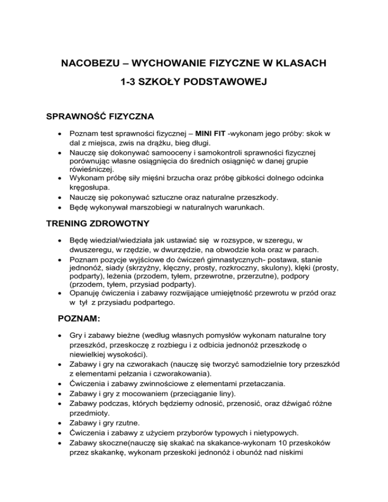 NACOBEZU – WYCHOWANIE FIZYCZNE W KLASACH 1-3 SZKOŁY PODSTAWOWEJ SPRAWNOŚĆ FIZYCZNA Poznam test sprawności fizycznej – MINI FIT -wykonam jego próby: skok w dal z miejsca, zwis na drążku, bieg długi. Nauczę się dokonywać samooceny i samokontroli sprawności fizycznej porównując własne osiągnięcia do średnich osiągnięć w danej grupie rówieśniczej. Wykonam próbę siły mięśni brzucha oraz próbę gibkości dolnego odcinka kręgosłupa. Nauczę się pokonywać sztuczne oraz naturalne przeszkody. Będę wykonywał marszobiegi w naturalnych warunkach. TRENING ZDROWOTNY Będę wiedział/wiedziała jak ustawiać się w rozsypce, w szeregu, w dwuszeregu, w rzędzie, w dwurzędzie, na obwodzie koła oraz w parach. Poznam pozycje wyjściowe do ćwiczeń gimnastycznych- postawa, stanie jednonóż, siady (skrzyżny, klęczny, prosty, rozkroczny, skulony), klęki (prosty, podparty), leżenia (przodem, tyłem, przewrotne, przerzutne), podpory (przodem, tyłem, przysiad podparty). Opanuję ćwiczenia i zabawy rozwijające umiejętność przewrotu w przód oraz w tył z przysiadu podpartego. POZNAM: Gry i zabawy bieżne (według własnych pomysłów wykonam naturalne tory przeszkód, przeskoczę z rozbiegu i z odbicia jednonóż przeszkodę o niewielkiej wysokości). Zabawy i gry na czworakach (nauczę się tworzyć samodzielnie tory przeszkód z elementami pełzania i czworakowania). Ćwiczenia i zabawy zwinnościowe z elementami przetaczania. Zabawy i gry z mocowaniem (przeciąganie liny). Zabawy podczas, których będziemy odnosić, przenosić, oraz dźwigać różne przedmioty. Zabawy i gry rzutne. Ćwiczenia i zabawy z użyciem przyborów typowych i nietypowych. Zabawy skoczne(nauczę się skakać na skakance-wykonam 10 przeskoków przez skakankę, wykonam przeskoki jednonóż i obunóż nad niskimi przeszkodami, wykonamy z marszu lub z biegu skok zawrotny nad niską przeszkodą). Zabawy z tańcem i śpiewem (ćwiczenia rytmiczne przy muzyce lub bez muzyki ,reagowanie ruchem na zmiany tempa i dynamiki w muzyce, improwizacja ruchowa przy muzyce, przedstawianie ruchem nastroju i treści pozamuzycznych w słuchanym utworze, ilustracja ruchowa znanych piosenek, podstawowe kroki krakowiaka indywidualnie, podstawowe kroki polki indywidualnie, elementy tańca regionalnego). Będę potrafił/potrafiła wykonać ćwiczenia równoważne bez przyboru, z przyborem na przyrządzie typowym oraz nietypowym. Przejdę po listwie odwróconej ławeczki gimnastycznej, wykonując dodatkowe ćwiczenie (przysiad, obrót, podskok). Poznam ćwiczenia kształtujące bez użycia przyborów oraz z lekkimi przyborami: piłkami, woreczkami, szarfami, krążkami, skakankami. SPORTY CAŁEGO ŻYCIA I WYPOCZYNEK GRY ZESPOŁOWE: mini-piłka siatkowa; poznam ćwiczenia, zabawy i gry rozwijające umiejętność odbicia oburącz górnego i dolnego balonami oraz lekkimi piłkami. mini-piłka ręczna; poznam ćwiczenia, zabawy i gry rozwijające umiejętność chwytów i rzutów piłki jednorącz i oburącz, rzutu do celu oraz kozłowania piłki w miejscu. mini-koszykówka; poznam ćwiczenia, zabawy i gry rozwijające umiejętność podania i chwytu piłki oburącz, rzutu do celu (obręczy, koła, kosza), kozłowania piłki w miejscu. mini-piłka nożna; poznam ćwiczenia, zabawy i gry rozwijające umiejętność prowadzenia piłki w marszu i biegu, przyjęcia i zatrzymania piłki, strzału na bramkę. Poznam przepisy powyższych mini-gier sportowych. Będę brał/brała udział w zabawach, mini grach i grach terenowych, zawodach sportowych. Nauczę się respektować reguły i podporządkowując się decyzjom sędziego. Będę wiedział/wiedziała jak należy zachować się w sytuacjach zwycięstwa i radzić sobie z porażkami w miarę swoich możliwości. ROWER Poznam podstawowe zasady ruchu drogowego. Nauczę się jeździć na rowerze. BEZPIECZEŃSTWO I EDUKACJA ZDROWOTNA Zawsze jestem przygotowany/przygotowana do zajęć, aktywnie w nich uczestniczę. Podczas każdej lekcji dbam o bezpieczeństwo swoje oraz innych. Znam przeznaczenie przyborów oraz przyrządów znajdujących się w magazynie sportowym oraz na sali gimnastycznej. Poznam niebezpieczeństwa mogące pojawić się w czasie zabaw na sali sportowej, boisku, na śniegu i lodzie oraz nad wodą. Potrafię wybrać bezpieczne miejsce do zabaw i gier ruchowych. Wiemy, do kogo zwrócić się o pomoc w sytuacji zagrożenia zdrowia lub życia. Będę miał/miała świadomość jak ważne jest zachowanie codziennej higieny osobistej i czystości odzieży. Podczas zajęć pokreślimy ważność wykonywania koniecznych zabiegów higienicznych: mycie rąk przed jedzeniem i po skorzystaniu z toalety, codzienne mycie całego ciała, codzienna zmiana bielizny, higiena jamy ustnej. Dowiem się jakie znaczenie dla zdrowia ma właściwe odżywianie się oraz aktywność fizyczna-poznamy sens uprawiania ćwiczeń ruchowych i ich wpływ na rozwój organizmu. Nauczę się nazwać części swojego ciała. Będę wiedział/wiedziała, że choroby są zagrożeniem dla zdrowia i że można im zapobiegać poprzez: szczepienia ochronne, właściwe odżywianie się, aktywność fizyczną, przestrzeganie higieny. Będę wiedział/wiedziała, że nie mogę samodzielnie zażywać lekarstw i stosować środków chemicznych (np. środków czystości, środków ochrony roślin). Będę miał/miała świadomość jak ważne w życiu człowieka jest dbanie o prawidłową postawę-dzięki tej świadomości, zawsze będę dbał o zachowanie prawidłowej podstawy, podczas wykonywania wszystkich czynności życia codziennego.