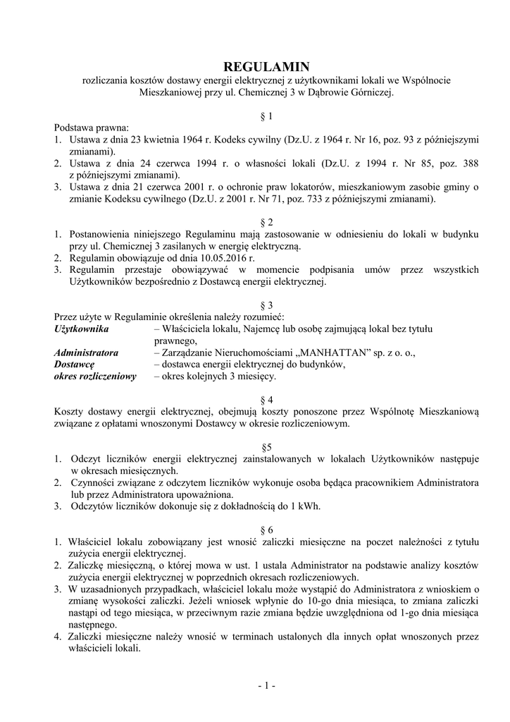 REGULAMIN rozliczania kosztów dostawy energii elektrycznej z użytkownikami lokali we Wspólnocie Mieszkaniowej przy ul. Chemicznej 3 w Dąbrowie Górniczej. §1 Podstawa prawna: 1. Ustawa z dnia 23 kwietnia 1964 r. Kodeks cywilny (Dz.U. z 1964 r. Nr 16, poz. 93 z późniejszymi zmianami). 2. Ustawa z dnia 24 czerwca 1994 r. o własności lokali (Dz.U. z 1994 r. Nr 85, poz. 388 z późniejszymi zmianami). 3. Ustawa z dnia 21 czerwca 2001 r. o ochronie praw lokatorów, mieszkaniowym zasobie gminy o zmianie Kodeksu cywilnego (Dz.U. z 2001 r. Nr 71, poz. 733 z późniejszymi zmianami). §2 1. Postanowienia niniejszego Regulaminu mają zastosowanie w odniesieniu do lokali w budynku przy ul. Chemicznej 3 zasilanych w energię elektryczną. 2. Regulamin obowiązuje od dnia 10.05.2016 r. 3. Regulamin przestaje obowiązywać w momencie podpisania umów przez wszystkich Użytkowników bezpośrednio z Dostawcą energii elektrycznej. §3 Przez użyte w Regulaminie określenia należy rozumieć: Użytkownika – Właściciela lokalu, Najemcę lub osobę zajmującą lokal bez tytułu prawnego, Administratora – Zarządzanie Nieruchomościami „MANHATTAN” sp. z o. o., Dostawcę – dostawca energii elektrycznej do budynków, okres rozliczeniowy – okres kolejnych 3 miesięcy. §4 Koszty dostawy energii elektrycznej, obejmują koszty ponoszone przez Wspólnotę Mieszkaniową związane z opłatami wnoszonymi Dostawcy w okresie rozliczeniowym. §5 1. Odczyt liczników energii elektrycznej zainstalowanych w lokalach Użytkowników następuje w okresach miesięcznych. 2. Czynności związane z odczytem liczników wykonuje osoba będąca pracownikiem Administratora lub przez Administratora upoważniona. 3. Odczytów liczników dokonuje się z dokładnością do 1 kWh. 1. 2. 3. 4. §6 Właściciel lokalu zobowiązany jest wnosić zaliczki miesięczne na poczet należności z tytułu zużycia energii elektrycznej. Zaliczkę miesięczną, o której mowa w ust. 1 ustala Administrator na podstawie analizy kosztów zużycia energii elektrycznej w poprzednich okresach rozliczeniowych. W uzasadnionych przypadkach, właściciel lokalu może wystąpić do Administratora z wnioskiem o zmianę wysokości zaliczki. Jeżeli wniosek wpłynie do 10-go dnia miesiąca, to zmiana zaliczki nastąpi od tego miesiąca, w przeciwnym razie zmiana będzie uwzględniona od 1-go dnia miesiąca następnego. Zaliczki miesięczne należy wnosić w terminach ustalonych dla innych opłat wnoszonych przez właścicieli lokali. -1- §7 1. Po zakończeniu okresu rozliczeniowego, Administrator dokonuje rozliczenia kosztów dostawy energii elektrycznej na poszczególnych Użytkowników. Efektem rozliczenia jest dokument przedstawiający wyliczenie należności za energię elektryczną za okres rozliczeniowy uwzględniający sumę naliczonych w tym okresie Użytkownikowi zaliczek. 2. Rozliczenie kosztów dostawy na poszczególnych Użytkowników odbywa się wg następujących wzorów: KU K WU W gdzie: KU = koszt dostawy energii przypadający na Użytkownika w zł, K = koszty dostawy energii wykazane w fakturze Dostawcy w zł, W = ilość kWh wykazanych w fakturze Dostawcy, Wu = ilość kWh zużytych przez Użytkownika. §8 1. Jeżeli w wyniku rozliczenia kosztów dostawy energii elektrycznej nastąpi nadpłata, wysokość nadpłaty zostaje zaliczona na poczet zaległych lub bieżących opłat miesięcznych właściciela związanych z utrzymaniem jego lokalu. 2. Jeżeli suma zaliczek miesięcznych nie pokryje należności wynikającej z rozliczenia (niedopłata), właściciel lokalu zobowiązany jest dopłacić brakującą kwotę równocześnie z najbliższą wpłatą należności na opłaty związane z utrzymaniem jego lokalu. 3. W przypadku zmiany właściciela lokalu w trakcie trwania okresu rozliczeniowego, rozliczenia kosztów dokonują między sobą poprzedni i nowy właściciel lokalu, bez udziału Administratora. Skutki rozliczenia całego okresu rozliczeniowego Administrator rozlicza z nowym właścicielem lokalu. §9 Regulamin został zatwierdzony Uchwałą Wspólnoty Mieszkaniowej nr 9/2016 z dnia 19.05.2016 r. -2-