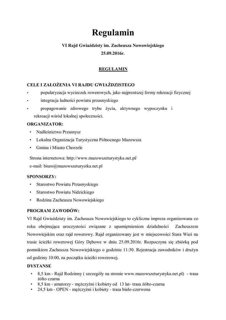 Regulamin VI Rajd Gwiaździsty im. Zacheusza Nowowiejskiego 25.09.2016r. REGULAMIN CELE I ZAŁOŻENIA VI RAJDU GWIAŹDZISTEGO • popularyzacja wycieczek rowerowych, jako najprostszej formy rekreacji fizycznej • integracja ludności powiatu przasnyskiego • propagowanie zdrowego trybu życia, aktywnego wypoczynku i rekreacji wśród lokalnej społeczności. ORGANIZATOR: • Nadleśnictwo Przasnysz • Lokalna Organizacja Turystyczna Północnego Mazowsza • Gmina i Miasto Chorzele Strona internetowa: http://www.mazowszeturystyka.net.pl/ e-mail: [email protected] SPONSORZY: • Starostwo Powiatu Przasnyskiego • Starostwo Powiatu Nidzickiego • Rodzina Zacheusza Nowowiejskiego PROGRAM ZAWODÓW: VI Rajd Gwiaździsty im. Zacheusza Nowowiejskiego to cykliczna impreza organizowana co roku obejmująca uroczystości związane z upamiętnieniem działalności Zacheuszem Nowowiejskim oraz rajd rowerowy. Rajd organizowany jest w miejscowości Stara Wieś na trasie ścieżki rowerowej Góry Dębowe w dniu 25.09.2016r. Rozpoczyna się zbiórką pod pomnikiem Zacheusza Nowowiejskiego o godzinie 11:30. Rejestracja zawodników i drużyn od godziny 10:00, na początku ścieżki rowerowej. DYSTANSE • • • 8,5 km - Rajd Rodzinny ( szczegóły na stronie www.mazowszeturystyka.net.pl) - trasa żółto czarna 8,5 km - amatorzy - mężczyźni i kobiety od 13 lat- trasa żółto-czarna 24,5 km - OPEN - mężczyźni i kobiety - trasa biało-czerwona WARUNKI UCZESTNICTWA • Impreza ma charakter otwarty. Prawo uczestnictwa w rajdzie na trasie 8,5 km amatorzy mają osoby w wieku powyżej13 lat , jeżeli posiadają pisemną zgodę rodziców lub opiekunów. Na trasie 24,5 km OPEN mogą startować wyłącznie osoby dorosłe. • Warunkiem dopuszczenia do rajdu jest złożenie podpisanego własnoręcznie oświadczenia o braku przeciwwskazań zdrowotnych do udziału w rajdzie. • Każdy uczestnik startuje na własną odpowiedzialność (w przypadku uczestników niepełnoletnich na odpowiedzialność rodziców lub opiekunów). • Uczestnicy muszą dokonać zgłoszenia drogą elektroniczną lub osobiście w biurze rajdu. • Zgłoszenia należy dokonywać wypełniając formularz zgłoszeniowy dostępny na stronie www.mazowszeturystyka.net.pl. • Zgłoszenia będą przyjmowane do wyczerpania miejsc startowych. Decyduje kolejność zgłoszeń. • Warunkiem uczestnictwa jest posiadanie kasku ochronnego sztywnego. • W Rajdzie Rodzinnym biorą udział drużyny rodzinne skłądające sie conajmniej z 3 spokrewnionych osób w tym musi być dziecko do lat 13. Kapitan drużyny podczas rejestracji przekazuje oświadczenie o składzie drużyny i o spełnieniu wymogów rajdu. Wzrór oświadczenia na stronie lub w punkcie rejestracji. • Konkurs wiedzy o Zacheuszu Nowowiejskim przeprowadzony zostanie podczas pikniku integracyjnego. Zakres wiedzy obowiązujący na konkurs dostępny na stronach https://pl.wikipedia.org/wiki/Wiktor_Zacheusz_Nowowiejski http://podziemiezbrojne.blox.pl/2009/03/ZABIC-JEZA-czesc-1.html NAGRODY: • W każdej z klasyfikacji (kobiet i mężczyzn) za zajęcie miejsc 1-3 SATYSFAKCJA, SPLENDOR, TROFEA oraz NIESPODZIANKI. • Po ukończeniu rajdu każdy zawodnik otrzyma pamiątkowy medal. • W rajdzie rodzinnym Puchar Starosty Przasnyskiego zdobywa najliczniejsza drużyna rodzinna, której wszyscy uczestnicy ukończą przewidziany dystans. • W przypadku drużyn o takiej samej ilości osób o zwycięstwie zadecyduje największa rozpiętość wieku w drużynie. • Nagrodę w konkursie zdobywa uczestnik wykazujący się największą wiedzą o życiu i działalności Zacheusza Nowowiejskiego. POSTANOWIENIA KOŃCOWE: • Rajd odbędzie się bez względu na pogodę. • Organizatorzy zapewniają opiekę lekarską w trakcie trwania imprezy. • Organizatorzy nie zapewniają szatni, natrysków i toalet w trakcie trwania imprezy. • Uczestnicy ubezpieczają się we własnym zakresie. Organizator nie ubezpiecza uczestników na czas zawodów. • Każdy uczestnik jest zobowiązany do zachowania warunków bezpieczeństwa na trasie rajdu. • Organizator nie ponosi odpowiedzialności materialnej za rzeczy zaginione w trakcie trwania rajdu. • Wszyscy zawodnicy proszeni są o nie zaśmiecanie trasy rajdu i szczególną troskę o środowisko naturalne. • Uczestnik rajdu wypełniając i podpisując kartę zgłoszeniową akceptuje warunki niniejszego regulaminu. • Organizator z Sędzią Głównym, zastrzega sobie prawo do interpretacji niniejszego regulaminu oraz do jego zmian.