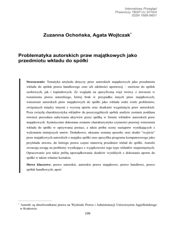Internetowy Przegląd Prawniczy TBSP UJ 2016/4 ISSN 1689-9601 Zuzanna Ochońska, Agata Wojtczak* Problematyka autorskich praw majątkowych jako przedmiotu wkładu do spółki Streszczenie: Tematyka artykułu dotyczy praw autorskich majątkowych jako przedmiotu wkładu do spółek prawa handlowego oraz ich zdolności aportowej – zarówno do spółek osobowych, jak i kapitałowych. Ze względu na specyficzną więź twórcy z utworem w rozumieniu prawa autorskiego, której brak w przypadku innych praw majątkowych, wniesienie autorskich praw majątkowych do spółki jako wkładu rodzi wiele problemów, związanych między innymi z wyceną aportu oraz skutkami wygaśnięcia praw autorskich. Poza zwięzłą charakterystyką wkładów do poszczególnych spółek analizie zostanie poddana również procedura nabywania aktywów przez spółkę w formie wkładów autorskich praw majątkowych. Syntetycznie dokonana zostanie charakterystyka czynności prawnej wniesienia wkładu do spółki w opisywanej postaci, a także próba oceny następstw wynikających z wykonania niniejszych umów. Dodatkowo, ukazane zostaną sposoby oraz skutki “wyjścia” praw majątkowych autorskich z majątku spółki oraz specyfika programu komputerowego jako przykładu utworu, do którego prawa często stanowią przedmiot wkład do spółki. Autorki zwracają uwagę na problemy wynikające z wyjątkowości tego typu wkładów niepieniężnych. Opracowanie jest także próbą uporządkowania skutków wynikłych z dokonania aportu do spółki w takim właśnie kształcie. Słowa kluczowe: prawo autorskie, autorskie prawa majątkowe, prawo handlowe, prawo spółek handlowych, aport ∗ Autorki są absolwentkami prawa na Wydziale Prawa i Administracji Uniwersytetu Jagiellońskiego w Krakowie. (108 1. ZAGADNIENIA WSTĘPNE Majątkowe prawa autorskie znacznie rzadziej niż majątkowe prawa własności przemysłowej są przedmiotem wkładu do spółki prawa handlowego. Nie można jednak wykluczyć sytuacji, w której zarówno dla spółki, jak i dla twórcy, względnie właściciela majątkowych praw autorskich do utworu, korzystne będzie wniesienie do majątku podmiotu takich praw. Ze względu na specyficzną więź twórcy z utworem w rozumieniu prawa autorskiego, której brak w przypadku innych praw majątkowych, wniesienie autorskich praw majątkowych do spółki napotyka na wiele trudności, między innymi związanych z wyceną aportu oraz skutkami wygaśnięcia tych praw. W celu ustalenia, w jaki sposób prawidłowo wnieść wkład w postaci autorskich praw majątkowych, niezbędne jest wskazanie, na czym polega niepieniężny wkład do spółki, co może stanowić przedmiot aportu, czym jest majątek spółki oraz w jaki sposób wnosi się wkład do poszczególnych spółek prawa handlowego. Przedmiotem niniejszego opracowania będzie próba dokonania zwięzłej analizy powyższych zagadnień, a także charakterystyki czynności zawieranych pomiędzy uprawnionym z tytułu majątkowych praw autorskich a spółką, zarówno osobową, jak i kapitałową, w ramach wniesienia przez wspólnika – autora (lub odpowiednio akcjonariusza – autora) wkładu do spółki w postaci praw autorskich do utworu, a także próba oceny następstw niniejszych umów. Na wstępie autorki chciały dokonać zastrzeżenia, że ilekroć w niniejszym artykule mowa będzie o „autorze”, mają one na myśli także podmiot uprawniony z tytułu autorskich praw majątkowych niebędący autorem (i na odwrót), chyba że co innego jasno wynikać będzie z treści opracowania. 1.1. Majątkowe prawa autorskie Ustawodawca polski, tworząc regulacje dotyczącą praw autorskich, oparł się na konstrukcji dualistycznej zakładającej współistnienie dwóch grup praw: osobistych i majątkowych. Osobiste prawa majątkowe zgodnie z regulacją ustawową są niezbywalne i nie podlegają zrzeczeniu się. W kontrze do powyższego autorskie prawa majątkowe podlegają zbyciu i mogą stać się swoistym „przedmiotem obrotu handlowego”. Art. 17 ustawy o prawie autorskim i prawach pokrewnych (pr.aut.)1, statuujący 1Ustawa o prawie autorskim i prawach pokrewnych z dnia 4 lutego 1994r., Dz.U.2006.90.631 j.t., z późn. zm. (109 majątkowe prawa autorskie, przyznaje twórcy (jeżeli ustawa nie stanowi inaczej) wyłączne prawo do korzystania z utworu i rozporządzania nim na wszystkich polach eksploatacji oraz do wynagrodzenia za korzystanie z utworu. Treść przytoczonej regulacji wskazuje na oparcie się ustawodawcy na modelu własnościowym autorskich praw majątkowych, który w swojej strukturze przypomina regulację prawa własności z Kodeksu cywilnego (k.c.)2. Należy jednak wyraźnie podkreślić, że ze względu na charakter praw autorskich i samego utworu nie można mówić o „prawie własności do dzieła” w rozumieniu art. 140 k.c., a należy posługiwać się odrębną regulacją, dostosowaną do specyfiki praw własności intelektualnej. W tym duchu wypowiada się także doktryna prawa cywilnego: „Odwołanie się przez ustawodawcę do modelu własnościowego nie oznacza, że majątkowe prawo autorskie jest rodzajem prawa własności”3, a także: „Najogólniej ujmując, model własnościowy polega na domniemaniu, że prawo przysługujące twórcy obejmuje każdy sposób korzystania z utworu, który nie został w wyraźny sposób wyłączony z jego treści, rozporządzania tym prawem i pobierania z tego tytułu wynagrodzenia”4. Tematyka niniejszej pracy wymaga zdefiniowania ujętego w art. 17 pr.aut. sformułowania „prawo do rozporządzania”. W doktrynie zgodnie przyjmuje się, że autor w ramach swoich uprawnień autorskich może dokonywać wszelkich rozporządzeń utworem i pobierać z tego tytułu korzyści majątkowe; wskazują na to m.in. J. Barta i R. Markiewicz: „[...] przez prawo do rozporządzania utworem należy rozumieć wszystkie postacie czynności prawnych podmiotu autorskich praw majątkowych, na podstawie któr
