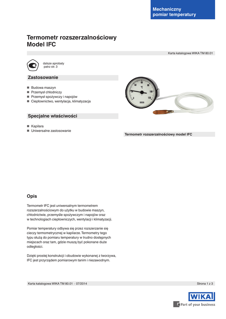 Mechaniczny pomiar temperatury Termometr rozszerzalnościowy Model IFC Karta katalogowa WIKA TM 80.01 dalsze aprobaty patrz str. 3 Zastosowanie ■■ Budowa maszyn ■■ Przemysł chłodniczy ■■ Przemysł spożywczy i napojów ■■ Ciepłownictwo, wentylacja, klimatyzacja Specjalne właściwości ■■ Kapilara ■■ Uniwersalne zastosowanie Termometr rozszerzalnościowy model IFC Opis Termometr IFC jest uniwersalnym termometrem rozszerzalnościowym do użytku w budowie maszyn, chłodnictwie, przemyśle spożywczym i napojów oraz w technologiach ciepłowniczych, wentylacji i klimatyzacji. Pomiar temperatury odbywa się przez rozszerzanie się cieczy termometrycznej w kapilarze. Termometry tego typu służą do pomiaru temperatury w trudno dostępnych miejscach oraz tam, gdzie muszą być pokonane duże odległości. Dzięki prostej konstrukcji i obudowie wykonanej z tworzywa, IFC jest przyrządem pomiarowym tanim i niezawodnym. Karta katalogowa WIKA TM 80.01 ∙ 07/2014 Strona 1 z 3 Wersja standardowa Rozmiary nominalne w mm 60, 80, 100, 72 x 72, 96 x 96 Dokładność pomiaru ±2 % zakresu pomiarowego przy temperaturze wzorcowej 23 °C na obudowie i linii pomiarowej Wyjście kapilary Montaż z tyłu, niewspółśrodkowy Obudowa Tworzywo sztuczne (ABS) Zakres pomiarowy -100 ... +400 °C Temperatura robocza Obudowa: Linia pomiarowa: ■■ Pokryta tworzywem ■■ Z miedzianym oplotem ■■ Ze stali nierdzewnej Długość linii pomiarowej Maks. 5 m -20 ... +70 °C -40 ... +120 °C -100 ... +350 °C Stopień ochrony obudowy Obudowa okrągła: IP 54 zgodnie z EN 60529 / IEC 529 Obudowa kwadratowa: IP 40 zgodnie z EN 60529 / IEC 529 Typ montażu Montaż panelowy z uchwytem mocującym -100 ... +400 °C Kąt wskazania Maks. 270 p° Tarcza Tworzywo białe, napisy czarne Zasada pomiaru System rurki Bourdona Opcje ■■ Obudowa ze stali nierdzewnej ■■ Wersja z obudową kwadratową ■■ Kołnierz do montażu panelowego ■■ Inne wykonania przyłączy (por. Informacje techniczne IN 00.20) ■■ Inne wymiary obudowy (NS 37, 40, 42, 52) Kapilara Pokryta tworzywem lub oplotem miedzianym Kapilara miedziana lub ze stali nierdzewnej 1.4571 w zależności od zakresu pomiarowego Wykonanie przyłączy Wersja standardowa Czujnik gładki (bez gwintu), SF94 Stop miedzi Długość czujnika = zmienna Średnica czujnika Ød = 6, 8, 8,5, 10 mm Przyłącze obrotowe SF91/SV20 Stop miedzi, R ⅜ Długość czujnika = zmienna Średnica czujnika Ød = 6, 8, 8,5, 10 mm Przyłącze obrotowe z wyjmowanym przyłączem gwintowanym SF91/SV19 M14 x 1.5, R ⅜, R ½, R ¾ Stop miedzi Długość czujnika = zmienna Średnica czujnika Ød = 6, 8, 8,5, 10 mm Inne wykonania przyłączy - por. Informacje techniczne IN 00.20 Strona 2 z 3 Karta katalogowa WIKA TM 80.01 ∙ 07/2014 Wymiary w mm NS 96 x 96 NS 100 IFC01-100K.01 IFC01-080K.01 NS 80 IFC01-096K.01 NS 72 x 72 IFC01-072K.01 NS 60 IFC01-060K.01 Wersja standardowa Aprobaty Certyfikaty (opcjonalne) ■■ GOST, metrologia/technologia pomiarów, Rosja ■■ Certyfikat kontrolny 2.2 wg EN 10204 (np. produkcja ■■ CRN, bezpieczeństwo (np. bezpieczeństwo elektryczne, nadciśnieniowe...), Kanada zgodna ze stanem techniki, zatwierdzenie materiału, dokładność wskazań) ■■ Certyfikat sprawdzenia 3.1 wg EN 10204 (np. dokładność wskazań) 07/2014 PL based on 07/2014 GB Aprobaty i certyfikaty znajdują się na stronie internetowej Informacje dotyczące zamówienia Model / Rozmiar nominalny / Zakres skali / Linia pomiarowa, długość pomiarowa / Wykonanie przyłącza / Opcje © 2013 WIKA Alexander Wiegand SE & Co. KG. Wszelkie prawa zastrzeżone. Specyfikacje podane w niniejszym dokumencie przedstawiają dane techniczne aktualne w momencie wydruku. Zastrzegamy sobie prawo do wykonywania zmian niniejszych specyfikacji i materiałów. Karta katalogowa WIKA TM 80.01 ∙ 07/2014 Strona 3 z 3 WIKA Polska spółka z ograniczoną odpowiedzialnością sp. k. Ul. Łęgska 29/35, 87-800 Włocławek Tel.: (+48) 54 23 01 100 Fax: (+48) 54 23 01 101 E-mail: [email protected] www.wikapolska.pl
