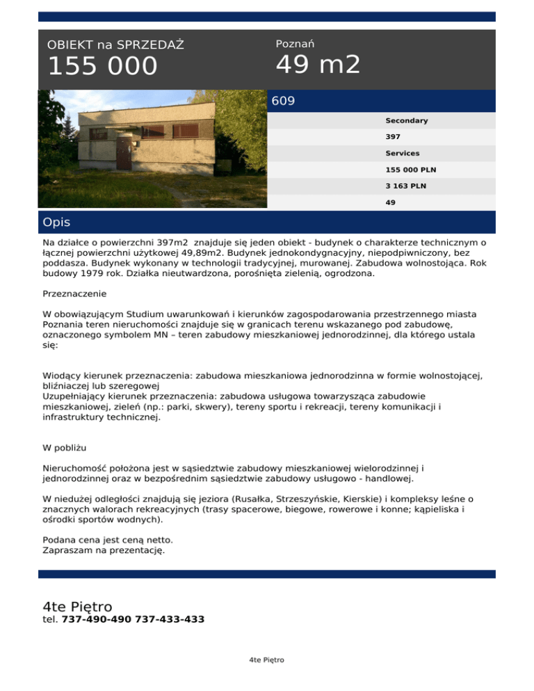OBIEKT na SPRZEDAŻ 155 000 Poznań 49 m2 609 Secondary 397 Services 155 000 PLN 3 163 PLN 49 Opis Na działce o powierzchni 397m2 znajduje się jeden obiekt - budynek o charakterze technicznym o łącznej powierzchni użytkowej 49,89m2. Budynek jednokondygnacyjny, niepodpiwniczony, bez poddasza. Budynek wykonany w technologii tradycyjnej, murowanej. Zabudowa wolnostojąca. Rok budowy 1979 rok. Działka nieutwardzona, porośnięta zielenią, ogrodzona. Przeznaczenie W obowiązującym Studium uwarunkowań i kierunków zagospodarowania przestrzennego miasta Poznania teren nieruchomości znajduje się w granicach terenu wskazanego pod zabudowę, oznaczonego symbolem MN – teren zabudowy mieszkaniowej jednorodzinnej, dla którego ustala się: Wiodący kierunek przeznaczenia: zabudowa mieszkaniowa jednorodzinna w formie wolnostojącej, bliźniaczej lub szeregowej Uzupełniający kierunek przeznaczenia: zabudowa usługowa towarzysząca zabudowie mieszkaniowej, zieleń (np.: parki, skwery), tereny sportu i rekreacji, tereny komunikacji i infrastruktury technicznej. W pobliżu Nieruchomość położona jest w sąsiedztwie zabudowy mieszkaniowej wielorodzinnej i jednorodzinnej oraz w bezpośrednim sąsiedztwie zabudowy usługowo - handlowej. W niedużej odległości znajdują się jeziora (Rusałka, Strzeszyńskie, Kierskie) i kompleksy leśne o znacznych walorach rekreacyjnych (trasy spacerowe, biegowe, rowerowe i konne; kąpieliska i ośrodki sportów wodnych). Podana cena jest ceną netto. Zapraszam na prezentację. 4te Piętro tel. 737-490-490 737-433-433 4te Piętro email: [email protected] 4te Piętro Powered by TCPDF (www.tcpdf.org)