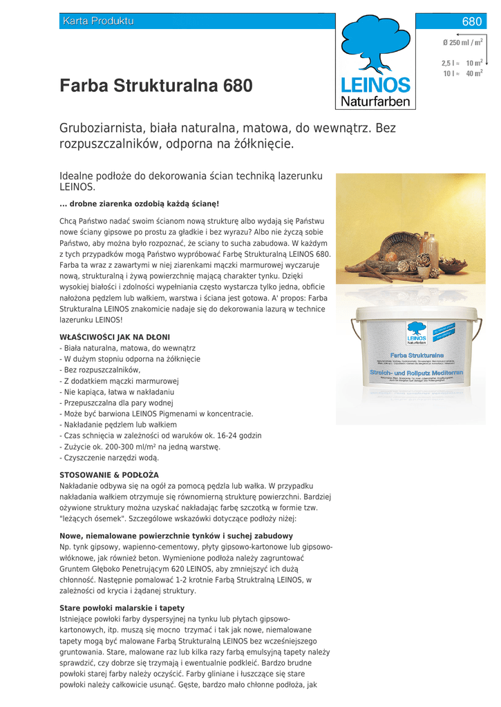 680 Farba Strukturalna 680 Gruboziarnista, biała naturalna, matowa, do wewnątrz. Bez rozpuszczalników, odporna na żółknięcie. Idealne podłoże do dekorowania ścian techniką lazerunku LEINOS. ... drobne ziarenka ozdobią każdą ścianę! Chcą Państwo nadać swoim ścianom nową strukturę albo wydają się Państwu nowe ściany gipsowe po prostu za gładkie i bez wyrazu? Albo nie życzą sobie Państwo, aby można było rozpoznać, że sciany to sucha zabudowa. W każdym z tych przypadków mogą Państwo wypróbować Farbę Strukturalną LEINOS 680. Farba ta wraz z zawartymi w niej ziarenkami mączki marmurowej wyczaruje nową, strukturalną i żywą powierzchnię mającą charakter tynku. Dzięki wysokiej białości i zdolności wypełniania często wystarcza tylko jedna, obficie nałożona pędzlem lub wałkiem, warstwa i ściana jest gotowa. A' propos: Farba Strukturalna LEINOS znakomicie nadaje się do dekorowania lazurą w technice lazerunku LEINOS! WŁAŚCIWOŚCI JAK NA DŁONI - Biała naturalna, matowa, do wewnątrz - W dużym stopniu odporna na żółknięcie - Bez rozpuszczalników, - Z dodatkiem mączki marmurowej - Nie kapiąca, łatwa w nakładaniu - Przepuszczalna dla pary wodnej - Może być barwiona LEINOS Pigmenami w koncentracie. - Nakładanie pędzlem lub wałkiem - Czas schnięcia w zależności od waruków ok. 16-24 godzin - Zużycie ok. 200-300 ml/m² na jedną warstwę. - Czyszczenie narzędzi wodą. STOSOWANIE & PODŁOŻA Nakładanie odbywa się na ogół za pomocą pędzla lub wałka. W przypadku nakładania wałkiem otrzymuje się równomierną strukturę powierzchni. Bardziej ożywione struktury można uzyskać nakładając farbę szczotką w formie tzw. "leżących ósemek". Szczególowe wskazówki dotyczące podłoży niżej: Nowe, niemalowane powierzchnie tynków i suchej zabudowy Np. tynk gipsowy, wapienno-cementowy, płyty gipsowo-kartonowe lub gipsowowłóknowe, jak również beton. Wymienione podłoża należy zagruntować Gruntem Głęboko Penetrującym 620 LEINOS, aby zmniejszyć ich dużą chłonność. Następnie pomalować 1-2 krotnie Farbą Struktralną LEINOS, w zależności od krycia i żądanej struktury. Stare powłoki malarskie i tapety Istniejące powłoki farby dyspersyjnej na tynku lub płytach gipsowokartonowych, itp. muszą się mocno trzymać i tak jak nowe, niemalowane tapety mogą być malowane Farbą Strukturalną LEINOS bez wcześniejszego gruntowania. Stare, malowane raz lub kilka razy farbą emulsyjną tapety należy sprawdzić, czy dobrze się trzymają i ewentualnie podkleić. Bardzo brudne powłoki starej farby należy oczyścić. Farby gliniane i łuszczące się stare powłoki należy całkowicie usunąć. Gęste, bardzo mało chłonne podłoża, jak farby lateksowe i lakiery należy bardzo starannie oszlifować lub wyługować. Generalnie nie jest wymagane gruntowanie w przypadku istniejących, przyczepnych starych powłok chyba, że muszą zostać całkowicie usunięte. PORADY & WSKAZÓWKI Test na ślinę Czy mamy do czynienia z farbą klejową, czy inną rozpuszczalną powłoką, możemy sprawdzić za pomocą tzw. "testu na ślinę". W tym celu dać nieco śliny na koniec palca i z lekkim naciskiem wcierać w podłoże. Jeżeli ślina przebarwi się na kolor podłoża, powłoka musi zostać całkowicie usunięta lub zmyta ze ściany. Obfite Nakładanie Jeżeli zamierzeniem Państwa jest uzyskanie grubszej struktury, to można spokojnie nałożyć Farby Strukturalnej LEINOS nieco więcej. Farba trzyma się ściany i nie opada. Farbę można również nakładać w kombinacji technik, tzn. najpierw nanosić farbę wałkiem, a później rozprowadzać ją szczotką. Zastosowanie: Do łatwego wykonywania dyfuzyjnych tynków strukturalnych na podłożach mineralnych, płytach wiórowych i gipsowokartonowych wewnątrz pomieszczeń. Bardzo dobry podkład pod Technikę Lazerunku LEINOS. Właściwości techniczne: Tiksotropowa, łatwa w nakładaniu, dobrze kryjąca. Przepuszczalna dla pary wodnej. Kolor: Biała naturalna. Może być dowolnie barwiona LEINOS Pigmentami w Koncentracie 668. Składniki: Woda, kreda, dwutlenek tytanu, emulgator roślinny, kwas poliasparaginowy, zagęszczony olej krokoszowy, celuloza, talk, kaolin, metyloceluloza, benzisothiazolinone. Zawartość LZO (lotnych związków organicznych) w produkcie wynosi maks. 1 g/l. Dopuszczalny limit UE wynosi maks. 30 g/l (kategoria „a” od 2010). Podłoże i przygotowanie: Podłoże musi być neutralne chemicznie, suche, stabilne, czyste, wolne od tłuszczu i kurzu, bez substancji przebijających. Nowe tynki wapienne i cementowe muszą być wysezonowane do stanu powietrzno-suchego. Jeszcze nie całkowicie związane, kwasowo lub alkalicznie reagujące lub chłonnych podłoża należy najpierw zagruntować Gruntem Głęboko Penetrującym 620 LEINOS. Bardzo chłonne, labilne podłoża i piaszczące tynki muszą również zostać zagruntowane Gruntem Głęboko Penetrującym 620 LEINOS. Sposó b stosowania: Pędzlem, wałkiem. Temperatura pomieszczenia i powierzchni powyżej 15˚C. Czas schnięcia: Ok. 16 – 24 godzin. Całkowicie sucha po ok. 1 tygodniu. Wielkość opakowań i zużycie: Ok. 250 - 300 ml/m2 na jedno nałożenie. Może odbiegać od normy w zależności od chłonności podłoża. Opakowanie wystarcza na...* 2,5l 10 m2 10l 40 m2 * średnia wydajność na jedną warstwę Przechowywanie i trwałość: Oryginalnie zamknięta jest przydatna do użycia przez okres ok. 12 miesięcy. Przechowywać w zamkniętym opakowaniu w chłodnym i suchym miejscu. Chronić przed mrozem. Utylizacja: Zgodnie z lokalnymi, urzędowymi przepisami. Wysuszone resztki produktu mogą być usuwane do śmieci komunalnych. Europejski kod odpadu EWC: 08 01 20. Środki rozcieńczające i czyszczące: Woda i LEINOS Mydło Roślinne 930. Produkt jest gotowy do użycia. GISCODE: M-DF 01 Zwroty wskazujące środki ostrożności: Zawiera 1,2-benzoizotiazol-3(2H)-on. Może powodować wys