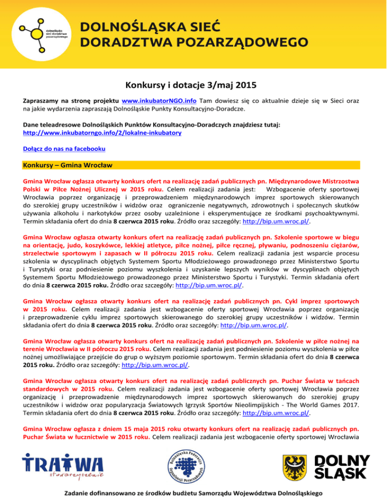 Konkursy i dotacje 3/maj 2015 Zapraszamy na stronę projektu www.inkubatorNGO.info Tam dowiesz się co aktualnie dzieje się w Sieci oraz na jakie wydarzenia zapraszają Dolnośląskie Punkty Konsultacyjno-Doradcze. Dane teleadresowe Dolnośląskich Punktów Konsultacyjno-Doradczych znajdziesz tutaj: http://www.inkubatorngo.info/2/lokalne-inkubatory Dołącz do nas na facebooku Konkursy – Gmina Wrocław Gmina Wrocław ogłasza otwarty konkurs ofert na realizację zadań publicznych pn. Międzynarodowe Mistrzostwa Polski w Piłce Nożnej Ulicznej w 2015 roku. Celem realizacji zadania jest: Wzbogacenie oferty sportowej Wrocławia poprzez organizację i przeprowadzeniem międzynarodowych imprez sportowych skierowanych do szerokiej grupy uczestników i widzów oraz ograniczenie negatywnych, zdrowotnych i społecznych skutków używania alkoholu i narkotyków przez osoby uzależnione i eksperymentujące ze środkami psychoaktywnymi. Termin składania ofert do dnia 8 czerwca 2015 roku. Źródło oraz szczegóły: http://bip.um.wroc.pl/. Gmina Wrocław ogłasza otwarty konkurs ofert na realizację zadań publicznych pn. Szkolenie sportowe w biegu na orientację, judo, koszykówce, lekkiej atletyce, piłce nożnej, piłce ręcznej, pływaniu, podnoszeniu ciężarów, strzelectwie sportowym i zapasach w II półroczu 2015 roku. Celem realizacji zadania jest wsparcie procesu szkolenia w dyscyplinach objętych Systemem Sportu Młodzieżowego prowadzonego przez Ministerstwo Sportu i Turystyki oraz podniesienie poziomu wyszkolenia i uzyskanie lepszych wyników w dyscyplinach objętych Systemem Sportu Młodzieżowego prowadzonego przez Ministerstwo Sportu i Turystyki. Termin składania ofert do dnia 8 czerwca 2015 roku. Źródło oraz szczegóły: http://bip.um.wroc.pl/. Gmina Wrocław ogłasza otwarty konkurs ofert na realizację zadań publicznych pn. Cykl imprez sportowych w 2015 roku. Celem realizacji zadania jest wzbogacenie oferty sportowej Wrocławia poprzez organizację i przeprowadzenie cyklu imprez sportowych skierowanego do szerokiej grupy uczestników i widzów. Termin składania ofert do dnia 8 czerwca 2015 roku. Źródło oraz szczegóły: http://bip.um.wroc.pl/. Gmina Wrocław ogłasza otwarty konkurs ofert na realizację zadań publicznych pn. Szkolenie w piłce nożnej na terenie Wrocławia w II półroczu 2015 roku. Celem realizacji zadania jest podniesienie poziomu wyszkolenia w piłce nożnej umożliwiające przejście do grup o wyższym poziomie sportowym. Termin składania ofert do dnia 8 czerwca 2015 roku. Źródło oraz szczegóły: http://bip.um.wroc.pl/. Gmina Wrocław ogłasza otwarty konkurs ofert na realizację zadań publicznych pn. Puchar Świata w tańcach standardowych w 2015 roku. Celem realizacji zadania jest wzbogacenie oferty sportowej Wrocławia poprzez organizację i przeprowadzenie międzynarodowych imprez sportowych skierowanych do szerokiej grupy uczestników i widzów oraz popularyzacja Światowych Igrzysk Sportów Nieolimpijskich - The World Games 2017. Termin składania ofert do dnia 8 czerwca 2015 roku. Źródło oraz szczegóły: http://bip.um.wroc.pl/. Gmina Wrocław ogłasza z dniem 15 maja 2015 roku otwarty konkurs ofert na realizację zadań publicznych pn. Puchar Świata w łucznictwie w 2015 roku. Celem realizacji zadania jest wzbogacenie oferty sportowej Wrocławia Zadanie dofinansowano ze środków budżetu Samorządu Województwa Dolnośląskiego poprzez organizację i przeprowadzenie międzynarodowych imprez sportowych skierowanych do szerokiej grupy uczestników i widzów. Termin składania ofert do dnia 8 czerwca 2015 roku. Źródło oraz szczegóły: http://bip.um.wroc.pl/. Gmina Wrocław ogłasza otwarty konkurs ofert na realizację zadań publicznych pn. Wsparcie edukacji w zakresie przedsiębiorczości dla uczniów szkół gimnazjalnych i ponadgimnazjalnych – młode wrocławskie marki. Celem realizacji zadania jest: 1. Rozpoznawanie, nabywanie i ćwiczenie cech znamionujących przedsiębiorczość, ze szczególnym uwzględnieniem umiejętności: dostrzegania szans i ich wykorzystywania, oceny ryzyka i gotowości do jego podjęcia, kojarzenia faktów i wyciągania trafnych wniosków, pracy zespołowej, innowacyjności w rozumieniu ciągłego poszukiwania twórczych rozwiązań 2. Zapoznanie uczniów z historiami młodych wrocławskich firm 3. Dostarczenie nauczycielom przedsiębiorczości oraz szkolnym doradcom zawodowym gotowego narzędzia edukacyjnego w zakresie edukacji przedsiębiorczości Termin składania ofert do dnia 10 czerwca 2015 roku. Źródło oraz szczegóły: http://bip.um.wroc.pl/. Gmina Wrocław ogłasza otwarty konkurs ofert na realizację zadań publicznych pn. Utworzenie i prowadzenie Centrum Informacyjnego na Ostrowie Tumskim we Wrocławiu wraz z pracami adaptacyjnymi oraz wyposażeniem pomieszczeń. Celem zadania jest: utworzenie i zorganizowanie Centrum Informacyjnego na Ostrowie Tumskim, prowadzenie Centrum Informacyjnego na Ostrowie Tumskim, a w szczególności zapewnienie turystom (polskim jak i zagranicznym) oraz mieszkańcom Wrocławia odwiedzającym Ostrów Tumski rzetelnej i kompleksowej informacji (w języku polskim i angielskim) na temat: a) historii Ostrowa Tumskiego, b) możliwości zwiedzania Ostrowa Tumskiego oraz innych obiektów o wartości historycznej i kulturalnej na terenie Wrocławia, c) wydarzeń kulturalnych na Ostrowie Tumskim i we Wrocławiu (spotkania, prelekcje, wystawy, koncerty, itp.), d) wydarzeń kulturalnych składających się na projekt Wrocław Europejska Stolica Kultury 2016 oraz Wrocław The World Games 2017, e) zakresu działalności poradni prawnych i rodzinnych oraz innych miejsc, w których można skorzystać ze wsparcia socjalnego, społecznego, poradnictwa zdrowotnego i innego f) finansowanego ze środków publicznych. Termin składania ofert do dnia 15 czerwca 2015 r. Źródło oraz szczegóły: http://bip.um.wroc.pl/. Konkursy – Urząd Marszałkowski Dotacje udzielane 