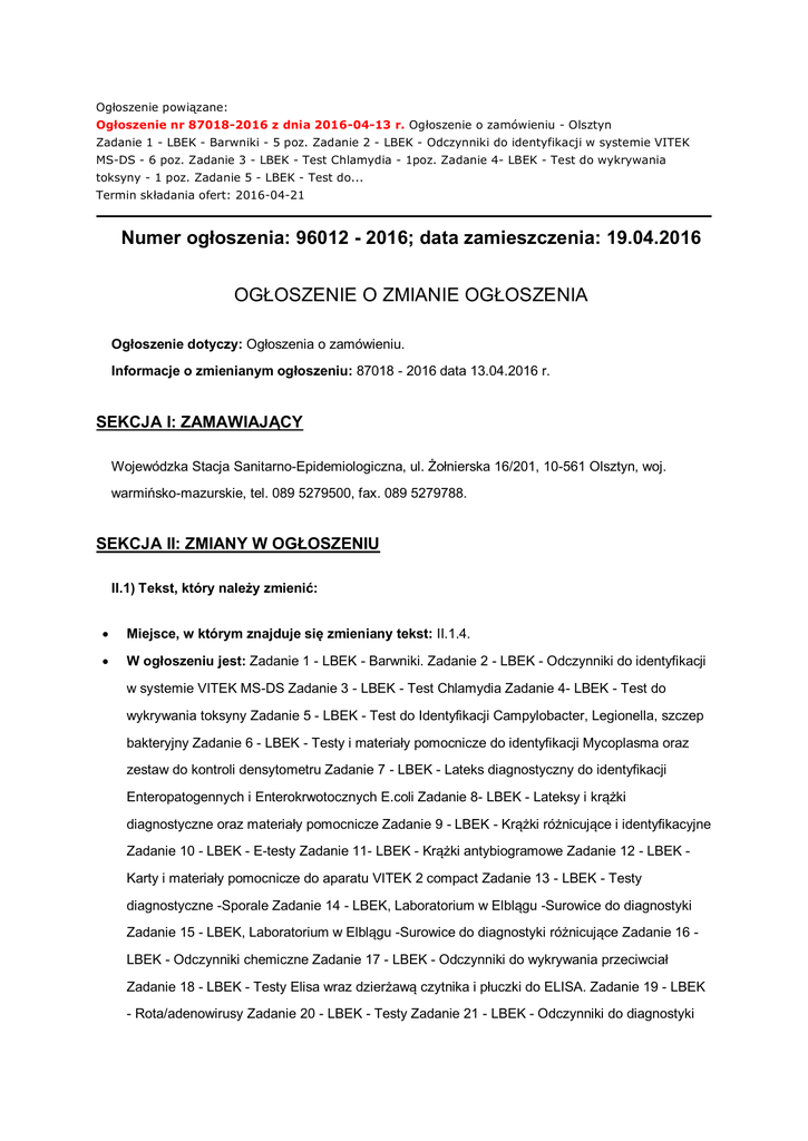 Ogłoszenie powiązane: Ogłoszenie nr 87018-2016 z dnia 2016-04-13 r. Ogłoszenie o zamówieniu - Olsztyn Zadanie 1 - LBEK - Barwniki - 5 poz. Zadanie 2 - LBEK - Odczynniki do identyfikacji w systemie VITEK MS-DS - 6 poz. Zadanie 3 - LBEK - Test Chlamydia - 1poz. Zadanie 4- LBEK - Test do wykrywania toksyny - 1 poz. Zadanie 5 - LBEK - Test do... Termin składania ofert: 2016-04-21 Numer ogłoszenia: 96012 - 2016; data zamieszczenia: 19.04.2016 OGŁOSZENIE O ZMIANIE OGŁOSZENIA Ogłoszenie dotyczy: Ogłoszenia o zamówieniu. Informacje o zmienianym ogłoszeniu: 87018 - 2016 data 13.04.2016 r. SEKCJA I: ZAMAWIAJĄCY Wojewódzka Stacja Sanitarno-Epidemiologiczna, ul. Żołnierska 16/201, 10-561 Olsztyn, woj. warmińsko-mazurskie, tel. 089 5279500, fax. 089 5279788. SEKCJA II: ZMIANY W OGŁOSZENIU II.1) Tekst, który należy zmienić: Miejsce, w którym znajduje się zmieniany tekst: II.1.4. W ogłoszeniu jest: Zadanie 1 - LBEK - Barwniki. Zadanie 2 - LBEK - Odczynniki do identyfikacji w systemie VITEK MS-DS Zadanie 3 - LBEK - Test Chlamydia Zadanie 4- LBEK - Test do wykrywania toksyny Zadanie 5 - LBEK - Test do Identyfikacji Campylobacter, Legionella, szczep bakteryjny Zadanie 6 - LBEK - Testy i materiały pomocnicze do identyfikacji Mycoplasma oraz zestaw do kontroli densytometru Zadanie 7 - LBEK - Lateks diagnostyczny do identyfikacji Enteropatogennych i Enterokrwotocznych E.coli Zadanie 8- LBEK - Lateksy i krążki diagnostyczne oraz materiały pomocnicze Zadanie 9 - LBEK - Krążki różnicujące i identyfikacyjne Zadanie 10 - LBEK - E-testy Zadanie 11- LBEK - Krążki antybiogramowe Zadanie 12 - LBEK Karty i materiały pomocnicze do aparatu VITEK 2 compact Zadanie 13 - LBEK - Testy diagnostyczne -Sporale Zadanie 14 - LBEK, Laboratorium w Elblągu -Surowice do diagnostyki Zadanie 15 - LBEK, Laboratorium w Elblągu -Surowice do diagnostyki różnicujące Zadanie 16 LBEK - Odczynniki chemiczne Zadanie 17 - LBEK - Odczynniki do wykrywania przeciwciał Zadanie 18 - LBEK - Testy Elisa wraz dzierżawą czytnika i płuczki do ELISA. Zadanie 19 - LBEK - Rota/adenowirusy Zadanie 20 - LBEK - Testy Zadanie 21 - LBEK - Odczynniki do diagnostyki CMV, EBV, BKV metodą Real-time PCR Zadanie 22 - LBEK - Borrelia Western Blot Zadanie 23 LBEK - Norowirusy ELISA Zadanie 24 - LBEK - Zestawy do ilościowego oznaczania wirusa HBV, HCV oraz zestaw do izolacji wirusowych. Zadanie 25 - LBEK - Testy do diagnostyki in vitro wraz z dzierżawą Systemu Real Time PCR Zadanie 26 - LBEK - Testy na alergię Zadanie 27 - LBŚiŻ Odczynniki do reakcji Real Time PCR - wirusy Zadanie 28- LBŚiŻ - Zestaw kontrolny do izolacji mengowirusów Zadanie 29 - LBŚiŻ - Wzorce do oznaczania aktywności wody oraz materiały pomocnicze Zadanie 30 - Laboratorium w Elblągu -Testy Zadanie 31 - Laboratorium w Elblągu Roztwory wzorcowe Zadanie 32 - Laboratorium w Elblągu - Dodatki do usuwania substancji przeszkadzających podczas pomiaru zawartości rtęci na analizatorze rtęci MA-2 Zadanie 33 LBŚiŻ - Wzorce do oznaczeń kolorymetrycznych. Zadanie 34 - LBŚiŻ - Wzorce do kontroli pH Zadanie 35 - LBŚiŻ - Testy do badań mikrobiologicznych Zadanie 36 - LBŚiŻ - Odczynniki do reakcji PCR Zadanie 37 - LBŚiŻ - Zestawy do wykrywania toksyny Zadanie 38 - Laboratorium w Elblągu - Wzorce Zadanie 39- LBŚiŻ - Zestawy kontrolne do reakcji Real Time PCR - wirusy Zadanie 40 - LBŚiŻ - Zestaw do wykrywania WZW typu A w żywności metodą real-time PCR Zadanie 41 - Laboratorium w Elblągu - Wzorce do kontroli badań GC. Zadanie 42 - LBŚiŻ - Woda do biologi molekularnej, tris do buforów, ekstrakt wołowy, proteinaza. Zadanie 43 - LBSiŻ Odczynniki do reakcji Real Time PCR: Enterotoksyna A i Pektynaza. W ogłoszeniu powinno być: Zadanie 1 - LBEK - Barwniki. Zadanie 2 - LBEK - Odczynniki do identyfikacji w systemie VITEK MS-DS Zadanie 3 - LBEK - Test Chlamydia Zadanie 4- LBEK Test do wykrywania toksyny Zadanie 5 - LBEK - Test do Identyfikacji Campylobacter, Legionella, szczep bakteryjny Zadanie 6 - LBEK - Testy i materiały pomocnicze do identyfikacji Mycoplasma oraz zestaw do kontroli densytometru Zadanie 7 - LBEK - Lateks diagnostyczny do identyfikacji Enteropatogennych i Enterokrwotocznych E.coli Zadanie 8- LBEK - Lateksy i krążki diagnostyczne oraz materiały pomocnicze Zadanie 9 - LBEK - Krążki różnicujące i identyfikacyjne Zadanie 10 - LBEK - E-testy Zadanie 10a - LBEK - E- testy Tikarcylina Zadanie 11- LBEK Krążki antybiogramowe Zadanie 12 - LBEK - Karty i materiały pomocnicze do aparatu VITEK 2 compact Zadanie 13 - LBEK - Testy diagnostyczne -Sporale Zadanie 14 - LBEK, Laboratorium w Elblągu -Surowice do diagnostyki Zadanie 15 - LBEK, Laboratorium w Elblągu -Surowice do diagnostyki różnicujące Zadanie 16 - LBEK - Odczynniki chemiczne Zadanie 17 - LBEK Odczynniki do wykrywania przeciwciał Zadanie 18 - LBEK - Testy Elisa wraz dzierżawą czytnika i płuczki do ELISA. Zadanie 19 - LBEK - Rota/adenowirusy Zadanie 20 - LBEK - Testy Zadanie 21 - LBEK - Odczynniki do diagnostyki CMV, EBV, BKV metodą Real-time PCR Zadanie 22 - LBEK - Borrelia Western Blot Zadanie 23 - LBEK - Norowirusy ELISA Zadanie 24 - LBEK - Zestawy do ilościowego oznaczania wirusa HBV, HCV oraz zestaw do izolacji wirusowych. Zadanie 25 LBEK - Testy do diagnostyki in vitro wraz z dzierżawą Systemu Real Time PCR Zadanie 26 - LBEK - Testy na alergię Zadanie 27 - LBŚiŻ - Odczynniki do reakcji Real Time PCR - wirusy Zadanie 28- LBŚiŻ - Zestaw kontrolny do izolacji mengowirusów Zadanie 29 - LBŚiŻ - Wzorce do oznaczania aktywności wody oraz materiały pomocnicze Zadanie 30 - Laboratorium w Elblągu Testy Zadanie 31 - Laboratorium w Elblągu - Roztwory wzorcowe Zadanie 32 - Laboratorium w Elblągu - Dodatki do usuwania substancji przeszkadzających podczas pomiaru zawartości rtęci na analizatorze rtęci MA-2 Zadanie 33 - LBŚiŻ - Wzorce do oznaczeń kolorymetrycznych. Zadanie 34 - LBŚiŻ - Wzorce do kontroli pH Zadanie 35 - LBŚiŻ - Testy 