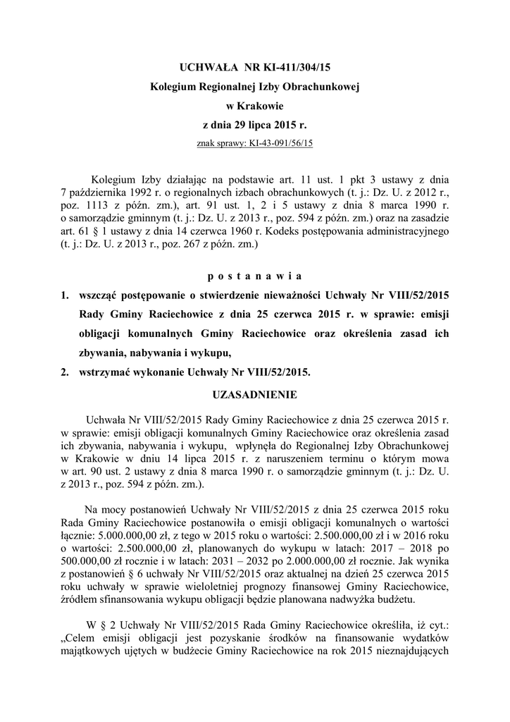 UCHWAŁA NR KI-411/304/15 Kolegium Regionalnej Izby Obrachunkowej w Krakowie z dnia 29 lipca 2015 r. znak sprawy: KI-43-091/56/15 Kolegium Izby działając na podstawie art. 11 ust. 1 pkt 3 ustawy z dnia 7 października 1992 r. o regionalnych izbach obrachunkowych (t. j.: Dz. U. z 2012 r., poz. 1113 z późn. zm.), art. 91 ust. 1, 2 i 5 ustawy z dnia 8 marca 1990 r. o samorządzie gminnym (t. j.: Dz. U. z 2013 r., poz. 594 z późn. zm.) oraz na zasadzie art. 61 § 1 ustawy z dnia 14 czerwca 1960 r. Kodeks postępowania administracyjnego (t. j.: Dz. U. z 2013 r., poz. 267 z późn. zm.) p os t a na wi a 1. wszcząć postępowanie o stwierdzenie nieważności Uchwały Nr VIII/52/2015 Rady Gminy Raciechowice z dnia 25 czerwca 2015 r. w sprawie: emisji obligacji komunalnych Gminy Raciechowice oraz określenia zasad ich zbywania, nabywania i wykupu, 2. wstrzymać wykonanie Uchwały Nr VIII/52/2015. UZASADNIENIE Uchwała Nr VIII/52/2015 Rady Gminy Raciechowice z dnia 25 czerwca 2015 r. w sprawie: emisji obligacji komunalnych Gminy Raciechowice oraz określenia zasad ich zbywania, nabywania i wykupu, wpłynęła do Regionalnej Izby Obrachunkowej w Krakowie w dniu 14 lipca 2015 r. z naruszeniem terminu o którym mowa w art. 90 ust. 2 ustawy z dnia 8 marca 1990 r. o samorządzie gminnym (t. j.: Dz. U. z 2013 r., poz. 594 z późn. zm.). Na mocy postanowień Uchwały Nr VIII/52/2015 z dnia 25 czerwca 2015 roku Rada Gminy Raciechowice postanowiła o emisji obligacji komunalnych o wartości łącznie: 5.000.000,00 zł, z tego w 2015 roku o wartości: 2.500.000,00 zł i w 2016 roku o wartości: 2.500.000,00 zł, planowanych do wykupu w latach: 2017 – 2018 po 500.000,00 zł rocznie i w latach: 2031 – 2032 po 2.000.000,00 zł rocznie. Jak wynika z postanowień § 6 uchwały Nr VIII/52/2015 oraz aktualnej na dzień 25 czerwca 2015 roku uchwały w sprawie wieloletniej prognozy finansowej Gminy Raciechowice, źródłem sfinansowania wykupu obligacji będzie planowana nadwyżka budżetu. W § 2 Uchwały Nr VIII/52/2015 Rada Gminy Raciechowice określiła, iż cyt.: „Celem emisji obligacji jest pozyskanie środków na finansowanie wydatków majątkowych ujętych w budżecie Gminy Raciechowice na rok 2015 nieznajdujących pokrycia w dochodach, w szczególności na rozbudowę sieci wodociągów i kanalizacji, budowę obiektów sportowych i rekreacyjnych oraz spłatę wcześniej zaciągniętych zobowiązań z tytułu zaciągniętych pożyczek i kredytów”. Kolegium Izby mając na względzie postanowienia art. 89 ust. 1 ustawy z dnia 27 sierpnia 2009 roku o finansach publicznych (t. j.: Dz. U. z 2013 r. poz. 885 z późn. zm.), planowany aktualnie deficyt budżetu Gminy Raciechowice na 2015 rok oraz kwoty rozchodów w latach: 2015 – 2016 stwierdziło, że Rada Gminy Raciechowice nie określiła na jaki cel planuje emisję obligacji o wartości: 1.001.124,00 zł. Po zapoznaniu się ze sprawozdaniami z wykonania budżetów Gminy Raciechowice za lata: 2011 – 2014 i I półrocze 2015 roku (o których mowa w art. 41 ustawy o finansach publicznych) oraz wynikami kontroli kompleksowej Gminy Raciechowice przeprowadzonej w okresie od dnia 7 stycznia 2015 r. do dnia 13 marca 2015 r. przez inspektorów Regionalnej Izby Obrachunkowej w Krakowie Kolegium Izby ustaliło, że zmieniona przez Radę Gminy Raciechowice na sesji w dniu 25 czerwca 2015 roku wieloletnia prognoza finansowa Gminy Raciechowice (aktualnie na lata 2015 – 2032) nie spełnia wymogu realistyczności, o której mowa w art. 226 ust. 1 ustawy o finansach publicznych, w tym w zakresie planowanych kwot dochodów i wydatków bieżących oraz wyników budżetu po roku 2015. Prognozowane dochody bieżące są zawyżone w stosunku do faktycznych możliwości Gminy Raciechowice, a wydatki bieżące zaniżone w stosunku do faktycznych potrzeb Gminy Raciechowice - co nie znajduje również uzasadnienia w objaśnieniach przyjętych wartości, tym bardziej że w latach 2015 – 2018 Gmina Raciechowice planuje z wydatków bieżących spłacić zadłużenie w parabankach (należności główne), tj. w 2015 roku: 2.327.912,03 zł, w 2016 roku: 1.745.933,99 zł, w 2017 roku: 1.163.955,95 zł i w 2018 roku: 581.977,91 zł. W 2013 i 2014 roku Wójt Gminy Raciechowice prowadził gospodarkę finansową Gminy Raciechowice z naruszeniem przepisów art. 211 ust. 4 i art. 11 ust. 1 ustawy o finansach publicznych oraz zaciągał zobowiązania dłużne bez upoważnienia i bez stosowania ustawy z dnia 29 stycznia 2004 roku Prawo zamówień publicznych (t. j.: Dz. U. z 2013 r., poz. 907 z późn. zm.), zawierając między innymi: a) w dniu 18 stycznia 2013 roku z Firmą „Magellan” S. A. z siedzibą w Łodzi Umowę NR 281/2013 o restrukturyzację zadłużenia i przejecie długu, na mocy której Firma „Magellan” S. A. zobowiązała się spłacić zadłużenie Gminy Raciechowice w wysokości łącznie: 1.197.421,58 zł wobec wierzycieli wymienionych w Załącznikach nr 1 i nr 2 do umowy (w tym między innymi: listy płac Urzędu Gminy Raciechowice i Gminnego Zespołu Ekonomiczno – Administracyjnego Szkół, deklaracje Urzędu Skarbowego i Zakładu Ubezpieczeń Społecznych, zobowiązania z tytułu: remontów dróg, dostaw oleju opałowego i energii elektrycznej, usług pocztowych, opracowania ewidencji zabytków, dowozu uczniów do szkół i zimowego utrzymania dróg). Zgodnie z postanowieniami porozumienia Nr 3783/2013 w sprawie restrukturyzacji zobowiązań Gmina Raciechowice zobowiązała się spłacić Firmie „Magellan” S. A. kwotę: 1.197.421,58 zł w terminie do dnia 31 grudnia 2013 roku wraz z odsetkami w wysokości: 68.594,45 zł i prowizją w wysokości: 17.961,32 zł; b) w dniu 28 marca 2014 roku z Firmą „Magellan” S. A. z siedzibą w Łodzi Umowę Pożyczki Konsolidacyjnej (z naruszeniem postanowień art. 211 ust. 4 oraz art. 89 i art. 91 ustawy o finansach publicznych), na mocy której Firma „Magellan” S. A. zobowiązała się udzielić Gm