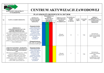 POWIATOWY URZĄD PRACY W WEJHEROWIE CENTRUM AKTYWIZACJI ZAWODOWEJ PLAN SZKOLEŃ GRUPOWYCH NA 2017 ROK Lp. NAZWA I ZAKRES SZKOLENIA PRZEWIDYWANY TERMIN ROZPOCZĘCIA SZKOLENIA MINIMALNE WYMAGANIA DLA UCZESTNIKÓW SZKOLENIA I 1. 2. SPRZEDAWCA - KURS PRZYGOTOWUJĄCY DO ZAWODU SPRZEDAWCY Z CERTYFIKATEM ECDL BASE (Aktywizacja zawodowa, prawo pracy, techniki sprzedaży i obsługi klienta, dokumentacja handlowo - magazynowa, porządkowanie hali sprzedaży, towarowanie sklepu, obsługa kasy fiskalnej i terminalu płatniczego, minimum sanitarne, podstawy pracy z komputerem, podstawy pracy w sieci, przetwarzanie tekstów, arkusze kalkulacyjne) KURS MAGAZYNOWO – HANDLOWY Z OBSŁUGĄ WÓZKÓW JEZDNIOWYCH PODNOŚNIKOWYCH Z EGZAMINEM UDT (Aktywizacja zawodowa, prawo pracy, obsługa programu SUBIEKT, dokumentacja magazynowa, fakturowanie, typy wózków jezdniowych, czynności operatora przy obsłudze i pracy wózka, wiadomości z zakresu ładunkoznawstwa, zagadnienia z zakresu BHP, zajęcia praktyczne) Wymagania formalne: osoby, którym został ustalony II profil pomocy i opracowany IPD*, dopuszcza się udział w szkoleniu osób z ustalonym I profilem pomocy i opracowanym IPD* tylko w uzasadnionych przypadkach KWARTAŁ II III ORIENTACYJNY CZAS TRWANIA SZKOLEŃ W GODZINACH PLANOWANA LICZBA OSÓB W GRUPIE ILOŚĆ GRUP EGZAMIN ZEW. RODZAJ DOKUMENTU POTWIERDZAJĄCEGO UKOŃCZENIE SZKOLENIA 10 3 TAK Zaświadczenie o ukończeniu szkolenia MEN, certyfikat ECDL BASE 5 3 IV 300 godz. zegarowych Wymagania konieczne: osoby, które nie posiadają wykształcenia handlowego Wymagania formalne: osoby, którym został ustalony II profil pomocy i opracowany IPD*, dopuszcza się udział w szkoleniu osób z ustalonym I profilem pomocy i opracowanym IPD* tylko w uzasadnionych przypadkach 200 godz. zegarowych TAK Zaświadczenie o ukończeniu szkolenia MEN, Zaświadczenie kwalifikacyjne Urzędu Dozoru Technicznego OPIEKUN OSÓB STARSZYCH Z KWALIFIKOWANĄ PIERWSZĄ POMOCĄ PRZEDMEDYCZNĄ 3. 4. (Aktywizacja zawodowa, prawo pracy, fizjologia i anatomia człowieka, psychologiczne uwarunkowania pracy z osobami starszymi, zasady opieki nad osobami starszymi, żywienie oraz pielęgnacja, zasady udzielania pierwszej pomocy, ochrona zdrowia, pomoc społeczna, kwalifikowana pierwsza pomoc przedmedyczna) KUCHARZ – POMOC KUCHARZA Z KWALIFIKOWANĄ PIERWSZĄ POMOCĄ PRZEDMEDYCZNĄ (Aktywizacja zawodowa, prawo pracy, bhp, przygotowanie stanowiska pracy, czynności porządkowe, przechowywanie surowców i przygotowanie do obróbki wstępnej jaj, ryb, jarzyn, drobiu i dzikiego ptactwa, mięsa zwierząt rzeźnych i dziczyzny, podrobów, przygotowanie surówek, sałatek, potraw mlecznych, potraw z kaszy, potraw z mąki, potraw z jaj, obróbka termiczna produktów, jarzyn, sporządzenie zup i dodatków do zup, kwalifikowana pierwsza pomoc przedmedyczna) Wymagania formalne: osoby, którym został ustalony II profil pomocy i opracowany IPD*, dopuszcza się udział w szkoleniu osób z ustalonym I profilem pomocy i opracowanym IPD* tylko w uzasadnionych przypadkach Wymagania formalne: osoby, którym został ustalony II profil pomocy i opracowany IPD*, dopuszcza się udział w szkoleniu osób z ustalonym I profilem pomocy i opracowanym IPD* tylko w uzasadnionych przypadkach 220 godz. zegarowych 320 godzin zegarowych 5 1 TAK Zaświadczenie o ukończeniu szkolenia MEN, certyfikat nadający tytuł Ratownika. 5 1 TAK Zaświadczenie o ukończeniu szkolenia MEN, certyfikat nadający tytuł Ratownika. 5. 6. KWALIFIKOWANY PRACOWNIK OCHRONY FIZYCZNEJ Z KWALIFIKOWANĄ PIERWSZĄ POMOCĄ PRZEDMEDYCZNĄ (Aktywizacja zawodowa, prawo pracy, blok ogólnoprawny, zagadnienia dot. ochrony osób i mienia, wyszkolenia strzeleckiego, samoobrony i technik interwencyjnych, kwalifikowana pierwsza pomoc przedmedyczna) PRACOWNIK BUDOWLANY KOMPLEKSOWE WYKAŃCZANIE WNĘTRZ Z UPRAWNIENIAMI ELEKTROENERGATYCZNYMI W GR. I DO 1 kV - EKSPLOATACJA (Aktywizacja zawodowa, prawo pracy, materiałoznawstwo, montaż płyt kartonowo – gipsowych, prace murarskie, tynkowanie, malowanie, zasady BHP i ppoż , dokumentacja budowlana, wykonanie, wykańczanie i konserwacja posadzek, spoinowanie, aranżacja wnętrz, podstawy elektrotechniki, ochrona przeciwporażeniowa w urządzeniach elektroenergetycznych, warunki techniczne budowy urządzeń elektrycznych, eksploatacja, przepisy i zasady eksploatacji linii do 1 kV, zasady organizacji pracy, zasady ratowania porażonych prądem elektrycznym oraz wytyczne dot. udzielania pierwszej pomocy przedlekarskiej, ochrona przeciwpożarowa, wiadomości z zakresu pomiarów) Wymagania formalne: osoby, którym został ustalony II profil pomocy i opracowany IPD*, dopuszcza się udział w szkoleniu osób z ustalonym I profilem pomocy i opracowanym IPD* tylko w uzasadnionych przypadkach Wymagania konieczne: osoby, które ukończyły 21 lat i posiadają wykształcenie co najmniej gimnazjalne oraz pełną zdolność do czynności prawnych, które nie były skazane prawomocnym wyrokiem za przestępstwa popełnione umyślnie i nie toczy się przeciwko nim postępowanie karne o takie przestępstwa Wymagania formalne: osoby, którym został ustalony II profil pomocy i opracowany IPD*, dopuszcza się udział w szkoleniu osób z ustalonym I profilem pomocy i opracowanym IPD* tylko w uzasadnionych przypadkach 350 godzin zegarowych 5 1 TAK Zaświadczenie o ukończeniu szkolenia MEN, certyfikat nadający tytuł Ratownika 350 godzin zegarowych 5 2 TAK Zaświadczenie o ukończeniu szkolenia MEN, świadectwo kwalifikacyjne. 7. 8. KADRY I PŁACE Z OBSŁUGĄ PROGRAMU SYMFONIA ORAZ PŁATNIK Z CERTYFIKATEM ECDL BASE (Aktywizacja zawodowa, prawo pracy, wynagrodzenia, urlopy, zwolnienia, świadczenia z tytułu niezdolności do pracy, obsługa programu SYMFONIA, PŁATNIK podstawy pracy z komputerem, podstawy pracy w sieci, przetwarzanie tekstów, arkusze kalkulacyjne) SPAWANIE BLACH I RUR SPOINAMI PACHWINOWYMI ORAZ BLACH SPOINAMI CZOŁOWYMI METODĄ MAG 136 Z EGZAMINEM DNV - GL (Akty