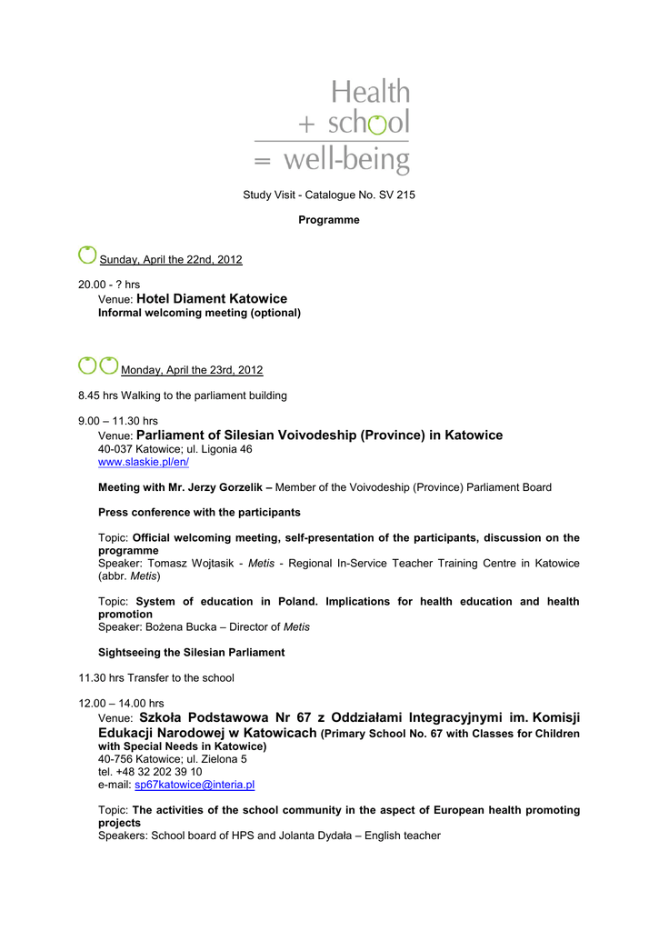 Study Visit - Catalogue No. SV 215 Programme Sunday, April the 22nd, 2012 20.00 - ? hrs Venue: Hotel Diament Katowice Informal welcoming meeting (optional) Monday, April the 23rd, 2012 8.45 hrs Walking to the parliament building 9.00 – 11.30 hrs Venue: Parliament of Silesian 40-037 Katowice; ul. Ligonia 46 www.slaskie.pl/en/ Voivodeship (Province) in Katowice Meeting with Mr. Jerzy Gorzelik – Member of the Voivodeship (Province) Parliament Board Press conference with the participants Topic: Official welcoming meeting, self-presentation of the participants, discussion on the programme Speaker: Tomasz Wojtasik - Metis - Regional In-Service Teacher Training Centre in Katowice (abbr. Metis) Topic: System of education in Poland. Implications for health education and health promotion Speaker: Bożena Bucka – Director of Metis Sightseeing the Silesian Parliament 11.30 hrs Transfer to the school 12.00 – 14.00 hrs Venue: Szkoła Podstawowa Nr 67 z Oddziałami Integracyjnymi im. Komisji Edukacji Narodowej w Katowicach (Primary School No. 67 with Classes for Children with Special Needs in Katowice) 40-756 Katowice; ul. Zielona 5 tel. +48 32 202 39 10 e-mail: [email protected] Topic: The activities of the school community in the aspect of European health promoting projects Speakers: School board of HPS and Jolanta Dydała – English teacher 14.15 hrs Transfer to the Centre 14.30 – 17.00 hrs Regionalny Ośrodek Metodyczno – Edukacyjny Metis w Katowicach (Metis - Regional In-Service Teacher Training Centre in Katowice) 40-530 Katowice; ul. Drozdów 21 tel. +48 32 209 53 12 e-mail: [email protected] www.metis.pl 14.30 – 15.00 hrs Lunch (offered by Metis) 15.00 – 17.00 hrs Topic: Short presentation of main activities of Metis Speaker: Bożena Bucka – Director of Metis Topic: Health education and health promotion in Polish schools Speaker: Katarzyna Stępniak – National Coordinator of HPS (Health Promoting Schools) – National Centre for Education Development in Warsaw Topic: Silesian Network of Health Promoting Schools – introduction to the project Speaker: Tomasz Wojtasik - Metis 17.15 hrs Transfer to the hotel 17.30 – 18.30 hrs Venue: Hotel Diament Katowice Group meeting, working on group report Tuesday, April the 24th, 2012 9.00 hrs Transfer to Tychy 9.30 – 10.00 hrs Venue: Przedszkole Nr 8 Zielony Kindergarten/Preschool No. 8 in Tychy) 43-100 Tychy; ul. Wojska Polskiego 2 tel.: +48 32 227 38 92 email: [email protected] www.przedszkole8tychy.edupage.org Ogród w Tychach (Green Garden Short visit. Just to have a look and… tranfer to the school 10.00 – 12.30 hrs Venue: Zespół Szkół Nr 6 w Schools No.6 in Tychy) 43-100 Tychy; Al. Piłsudskiego 10 tel. +48 32 217 00 91 email: [email protected] www.zs6.tychy.pl/ Tychach (Complex/Unit of Upper Secondary Vocational Topic: The integration of preschool children and students of vocational school to promote physical and mental health Speakers: Przedszkole Nr 8 w Tychach: Elżbieta Mrowiec, Ewa Bogacka, Janina Halama Zespół Szkół Nr 6 w Tychach: Adam Burczyk, Agnieszka Betleja, Ewelina Sosin, Mariusz Aniszewski 12.30 – 13.00 hrs Lunch (offered by school) 13.00 hrs Transfer to the school 13.15 – 15.45 hrs Venue: II Liceum Ogólnokształcące z Oddziałami Integracyjnymi im. Cypriana Kamila Norwida w Tychach (Norwid High School/Upper Secondary School No. II in Tychy) 43-100 Tychy; ul. C.K. Norwida 40 tel. +48 32 227 41 65; 32 227 31 39 email: [email protected] www.norwid.tychy.pl Topic: Supportive role of the school in adolescence and students’ growing Speakers: Michał Glenszczyk, Paulina Jaworska 15.45 hrs Transfer to the City Council 16.00 – 16.30 hrs Venue: Urząd Miasta Tychy (Tychy City Council) 43-100 Tychy; al. Niepodległości 49 Meeting with Mrs Daria Szczepańska – Vice Mayor of the City 16.30 hrs Transfer to the hotel 17.00 – 18.00 hrs Venue: Hotel Diament Katowice Group meeting, working on group report Wednesday, April the 25th, 2012 8.30 hrs Transfer to Marklowice 9.30 – 12.00 hrs Venue: Przedszkole Publiczne in Marklowice) 44-321 Marklowice; ul. Widokowa 2 tel. + 48 725 996 385 email: [email protected] http://ppmarklowice.edupage.org/ w Marklowicach (Kindergarten/Preschool Topic: On the side of nature – discovering nature and self as condition of healthy life style in healthy environment Speakers: Ilona Ledwoń, Klaudia Pyszny 12.00 hrs Transfer to Rybnik 12.30 – 14.30 hrs Venue: Szkoła Podstawowa Nr 15 im. Księdza Prałata Konrada w Rybniku (Primary School No.15 in Rybnik) * * School awarded the National Certificate of Health Promoting School!!! 44-207 Rybnik; ul. Św. Maksymiliana 26 Szwedy Tel. +48 32 425 14 53 email: [email protected] www.rybnik.pl Topic: To fully live, you need to be healthy. Health education programmes implemented in our school Speakers: Alicja Bartkowiak, Adrianna Czech, Marcelina Hajduk, Joanna Nowak, Anna Kubecka oraz Małgorzata Grafowska Meeting with Mrs. Joanna Kryszczyszyn – Vice Mayor of the City Lunch (offered by school) 14.45 hrs Transfer to school 15.00 – 17.00 hrs Venue: Zespół Szkół Budowlanych in Rybnik) 44-200 Rybnik; ul. Świerklańska 42 Telefon: 32 422 22 79 email: [email protected] www.rybnik.pl/zsbrybnik/ w Rybniku (Complex/Unit of Vocational Schools Topic: Complex of Building Constuction Schools - build your health with us Speakers: Katarzyna Wróbel, Gabriela Gurgul, Sławomir Walento 17.00 hrs Transfer to the hotel 18.00 – 19.00 hrs Venue: Hotel Diament Katowice Group meeting, working on group report Thursday, April the 26th, 2012 8.30 hrs Transfer to Sosnowiec 9.00 – 12.00 hrs Przedszkole Miejskie Nr 29 w Sosnowcu (Kindergarten/Preschool No. 29 in Sosnowiec) 41-200 Sosnowiec; ul. Hallera 3 tel. +48 32 291 48 55 email: [email protected] www.przedszkole29.edupage.org Topic: How to develop pro-health attitudes and care for mental health among preschool children –wide frame of health education outcomes at preschool Speakers: Małgorza