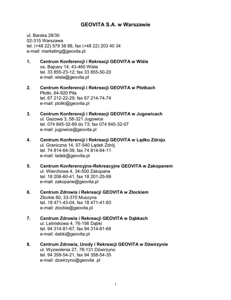 GEOVITA S.A. w Warszawie ul. Barska 28/30 02-315 Warszawa tel. (+48 22) 579 38 88, fax (+48 22) 203 40 34 e-mail: [email protected] 1. Centrum Konferencji i Rekreacji GEOVITA w Wiśle os. Bajcary 14, 43-460 Wisła tel. 33 855-23-12; fax 33 855-50-20 e-mail: [email protected] 2. Centrum Konferencji i Rekreacji GEOVITA w Płotkach Płotki, 64-920 Piła tel. 67 212-22-29; fax 67 214-74-74 e-mail: [email protected] 3. Centrum Konferencji i Rekreacji GEOVITA w Jugowicach ul. Gazowa 3, 58-321 Jugowice tel. 074 845-32-69 do 73; fax 074 845-32-07 e-mail: [email protected] 4. Centrum Konferencji i Rekreacji GEOVITA w Lądku Zdroju ul. Graniczna 14, 57-540 Lądek Zdrój tel. 74 814-64-39, fax 74 814-64-11 e-mail: [email protected] 5. Centrum Konferencyjno-Rekreacyjne GEOVITA w Zakopanem ul. Wierchowa 4, 34-500 Zakopane tel. 18 206-60-41, fax 18 201-25-99 e-mail: [email protected] 6. Centrum Zdrowia i Rekreacji GEOVITA w Złockiem Złockie 80, 33-370 Muszyna tel. 18 471-43-04, fax 18 471-41-83 e-mail: [email protected] 7. Centrum Zdrowia i Rekreacji GEOVITA w Dąbkach ul. Letniskowa 4, 76-156 Dąbki tel. 94 314-81-67, fax 94 314-81-68 e-mail: [email protected] 8. Centrum Zdrowia, Urody i Rekreacji GEOVITA w Dźwirzynie ul. Wyzwolenia 27, 78-131 Dźwirzyno tel. 94 358-54-21, fax 94 358-54-35 e-mail: dzwirzyno@geovita .pl 1 9. Centrum Zdrowia, Urody i Rekreacji GEOVITA w Mrzeżynie ul. Pocztowa 4, 72-330 Mrzeżyno tel. 91 386-62-72, fax 91 386-62-76 e-mail: [email protected] 10. Centrum Zdrowia, Urody i Rekreacji GEOVITA w Krynicy – Zdroju ul. Leśna 15, 33-380 Krynica-Zdrój tel. 18 471-04-00, fax 18 471-04-99 e-mail: [email protected] 11. Centrum Szkoleń i Konferencji GEOVITA w Jadwisinie ul. Ogrodowa 31, 05-140 Serock tel. 22 782-74-74, fax 022 782-63-48 e-mail: [email protected] 12. Geovita sp. z o.o., HOTEL ORIENT**** i *** w Krakowie Recepcja: tel.: 12 646 91 00 Rezerwacja: tel.: 12 646 92 22 e-mail: [email protected] www.hotelorient.pl 13. Hotel Bukowy Dworek**** tel./fax (+48 68) 341 20 88 (recepcja) tel. kom. + 48 502 609 451 e-mail: [email protected] 14. Hotel Perła Bieszczadów*** Centrum Konferencyjno - Rekreacyjne tel. (+48 13) 461 61 61 (recepcja) tel. (+48 13) 461 61 50 (recepcja SPA) fax (+48 13) 461 61 63 e-mail: [email protected] e-mail: [email protected] 2