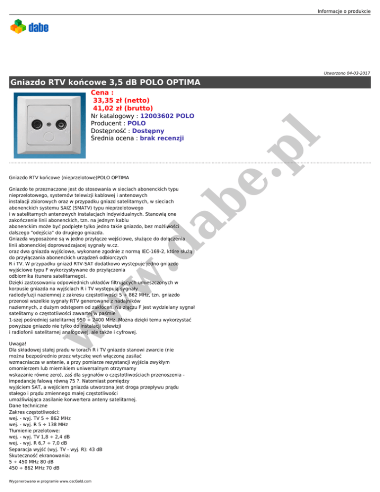 Informacje o produkcie Utworzono 04-03-2017 Gniazdo RTV końcowe 3,5 dB POLO OPTIMA Gniazdo RTV końcowe (nieprzelotowe)POLO OPTIMA w w w .d ab Gniazdo te przeznaczone jest do stosowania w sieciach abonenckich typu nieprzelotowego, systemów telewizji kablowej i antenowych instalacji zbiorowych oraz w przypadku gniazd satelitarnych, w sieciach abonenckich systemu SAIZ (SMATV) typu nieprzelotowego i w satelitarnych antenowych instalacjach indywidualnych. Stanowią one zakończenie linii abonenckich, tzn. na jednym kablu abonenckim może być podpięte tylko jedno takie gniazdo, bez możliwości dalszego "odejścia" do drugiego gniazda. Gniazda wyposażone są w jedno przyłącze wejściowe, służące do dołączenia linii abonenckiej doprowadzajacej sygnały w.cz. oraz dwa gniazda wyjściowe, wykonane zgodnie z normą IEC-169-2, które służą do przyłączania abonenckich urządzeń odbiorczych R i TV. W przypadku gniazd RTV-SAT dodatkowo występuje jedno gniazdo wyjściowe typu F wykorzystywane do przyłączenia odbiornika (tunera satelitarnego). Dzięki zastosowaniu odpowiednich układów filtrujących umieszczonych w korpusie gniazda na wyjściach R i TV występują sygnały radiodyfuzji naziemnej z zakresu częstotliwości 5 ÷ 862 MHz, tzn. gniazdo przenosi wszelkie sygnały RTV generowane z nadajników naziemnych, z dużym odstępem od zakłóceń. Na złączu F jest wydzielany sygnał satelitarny o częstotliwości zawartej w paśmie 1-szej pośredniej satelitarnej 950 ÷ 2400 MHz. Można dzięki temu wykorzystać powyższe gniazdo nie tylko do instalacji telewizji i radiofonii satelitarnej analogowej, ale także i cyfrowej. e. Nr katalogowy : 12003602 POLO Producent : POLO Dostępność : Dostępny Średnia ocena : brak recenzji pl Cena : 33,35 zł (netto) 41,02 zł (brutto) Uwaga! Dla składowej stałej pradu w torach R i TV gniazdo stanowi zwarcie (nie można bezpośrednio przez wtyczkę weń włączoną zasilać wzmacniacza w antenie, a przy pomiarze rezystancji wyjścia zwykłym omomierzem lub miernikiem uniwersalnym otrzymamy wskazanie równe zero), zaś dla sygnałów o częstotliwościach przenoszenia impedancję falową równą 75 ?. Natomiast pomiędzy wyjściem SAT, a wejściem gniazda utworzona jest droga przepływu prądu stałego i prądu zmiennego małej częstotliwości umożliwiająca zasilanie konwertera anteny satelitarnej. Dane techniczne Zakres częstotliwości: wej. - wyj. TV 5 ÷ 862 MHz wej. - wyj. R 5 ÷ 138 MHz Tłumienie przelotowe: wej. - wyj. TV 1,8 ÷ 2,4 dB wej. - wyj. R 6,7 ÷ 7,0 dB Separacja wyjść (wyj. TV - wyj. R): 43 dB Skuteczność ekranowania: 5 ÷ 450 MHz 80 dB 450 ÷ 862 MHz 70 dB Wygenerowano w programie www.oscGold.com w w w .d ab e. pl Impedacja charakterystyczna: 75 ? Złącza współosiowe: wyj. TV wtyk IEC wyj. R gniazdo IEC Ramkę należy zamawiać oddzielnie