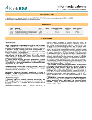 Informacja dzienna Nr 117 (1630) – 18 czerwca 2009, czwartek Scenariusz na dziś • Spodziewamy sie˛ dziś zamkniecia ˛ kursów EUR/PLN i USD/PLN na poziomach odpowiednio 4.5100 i 3.2200. • Oczekujemy stabilizacji rentowności krajowej pieciolatki. ˛ Kalendarium Godz. 9:30 14:00 14:00 14:00 Wskaźnik Kraj Decyzja SBN Szwajcaria Dynamika wynagrodzeń w przedsiebiorstwach Polska Dynamika zatrudnienia w przedsiebiorstwach. ˛ Polska Minutes z posiedzenia RPP w maju Polska Okres V V Oczekiwania rynkowe 0.25% 5,0% r/r -1,7% r/r Poprzednio 0.25% 4,8% r/r -1,4% r/r Nasza prognoza 0.25% 5,5% r/r -1,7% r/r Z perspektywy kwiecień okazały sie˛ lepsze od naszych oczekiwań, które i tak były nieco powyżej consensusu prognoz rynkowych. Dobry odczyt należy zawdzieczać ˛ przed wszystkim oczekiwanym nadwyżkom: na saldzie transferów bieżacych ˛ oraz na saldzie usług, ale także nieoczekiwanej nadwyżce na saldzie obrotów handlowych. Pomimo nadal silnego spadku eksportu (o 29,8% r/r liczac ˛ w EUR), podobnie jak w poprzednich miesiacach ˛ import skurczył sie˛ jeszcze bardziej (aż o 37,0% r/r liczac ˛ w EUR). Zatem dane za kwiecień wskazuja, ˛ że w drugim kwartale br. również możemy liczyć na dodatnia˛ kontrybucje˛ eksportu netto do wzrostu gospodarczego podobnie jak to miało miejsce w pierwszym kwartale. Zgodnie z oczekiwaniami pogłebiło ˛ sie˛ ujemne saldo dochodów, co wynika z wypłaty dywidend. Cieszy natomiast odnotowany w kwietniu napływ inwestycji portfelowych netto (ponad 1 mld EUR), w szczególności w krajowe papiery skarbowe, czy też wzrost aktywów rezerwowych (blisko 2 mld EUR). • członek RPP Andrzej Wojtyna powiedział: „Nastawienie w polityce pienieżnej ˛ powinno być raczej neutralne. Optymizm w ostatnim czasie powrócił. Może sie˛ zbliżać moment, w którym trzeba bedzie ˛ stopy podnosić.” Powtórzył także, że stopy sa˛ w pobliżu optymalnego poziomu. Powiedział jednak, że gdyby Rada wiedziała, że rzad ˛ zamierza poprosić najwiekszy ˛ w kraju bank, kontrolowany przez skarb państwa PKO BP SA o wypłate˛ dywidendy, być może nie zdecydowałaby sie˛ na ciecie ˛ stopy rezerw. • Wiceminister Finansów E. Suchocka-Roguska powiedziała: „Nie przewidujemy ruchów podatkowych. Pewnie bedziemy ˛ musieli podnieść deficyt, ale jeszcze nie wiemy do jakiego poziomu.” Dodała, że ostateczne decyzje w sprawie nowelizacji zostana˛ podjete ˛ 7 lipca. Rynki bazowe: Stany Zjednoczone: Dynamika inflacji CPI w maju wyniosła -1,3% r/r i 0,1% m/m, wobec -0,7% r/r 0,0% m/m w poprzednim miesiacu. ˛ Oczekiwano odczytu na poziomie -0,9% r/r i 0,3% m/m. • Dynamika inflacji bazowej CPI w maju wyniosła 1,8% r/r i 0,1% m/m, wobec 1,9% r/r 0,3% m/m w poprzednim miesiacu. ˛ Oodczyt był zgodny z oczekiwaniami. • Deficyt bilansu obrotów bieżacych ˛ w pierwszym kwartale 2009 wyniósł 101,5 mld USD, wobec deficytu na poziomie 132,8 mld USD w poprzednim kwartale. Oczekiwano deficytu na poziomie 85,0 mld USD. • • Deficyt bilansu obrotów bieżacych ˛ w pierwszym kwartale 2009 wyniósł 101,5 mld USD, wobec deficytu na poziomie 132,8 mld USD w poprzednim kwartale. Oczekiwano deficytu na poziomie 85,0 mld USD. Wielka Brytania: Bezrobocie w kwietniu wyniosło 7,2% wobec oczekiwań na odczyt na poziomie 7,3%. W poprzednim miesiacu ˛ zanotowano odczyt na poziomie 7,1%. Szwajcaria: Dynamika sprzedaży detalicznej wyniosła w kwietniu 1,2% r/r. W poprzednim miesiacy ˛ zanotowano odczyt również na poziomie 1,2% r/r. Rynki wschodzace: ˛ • Nadwyżka w bilansie obrotów bieżacych ˛ wyniosła 171 mln EUR w maju. W poprzednim miesiacu ˛ zanotowano nadwyżk˛e na poziomie 75 mln EUR. Oczekiwano odczytu na poziomie 69-100 mln EUR. Komentarz:Opublikowane dane o bilansie płatniczym za 1 Informacja dzienna Nr 117 (1630) – 18 czerwca 2009, czwartek Analizy makroekonomiczne Mieszkania oddane do użytkowania w maju 2009 r. W maju 2009 r. oddano do użytkowania 10 153 mieszkań, czyli wiecej ˛ o 4,4% r/r oraz mniej o 15,7% m/m. Rys. Mieszkania oddane do użytkowania • W relacji r/r zwiekszyła ˛ sie˛ o 6,6% liczba nowych mieszkań przeznaczonych na sprzedaż lub wynajem oraz indywidualnych o 5,0%. Spadła natomiast roczna dynamika liczby nowych mieszkań spółdzielczych o 2,7% oraz pozostałych o 13,4% . • W okresie I- V 2009 r. oddano do użytkowania łacznie ˛ 63 659 mieszkań, czyli o 8,2% wiecej ˛ w relacji r/r. Przeznaczonych na sprzedaż badź ˛ wynajem oddano wiecej ˛ o 22,3% (łacznie ˛ 29 557), pozostałych o 6,4% (łacznie ˛ 2 471). W relacji rocznej spadła natomiast liczba mieszkań indywidualnych o 0,9% (łacznie ˛ 28 874) oraz spółdzielczych o 14,9% (łacznie ˛ 2 757). • W okresie I- V 2009 r spadła o 31,3% r/r liczba mieszkań, których budowe˛ rozpocz˛eto. Wśród tej kategorii najbardziej, bo o 53,3% r/r spadła liczba rozpocz˛etych mieszkań przeznaczonych na sprzedaż lub wynajem. W okresie tym odnotowano również spadek o 18,5% r/r liczby wydanych pozwoleń, wydano mniej o 9,8% r/r pozwoleń na budowe˛ mieszkań indywidualnych i o 27,2% r/r przeznaczonych na sprzedaż lub wynajem. Komentarz: W maju br. odnotowano istotne wyhamowanie dynamiki liczby nowych mieszkań oddawanych do użytkowania. Zmiany te dotycza˛ zarówno budownictwa indywidualnego jak również lokali budowanych na sprzedaż lub wynajem. W obliczu niewielkiego popytu, rosnacej ˛ nadpodaży lokali ukończonych a niesprzedanych oraz ograniczonych możliwościach kredytowania inwestycji, deweloperzy wstrzymuja˛ realizacje˛ nowych projektów. Szacujemy, że zjawisko to bedzie ˛ kontynuowane i utrzyma sie˛ w 2010 r. Ograniczenie skali może być jeszcze wieksze ˛ z uwagi na narastajac ˛ a˛ różnice˛ miedzy liczba˛ mieszkań, na których budowe˛ wydano pozwolenia i których budowe˛ rozpocz˛eto. Kluczowe znaczenie dla ponownego wzrostu inwestycji deweloperskich bedzie ˛ miała skala prowadzonej akcji kredytowej za