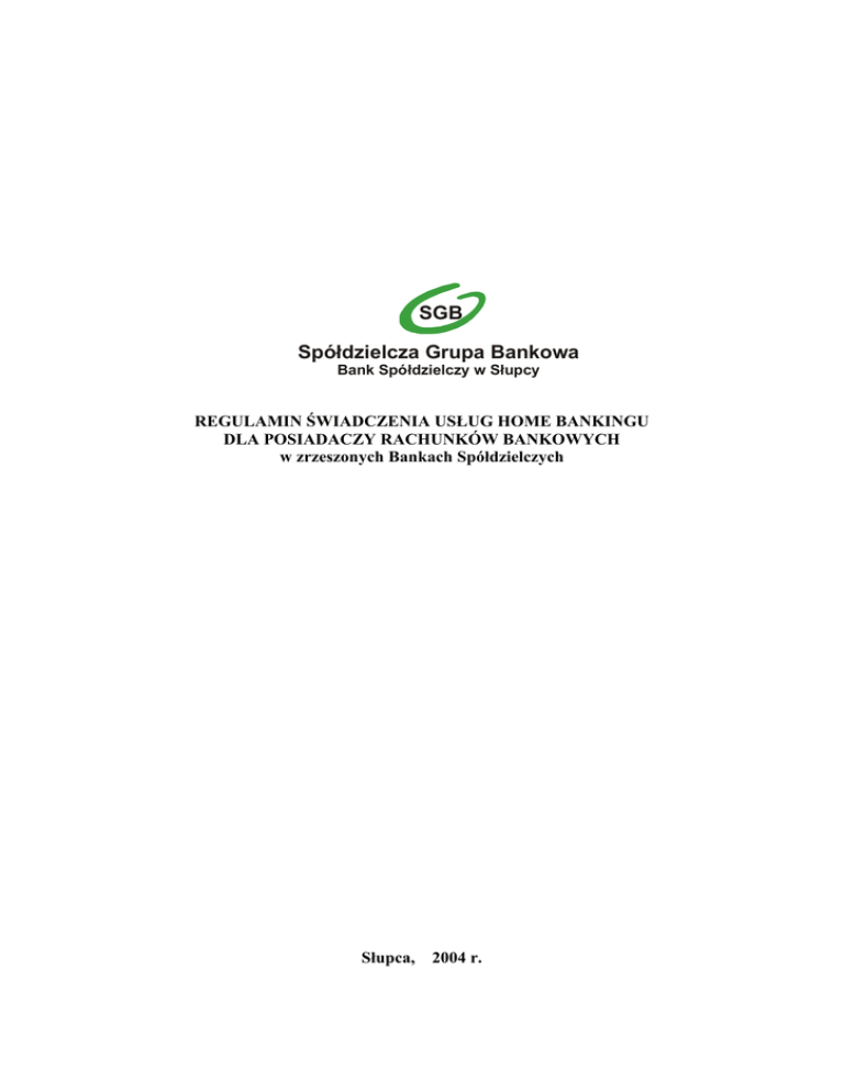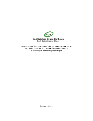 SGB Spółdzielcza Grupa Bankowa Bank Spółdzielczy w Słupcy REGULAMIN ŚWIADCZENIA USŁUG HOME BANKINGU DLA POSIADACZY RACHUNKÓW BANKOWYCH w zrzeszonych Bankach Spółdzielczych Słupca, 2004 r. SPIS TREŚCI Postanowienia ogólne..........................................................................................................................3 ZłoŜenie Wniosku i zawarcie Umowy .................................................................................................4 Udostępnienie usług. ...........................................................................................................................4 Dysponowanie rachunkiem za pośrednictwem Systemu....................................................................4 Informacje o saldach i operacjach .....................................................................................................6 Opłaty i prowizje ..................................................................................................................................6 Zakres odpowiedzialności....................................................................................................................7 BieŜąca eksploatacja i nadzór nad pracą Systemu.............................................................................9 Zawieszenie, rozwiązanie Umowy.......................................................................................................9 Postanowienia końcowe ....................................................................................................................10 Postanowienia ogólne §1 Niniejszy „Regulamin świadczenia usług home bankingu dla Posiadaczy rachunków bankowych w zrzeszonych Bankach Spółdzielczych” określa szczegółowe zasady świadczenia usług bankowych w zakresie elektronicznego instrumentu płatniczego – home bankingu dla Klientów Banków Spółdzielczych. §2 Przez uŜyte w niniejszym Regulaminie określenia naleŜy rozumieć: 1) Bank – zrzeszony Bank Spółdzielczy, 2) Oddział – placówka operacyjna Banku. 3) Dni robocze - wszystkie dni od poniedziałku do piątku z wyłączeniem dni ustawowo wolnych od pracy. 4) Dostawca Systemu – firma komputerowa, dostawca systemu home bankingu dla Banku, 5) Kwota dostępna – saldo bieŜące rachunku powiększone o nie wykorzystany kredyt w rachunku. 6) Licencjonowany terminal - stanowisko komputerowe w siedzibie Posiadacza, z oprogramowaniem home bankingu zainstalowanym przez osoby upowaŜnione przez Bank. 7) Posiadacz (Klient) - osoby fizyczne, przedsiębiorcy (podmioty prowadzące działalność gospodarczą) będący osobami prawnymi bądź osobami fizycznymi, a takŜe jednostkami organizacyjnymi nie posiadającymi osobowości prawnej utworzonymi zgodnie z przepisami prawa oraz osoby nie będące przedsiębiorcami, a w szczególności jednostki i zakłady budŜetowe, samorządy terytorialne, organizacje społeczne, polityczne, zawodowe, fundacje, stowarzyszenia oraz rolnicy - zawierający Umowę o usługę Home Bankingu. 8) Prawo bankowe – Ustawa z dnia 29 sierpnia 1997r. Prawo bankowe (Dz.U.Nr 140, poz. 939 ze zm.) 9) Rachunek - rachunek bankowy prowadzony przez Bank dla podmiotów, o których mowa w pkt.7. 10) Regulamin - Regulamin świadczenia usług home bankingu dla Posiadaczy rachunków bankowych w zrzeszonych Bankach Spółdzielczych, 11) Status dewizowy- rezydent lub nierezydent w rozumieniu przepisów prawa dewizowego. 12) System (home banking) – elektroniczny system zdalnej obsługi bankowej dla Posiadaczy rachunków bankowych w Banku, 13) Środki dostępu i elementy zabezpieczeń: nośnika z kluczem autoryzacyjnym oraz programem. 14) Taryfa – Taryfa prowizji i opłat obowiązująca w Banku. 15) Umowa Rachunku - umowa rachunku bankowego, 16) Umowa – umowa o usługę Home Bankingu 17) UpowaŜniona osoba osoba upowaŜniona przez Posiadacza do autoryzacji/podpisywania)* zleceń za pośrednictwem Systemu 18) Ustawa - Ustawa z dnia 12 września 2002 roku o elektronicznych instrumentach płatniczych (Dz. U. 02.169.1385 z dnia 11.10.2002 r.), 19) Zlecenie, Operacja – polecenie przelewu na podstawie dyspozycji Klienta za pośrednictwem Systemu. * niepotrzebne skreślić ZłoŜenie Wniosku i zawarcie Umowy §3 1. Klient zainteresowany udostępnieniem usługi home bankingu składa Wniosek w Oddziale prowadzącym jego Rachunek. 2. Podstawą zawarcia Umowy jest dostarczenie prawidłowo wypełnionego Wniosku oraz podjęcie pozytywnej decyzji przez Bank. §4 1. Bank podejmuje decyzję o udostępnieniu usługi home bankingu, nie później niŜ w terminie 7 dni roboczych od daty otrzymania kompletnego Wniosku. 2. Bank moŜe odmówić udostępnienia usługi home bankingu, o czym poinformuje podmiot składający Wniosek w terminie 7 dni roboczych od daty otrzymania Wniosku. §5 1. Zawarcie Umowy następuje z chwilą podpisania Umowy przez Klienta oraz Oddział. 2. Podpisanie Umowy przez Klienta następuje w obecności pracownika Banku, bądź osoby do tego upowaŜnionej. 3. W ramach zawartej Umowy Posiadacz upowaŜnia określone osoby do składania dyspozycji i zleceń płatniczych za pośrednictwem Systemu. 4. Podpisując Umowę, Posiadacz zgadza się na wszelkie formy kontaktu z Bankiem w formie elektronicznej, jako wiąŜące pod względem prawnym, o ile dokonana została właściwa weryfikacja podmiotu jako uprawnionego do składania danych oświadczeń woli. Udostępnienie usług. §6 1. Po udostępnieniu usługi za pośrednictwem Systemu zainstalowanego na licencjonowanym terminalu, z wykorzystaniem publicznej sieci telekomunikacyjnej Posiadacz ma moŜliwość w szczególności do: 1) uzyskiwania informacji dotyczących jego rachunku oraz 2) zlecania wykonania operacji na jego rachunkach. 2. Termin udostępnienia usług określonych w ust. 1 warunkowany jest zapewnieniem przez Posiadacza warunków technicznych (sprzęt, łączność) do instalacji Systemu po stronie Posiadacza. Dysponowani