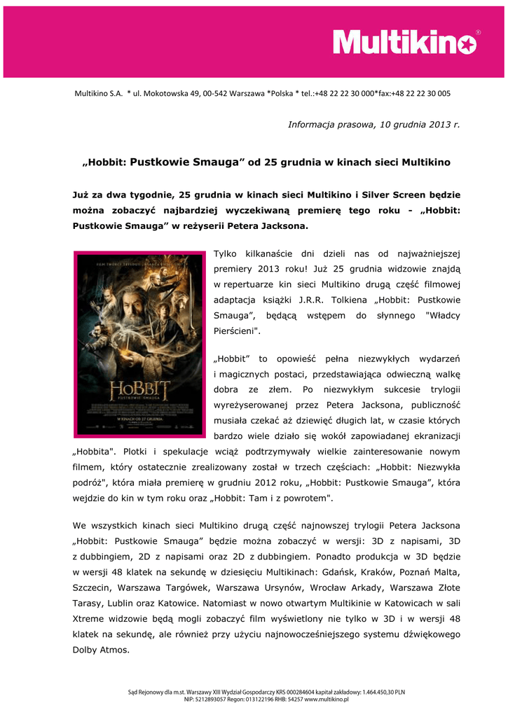 Multikino S.A. * ul. Mokotowska 49, 00-542 Warszawa *Polska * tel.:+48 22 22 30 000*fax:+48 22 22 30 005 Informacja prasowa, 10 grudnia 2013 r. „Hobbit: Pustkowie Smauga” od 25 grudnia w kinach sieci Multikino Już za dwa tygodnie, 25 grudnia w kinach sieci Multikino i Silver Screen będzie można zobaczyć najbardziej wyczekiwaną premierę tego roku - „Hobbit: Pustkowie Smauga” w reżyserii Petera Jacksona. Tylko kilkanaście dni dzieli nas od najważniejszej premiery 2013 roku! Już 25 grudnia widzowie znajdą w repertuarze kin sieci Multikino drugą część filmowej adaptacja książki J.R.R. Tolkiena „Hobbit: Pustkowie Smauga”, będącą wstępem do słynnego "Władcy Pierścieni". „Hobbit” to opowieść pełna niezwykłych wydarzeń i magicznych postaci, przedstawiająca odwieczną walkę dobra ze złem. Po niezwykłym sukcesie trylogii wyreżyserowanej przez Petera Jacksona, publiczność musiała czekać aż dziewięć długich lat, w czasie których bardzo wiele działo się wokół zapowiadanej ekranizacji „Hobbita". Plotki i spekulacje wciąż podtrzymywały wielkie zainteresowanie nowym filmem, który ostatecznie zrealizowany został w trzech częściach: „Hobbit: Niezwykła podróż", która miała premierę w grudniu 2012 roku, „Hobbit: Pustkowie Smauga”, która wejdzie do kin w tym roku oraz „Hobbit: Tam i z powrotem". We wszystkich kinach sieci Multikino drugą część najnowszej trylogii Petera Jacksona „Hobbit: Pustkowie Smauga” będzie można zobaczyć w wersji: 3D z napisami, 3D z dubbingiem, 2D z napisami oraz 2D z dubbingiem. Ponadto produkcja w 3D będzie w wersji 48 klatek na sekundę w dziesięciu Multikinach: Gdańsk, Kraków, Poznań Malta, Szczecin, Warszawa Targówek, Warszawa Ursynów, Wrocław Arkady, Warszawa Złote Tarasy, Lublin oraz Katowice. Natomiast w nowo otwartym Multikinie w Katowicach w sali Xtreme widzowie będą mogli zobaczyć film wyświetlony nie tylko w 3D i w wersji 48 klatek na sekundę, ale również przy użyciu najnowocześniejszego systemu dźwiękowego Dolby Atmos. Bilety na pierwsze pokazy filmu „Hobbit: Pustkowie Smauga” będzie można już niedługo nabyć w kinach sieci Multikino oraz przez stronę www.multikino.pl. O filmie „Hobbit: Pustkowie Smauga” Reżyseria: Peter Jackson Scenariusz: Guillermo del Toro, Peter Jackson, Fran Walsh, Philippa Boyens Obsada: Ian McKellen - Gandalf Szary Martin Freeman - Bilbo Baggins Andy Serkis - Gollum Hugo Weaving - Elrond Richard Armitage - Thorin Dębowa Tarcza Aidan Turner - Kíli Graham McTavish - Dwalin John Callen - Óin *** Informacje o spółce Multikino: Multikino jest pierwszym operatorem, który w 1998 roku uruchomił w Polsce kino wieloekranowe (multipleks). Od tego czasu Multikino wyznacza najwyższe standardy w budowie i prowadzeniu kin. Grupa prowadzi działalność w segmencie kinowym i dystrybucji filmów. Multikino jest operatorem 30 kin w 24 miastach Polski z łączną liczbą 243 ekranów i 52 220 miejscami. W sierpniu 2007 r. Multikino otworzyło wyjątkowe kino w centrum handlowym Złote Tarasy w Warszawie. Obiekt składa się z 8 nowoczesnych sal, w tym Sali Premierowej na 777 osób, wyposażonej w projektory cyfrowe Barco DP 4K, fenomenalny system dźwięku Martin Audio i największy w Europie ekran przystosowany do projekcji cyfrowej (prawie 300 m2). W sierpniu 2010 roku Grupa otworzyła pierwsze kino za granicą w Rydze (8 ekranów i 1620 miejsc), a we wrześniu w Wilnie (7 ekranów i 1547 miejsca). Multikino to więcej niż kino! To największe premiery filmowe oraz koncerty, maratony, transmisje sportowe, Opery HD, Kino na obcasach, Multibabykino i wiele więcej. Multikino to także oryginalna sieć kawiarni Cavablanca Cinema Cafe. Od lat Multikino jest partnerem najważniejszych festiwali filmowych w Polsce w tym Festiwalu Polskich Filmów Fabularnych w Gdyni, Camerimage i Warszawskiego Festiwalu Filmowego. Multikino jest w gronie światowych liderów kinowej cyfryzacji, dzięki wyposażeniu sal kinowych w projektory firmy BARCO i systemy do projekcji trójwymiarowej Dolby 3D. Sieć z powodzeniem prezentuje w technologii 3D: filmy, koncerty, wydarzenia sportowe, opery oraz balet. Multikino jest liderem cyfryzacji w Europie czyli technologicznego i jakościowego przełomu w branży kinowej. Kontakt dla mediów: Natalia Kaleta-Nguyen, Specjalista ds. PR w spółce Multikino tel.: +48 519 520 984 e-mail: [email protected]