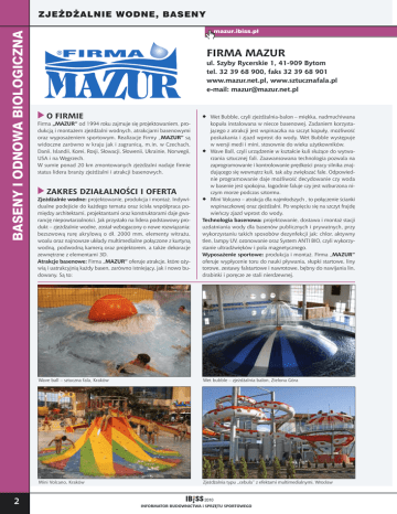 BASENY I ODNOWA BIOLOGICZNA ZJEŻDŻALNIE WODNE, BASENY 2 mazur.ibiss.pl Firma maZUr ul. Szyby Rycerskie 1, 41-909 Bytom tel. 32 39 68 900, faks 32 39 68 901 www.mazur.net.pl, www.sztucznafala.pl e-mail: [email protected] U O FIRMIE ¶ Zjeżdżalnie wodne: projektowanie, produkcja i montaż. Indywidualne podejście do każdego tematu oraz ścisła współpraca pomiędzy architektami, projektantami oraz konstruktorami daje gwarancję niepowtarzalności. Jak przystało na lidera podstawowy produkt – zjeżdżalnie wodne, został wzbogacony o nowe rozwiązania: bezszwową rurę akrylową o dł. 2000 mm, elementy witrażu, woalu oraz najnowsze układy multimedialne połączone z kurtyną wodną, podwodną kamerą oraz projektorem, a także dekoracje zewnętrzne z elementami 3D. Atrakcje basenowe: Firma „MAZUR” oferuje atrakcje, które ożywią i uatrakcyjnią każdy basen, zarówno istniejący, jak i nowo budowany. Są to: Wet Bubble, czyli zjeżdżalnia-balon – miękka, nadmuchiwana kopuła instalowana w niecce basenowej. Zadaniem korzystającego z atrakcji jest wspinaczka na szczyt kopuły, możliwość poskakania i zjazd wprost do wody. Wet Bubble występuje w wersji medi i mini, stosownie do wieku użytkowników. ¶ Wave Ball, czyli urządzenie w kształcie kuli służące do wytwarzania sztucznej fali. Zaawansowana technologia pozwala na zaprogramowanie i kontrolowanie prędkości pracy silnika znajdującego się wewnątrz kuli, tak aby zwiększać fale. Odpowiednie programowanie daje możliwość decydowanie czy woda w basenie jest spokojna, łagodnie faluje czy jest wzburzona niczym morze podczas sztormu. ¶ Mini Volcano – atrakcja dla najmłodszych , to połączenie ścianki wspinaczkowej oraz zjeżdżalni. Po wspięciu się na szczyt frajdę wieńczy zjazd wprost do wody. Technologia basenowa: projektowanie, dostawa i montaż stacji uzdatniania wody dla basenów publicznych i prywatnych, przy wykorzystaniu takich sposobów dezynfekcji jak: chlor, aktywny tlen, lampy UV, ozonowanie oraz System ANTI BIO, czyli wykorzystanie ultradźwięków i pola magnetycznego. Wyposażenie sportowe: produkcja i montaż. Firma „MAZUR” oferuje wypłycenie toru do nauki pływania, słupki startowe, liny torowe, zestawy falstartowe i nawrotowe, bębny do nawijania lin, drabinki i poręcze ze stali nierdzewnej. Wave ball – sztuczna fala, Kraków Wet bubble – zjeżdżalnia balon, Zielona Góra Mini Volcano, Kraków Zjeżdżalnia typu „cebula” z efektami multimedialnymi, Wrocław Firma „MAZUR” od 1994 roku zajmuje się projektowaniem, produkcją i montażem zjeżdżalni wodnych, atrakcjami basenowymi oraz wyposażeniem sportowym. Realizacje Firmy „MAZUR” są widoczne zarówno w kraju jak i zagranicą, m.in. w Czechach, Danii, Islandii, Korei, Rosji, Słowacji, Słowenii, Ukrainie, Norwegii, USA i na Węgrzech. W sumie ponad 20 km zmontowanych zjeżdżalni nadaje firmie status lidera branży zjeżdżalni i atrakcji basenowych. U ZAkRES DZIAŁAlNOœCI I OFERTA 2010 INFORMATOR BUDOWNICTWA i SPRZÊTU SPORTOWEGO